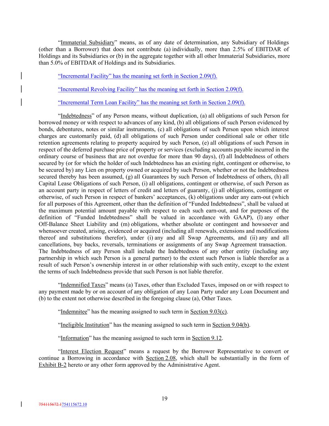 “Immaterial Subsidiary” means, as of any date of determination, any Subsidiary of Holdings (other than a Borrower) that does not contribute (a) individually, more than 2.5% of EBITDAR of Holdings and its Subsidiaries or (b) in the aggregate together with all other Immaterial Subsidiaries, more than 5.0% of EBITDAR of Holdings and its Subsidiaries. “Incremental Facility” has the meaning set forth in Section 2.09(f). “Incremental Revolving Facility” has the meaning set forth in Section 2.09(f). “Incremental Term Loan Facility” has the meaning set forth in Section 2.09(f). “Indebtedness” of any Person means, without duplication, (a) all obligations of such Person for borrowed money or with respect to advances of any kind, (b) all obligations of such Person evidenced by bonds, debentures, notes or similar instruments, (c) all obligations of such Person upon which interest charges are customarily paid, (d) all obligations of such Person under conditional sale or other title retention agreements relating to property acquired by such Person, (e) all obligations of such Person in respect of the deferred purchase price of property or services (excluding accounts payable incurred in the ordinary course of business that are not overdue for more than 90 days), (f) all Indebtedness of others secured by (or for which the holder of such Indebtedness has an existing right, contingent or otherwise, to be secured by) any Lien on property owned or acquired by such Person, whether or not the Indebtedness secured thereby has been assumed, (g) all Guarantees by such Person of Indebtedness of others, (h) all Capital Lease Obligations of such Person, (i) all obligations, contingent or otherwise, of such Person as an account party in respect of letters of credit and letters of guaranty, (j) all obligations, contingent or otherwise, of such Person in respect of bankers’ acceptances, (k) obligations under any earn-out (which for all purposes of this Agreement, other than the definition of “Funded Indebtedness”, shall be valued at the maximum potential amount payable with respect to each such earn-out, and for purposes of the definition of “Funded Indebtedness” shall be valued in accordance with GAAP), (l) any other Off-Balance Sheet Liability and (m) obligations, whether absolute or contingent and howsoever and whensoever created, arising, evidenced or acquired (including all renewals, extensions and modifications thereof and substitutions therefor), under (i) any and all Swap Agreements, and (ii) any and all cancellations, buy backs, reversals, terminations or assignments of any Swap Agreement transaction. The Indebtedness of any Person shall include the Indebtedness of any other entity (including any partnership in which such Person is a general partner) to the extent such Person is liable therefor as a result of such Person’s ownership interest in or other relationship with such entity, except to the extent the terms of such Indebtedness provide that such Person is not liable therefor. “Indemnified Taxes” means (a) Taxes, other than Excluded Taxes, imposed on or with respect to any payment made by or on account of any obligation of any Loan Party under any Loan Document and (b) to the extent not otherwise described in the foregoing clause (a), Other Taxes. “Indemnitee” has the meaning assigned to such term in Section 9.03(c). “Ineligible Institution” has the meaning assigned to such term in Section 9.04(b). “Information” has the meaning assigned to such term in Section 9.12. “Interest Election Request” means a request by the Borrower Representative to convert or continue a Borrowing in accordance with Section 2.08, which shall be substantially in the form of Exhibit B-2 hereto or any other form approved by the Administrative Agent. 19 754115672.1754115672.10
