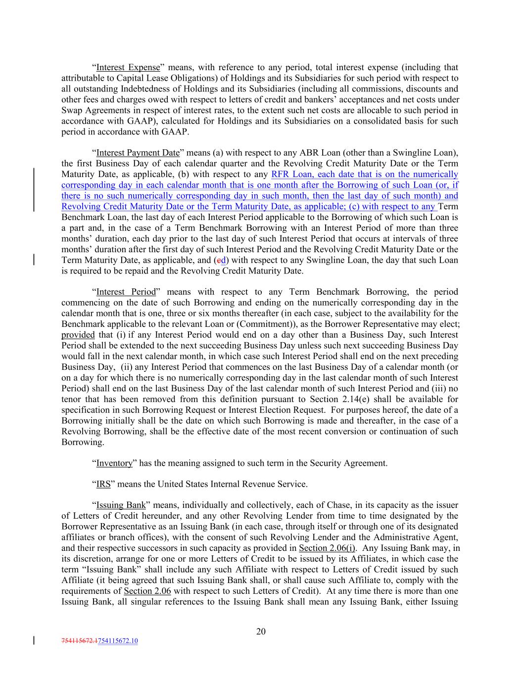 “Interest Expense” means, with reference to any period, total interest expense (including that attributable to Capital Lease Obligations) of Holdings and its Subsidiaries for such period with respect to all outstanding Indebtedness of Holdings and its Subsidiaries (including all commissions, discounts and other fees and charges owed with respect to letters of credit and bankers’ acceptances and net costs under Swap Agreements in respect of interest rates, to the extent such net costs are allocable to such period in accordance with GAAP), calculated for Holdings and its Subsidiaries on a consolidated basis for such period in accordance with GAAP. “Interest Payment Date” means (a) with respect to any ABR Loan (other than a Swingline Loan), the first Business Day of each calendar quarter and the Revolving Credit Maturity Date or the Term Maturity Date, as applicable, (b) with respect to any RFR Loan, each date that is on the numerically corresponding day in each calendar month that is one month after the Borrowing of such Loan (or, if there is no such numerically corresponding day in such month, then the last day of such month) and Revolving Credit Maturity Date or the Term Maturity Date, as applicable; (c) with respect to any Term Benchmark Loan, the last day of each Interest Period applicable to the Borrowing of which such Loan is a part and, in the case of a Term Benchmark Borrowing with an Interest Period of more than three months’ duration, each day prior to the last day of such Interest Period that occurs at intervals of three months’ duration after the first day of such Interest Period and the Revolving Credit Maturity Date or the Term Maturity Date, as applicable, and (cd) with respect to any Swingline Loan, the day that such Loan is required to be repaid and the Revolving Credit Maturity Date. “Interest Period” means with respect to any Term Benchmark Borrowing, the period commencing on the date of such Borrowing and ending on the numerically corresponding day in the calendar month that is one, three or six months thereafter (in each case, subject to the availability for the Benchmark applicable to the relevant Loan or (Commitment)), as the Borrower Representative may elect; provided that (i) if any Interest Period would end on a day other than a Business Day, such Interest Period shall be extended to the next succeeding Business Day unless such next succeeding Business Day would fall in the next calendar month, in which case such Interest Period shall end on the next preceding Business Day, (ii) any Interest Period that commences on the last Business Day of a calendar month (or on a day for which there is no numerically corresponding day in the last calendar month of such Interest Period) shall end on the last Business Day of the last calendar month of such Interest Period and (iii) no tenor that has been removed from this definition pursuant to Section 2.14(e) shall be available for specification in such Borrowing Request or Interest Election Request. For purposes hereof, the date of a Borrowing initially shall be the date on which such Borrowing is made and thereafter, in the case of a Revolving Borrowing, shall be the effective date of the most recent conversion or continuation of such Borrowing. “Inventory” has the meaning assigned to such term in the Security Agreement. “IRS” means the United States Internal Revenue Service. “Issuing Bank” means, individually and collectively, each of Chase, in its capacity as the issuer of Letters of Credit hereunder, and any other Revolving Lender from time to time designated by the Borrower Representative as an Issuing Bank (in each case, through itself or through one of its designated affiliates or branch offices), with the consent of such Revolving Lender and the Administrative Agent, and their respective successors in such capacity as provided in Section 2.06(i). Any Issuing Bank may, in its discretion, arrange for one or more Letters of Credit to be issued by its Affiliates, in which case the term “Issuing Bank” shall include any such Affiliate with respect to Letters of Credit issued by such Affiliate (it being agreed that such Issuing Bank shall, or shall cause such Affiliate to, comply with the requirements of Section 2.06 with respect to such Letters of Credit). At any time there is more than one Issuing Bank, all singular references to the Issuing Bank shall mean any Issuing Bank, either Issuing 20 754115672.1754115672.10