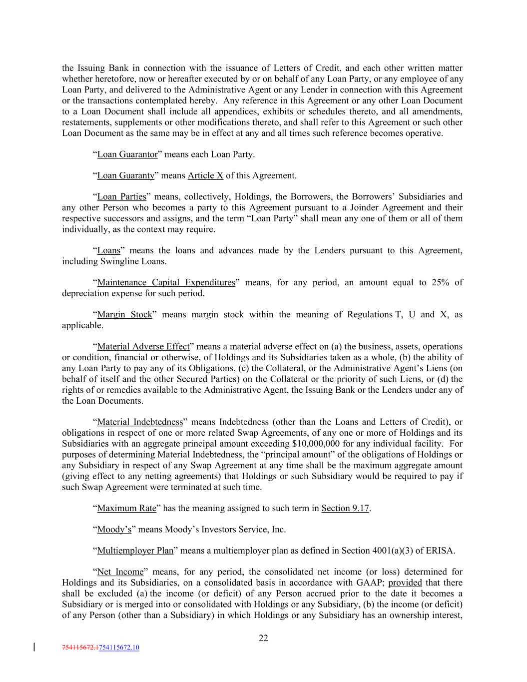the Issuing Bank in connection with the issuance of Letters of Credit, and each other written matter whether heretofore, now or hereafter executed by or on behalf of any Loan Party, or any employee of any Loan Party, and delivered to the Administrative Agent or any Lender in connection with this Agreement or the transactions contemplated hereby. Any reference in this Agreement or any other Loan Document to a Loan Document shall include all appendices, exhibits or schedules thereto, and all amendments, restatements, supplements or other modifications thereto, and shall refer to this Agreement or such other Loan Document as the same may be in effect at any and all times such reference becomes operative. “Loan Guarantor” means each Loan Party. “Loan Guaranty” means Article X of this Agreement. “Loan Parties” means, collectively, Holdings, the Borrowers, the Borrowers’ Subsidiaries and any other Person who becomes a party to this Agreement pursuant to a Joinder Agreement and their respective successors and assigns, and the term “Loan Party” shall mean any one of them or all of them individually, as the context may require. “Loans” means the loans and advances made by the Lenders pursuant to this Agreement, including Swingline Loans. “Maintenance Capital Expenditures” means, for any period, an amount equal to 25% of depreciation expense for such period. “Margin Stock” means margin stock within the meaning of Regulations T, U and X, as applicable. “Material Adverse Effect” means a material adverse effect on (a) the business, assets, operations or condition, financial or otherwise, of Holdings and its Subsidiaries taken as a whole, (b) the ability of any Loan Party to pay any of its Obligations, (c) the Collateral, or the Administrative Agent’s Liens (on behalf of itself and the other Secured Parties) on the Collateral or the priority of such Liens, or (d) the rights of or remedies available to the Administrative Agent, the Issuing Bank or the Lenders under any of the Loan Documents. “Material Indebtedness” means Indebtedness (other than the Loans and Letters of Credit), or obligations in respect of one or more related Swap Agreements, of any one or more of Holdings and its Subsidiaries with an aggregate principal amount exceeding $10,000,000 for any individual facility. For purposes of determining Material Indebtedness, the “principal amount” of the obligations of Holdings or any Subsidiary in respect of any Swap Agreement at any time shall be the maximum aggregate amount (giving effect to any netting agreements) that Holdings or such Subsidiary would be required to pay if such Swap Agreement were terminated at such time. “Maximum Rate” has the meaning assigned to such term in Section 9.17. “Moody’s” means Moody’s Investors Service, Inc. “Multiemployer Plan” means a multiemployer plan as defined in Section 4001(a)(3) of ERISA. “Net Income” means, for any period, the consolidated net income (or loss) determined for Holdings and its Subsidiaries, on a consolidated basis in accordance with GAAP; provided that there shall be excluded (a) the income (or deficit) of any Person accrued prior to the date it becomes a Subsidiary or is merged into or consolidated with Holdings or any Subsidiary, (b) the income (or deficit) of any Person (other than a Subsidiary) in which Holdings or any Subsidiary has an ownership interest, 22 754115672.1754115672.10