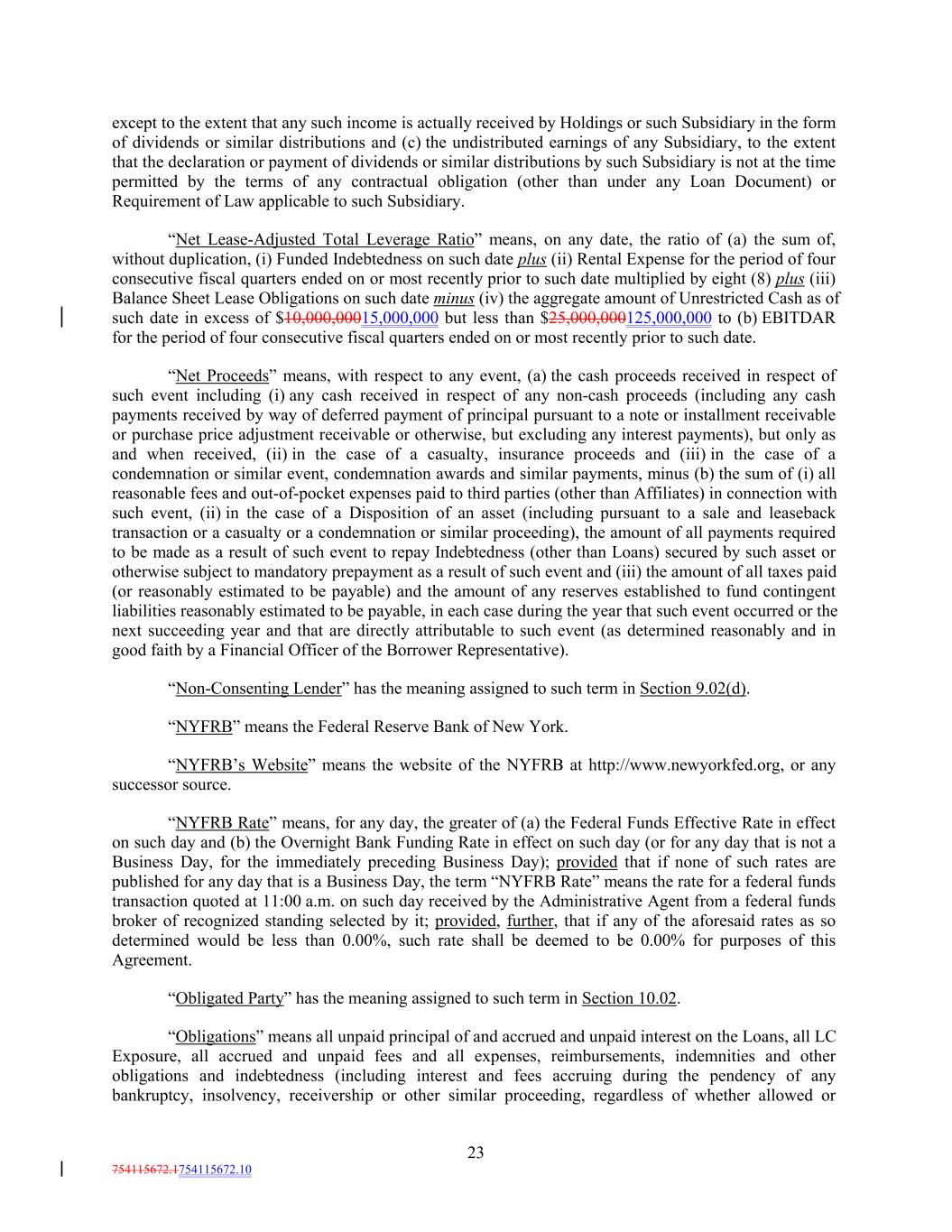 except to the extent that any such income is actually received by Holdings or such Subsidiary in the form of dividends or similar distributions and (c) the undistributed earnings of any Subsidiary, to the extent that the declaration or payment of dividends or similar distributions by such Subsidiary is not at the time permitted by the terms of any contractual obligation (other than under any Loan Document) or Requirement of Law applicable to such Subsidiary. “Net Lease-Adjusted Total Leverage Ratio” means, on any date, the ratio of (a) the sum of, without duplication, (i) Funded Indebtedness on such date plus (ii) Rental Expense for the period of four consecutive fiscal quarters ended on or most recently prior to such date multiplied by eight (8) plus (iii) Balance Sheet Lease Obligations on such date minus (iv) the aggregate amount of Unrestricted Cash as of such date in excess of $10,000,00015,000,000 but less than $25,000,000125,000,000 to (b) EBITDAR for the period of four consecutive fiscal quarters ended on or most recently prior to such date. “Net Proceeds” means, with respect to any event, (a) the cash proceeds received in respect of such event including (i) any cash received in respect of any non-cash proceeds (including any cash payments received by way of deferred payment of principal pursuant to a note or installment receivable or purchase price adjustment receivable or otherwise, but excluding any interest payments), but only as and when received, (ii) in the case of a casualty, insurance proceeds and (iii) in the case of a condemnation or similar event, condemnation awards and similar payments, minus (b) the sum of (i) all reasonable fees and out-of-pocket expenses paid to third parties (other than Affiliates) in connection with such event, (ii) in the case of a Disposition of an asset (including pursuant to a sale and leaseback transaction or a casualty or a condemnation or similar proceeding), the amount of all payments required to be made as a result of such event to repay Indebtedness (other than Loans) secured by such asset or otherwise subject to mandatory prepayment as a result of such event and (iii) the amount of all taxes paid (or reasonably estimated to be payable) and the amount of any reserves established to fund contingent liabilities reasonably estimated to be payable, in each case during the year that such event occurred or the next succeeding year and that are directly attributable to such event (as determined reasonably and in good faith by a Financial Officer of the Borrower Representative). “Non-Consenting Lender” has the meaning assigned to such term in Section 9.02(d). “NYFRB” means the Federal Reserve Bank of New York. “NYFRB’s Website” means the website of the NYFRB at http://www.newyorkfed.org, or any successor source. “NYFRB Rate” means, for any day, the greater of (a) the Federal Funds Effective Rate in effect on such day and (b) the Overnight Bank Funding Rate in effect on such day (or for any day that is not a Business Day, for the immediately preceding Business Day); provided that if none of such rates are published for any day that is a Business Day, the term “NYFRB Rate” means the rate for a federal funds transaction quoted at 11:00 a.m. on such day received by the Administrative Agent from a federal funds broker of recognized standing selected by it; provided, further, that if any of the aforesaid rates as so determined would be less than 0.00%, such rate shall be deemed to be 0.00% for purposes of this Agreement. “Obligated Party” has the meaning assigned to such term in Section 10.02. “Obligations” means all unpaid principal of and accrued and unpaid interest on the Loans, all LC Exposure, all accrued and unpaid fees and all expenses, reimbursements, indemnities and other obligations and indebtedness (including interest and fees accruing during the pendency of any bankruptcy, insolvency, receivership or other similar proceeding, regardless of whether allowed or 23 754115672.1754115672.10