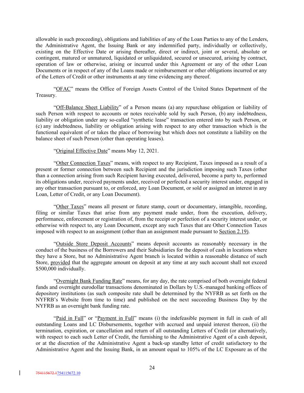 allowable in such proceeding), obligations and liabilities of any of the Loan Parties to any of the Lenders, the Administrative Agent, the Issuing Bank or any indemnified party, individually or collectively, existing on the Effective Date or arising thereafter, direct or indirect, joint or several, absolute or contingent, matured or unmatured, liquidated or unliquidated, secured or unsecured, arising by contract, operation of law or otherwise, arising or incurred under this Agreement or any of the other Loan Documents or in respect of any of the Loans made or reimbursement or other obligations incurred or any of the Letters of Credit or other instruments at any time evidencing any thereof. “OFAC” means the Office of Foreign Assets Control of the United States Department of the Treasury. “Off-Balance Sheet Liability” of a Person means (a) any repurchase obligation or liability of such Person with respect to accounts or notes receivable sold by such Person, (b) any indebtedness, liability or obligation under any so-called “synthetic lease” transaction entered into by such Person, or (c) any indebtedness, liability or obligation arising with respect to any other transaction which is the functional equivalent of or takes the place of borrowing but which does not constitute a liability on the balance sheet of such Person (other than operating leases). “Original Effective Date” means May 12, 2021. “Other Connection Taxes” means, with respect to any Recipient, Taxes imposed as a result of a present or former connection between such Recipient and the jurisdiction imposing such Taxes (other than a connection arising from such Recipient having executed, delivered, become a party to, performed its obligations under, received payments under, received or perfected a security interest under, engaged in any other transaction pursuant to, or enforced, any Loan Document, or sold or assigned an interest in any Loan, Letter of Credit, or any Loan Document). “Other Taxes” means all present or future stamp, court or documentary, intangible, recording, filing or similar Taxes that arise from any payment made under, from the execution, delivery, performance, enforcement or registration of, from the receipt or perfection of a security interest under, or otherwise with respect to, any Loan Document, except any such Taxes that are Other Connection Taxes imposed with respect to an assignment (other than an assignment made pursuant to Section 2.19). “Outside Store Deposit Accounts” means deposit accounts as reasonably necessary in the conduct of the business of the Borrowers and their Subsidiaries for the deposit of cash in locations where they have a Store, but no Administrative Agent branch is located within a reasonable distance of such Store, provided that the aggregate amount on deposit at any time at any such account shall not exceed $500,000 individually. “Overnight Bank Funding Rate” means, for any day, the rate comprised of both overnight federal funds and overnight eurodollar transactions denominated in Dollars by U.S.-managed banking offices of depository institutions (as such composite rate shall be determined by the NYFRB as set forth on the NYFRB’s Website from time to time) and published on the next succeeding Business Day by the NYFRB as an overnight bank funding rate. “Paid in Full” or “Payment in Full” means (i) the indefeasible payment in full in cash of all outstanding Loans and LC Disbursements, together with accrued and unpaid interest thereon, (ii) the termination, expiration, or cancellation and return of all outstanding Letters of Credit (or alternatively, with respect to each such Letter of Credit, the furnishing to the Administrative Agent of a cash deposit, or at the discretion of the Administrative Agent a back-up standby letter of credit satisfactory to the Administrative Agent and the Issuing Bank, in an amount equal to 105% of the LC Exposure as of the 24 754115672.1754115672.10