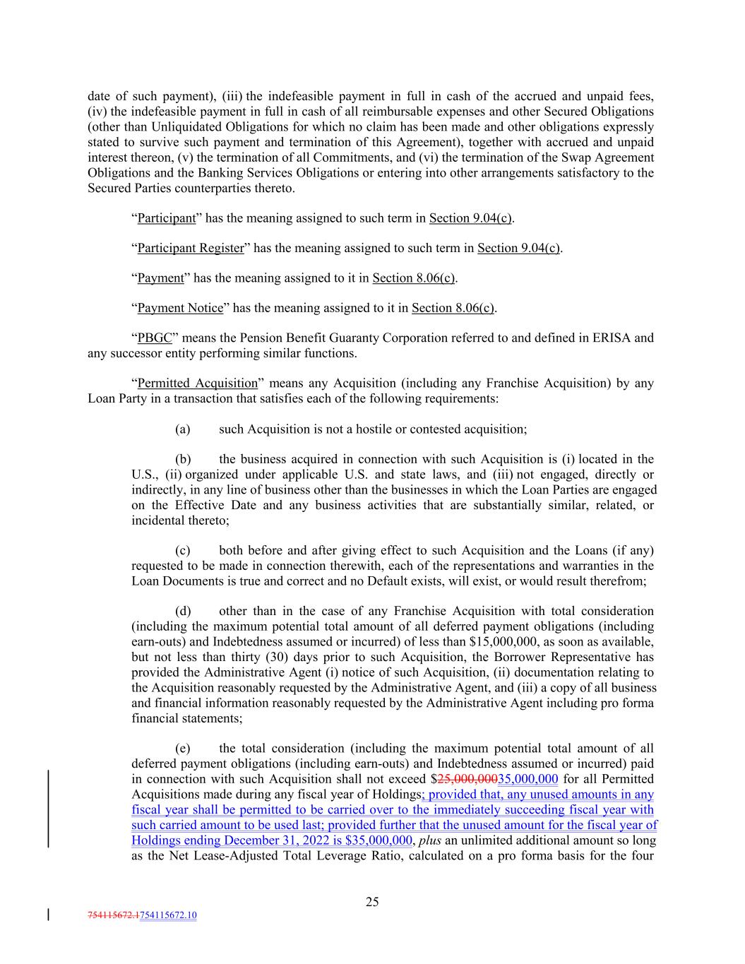 date of such payment), (iii) the indefeasible payment in full in cash of the accrued and unpaid fees, (iv) the indefeasible payment in full in cash of all reimbursable expenses and other Secured Obligations (other than Unliquidated Obligations for which no claim has been made and other obligations expressly stated to survive such payment and termination of this Agreement), together with accrued and unpaid interest thereon, (v) the termination of all Commitments, and (vi) the termination of the Swap Agreement Obligations and the Banking Services Obligations or entering into other arrangements satisfactory to the Secured Parties counterparties thereto. “Participant” has the meaning assigned to such term in Section 9.04(c). “Participant Register” has the meaning assigned to such term in Section 9.04(c). “Payment” has the meaning assigned to it in Section 8.06(c). “Payment Notice” has the meaning assigned to it in Section 8.06(c). “PBGC” means the Pension Benefit Guaranty Corporation referred to and defined in ERISA and any successor entity performing similar functions. “Permitted Acquisition” means any Acquisition (including any Franchise Acquisition) by any Loan Party in a transaction that satisfies each of the following requirements: (a) such Acquisition is not a hostile or contested acquisition; (b) the business acquired in connection with such Acquisition is (i) located in the U.S., (ii) organized under applicable U.S. and state laws, and (iii) not engaged, directly or indirectly, in any line of business other than the businesses in which the Loan Parties are engaged on the Effective Date and any business activities that are substantially similar, related, or incidental thereto; (c) both before and after giving effect to such Acquisition and the Loans (if any) requested to be made in connection therewith, each of the representations and warranties in the Loan Documents is true and correct and no Default exists, will exist, or would result therefrom; (d) other than in the case of any Franchise Acquisition with total consideration (including the maximum potential total amount of all deferred payment obligations (including earn-outs) and Indebtedness assumed or incurred) of less than $15,000,000, as soon as available, but not less than thirty (30) days prior to such Acquisition, the Borrower Representative has provided the Administrative Agent (i) notice of such Acquisition, (ii) documentation relating to the Acquisition reasonably requested by the Administrative Agent, and (iii) a copy of all business and financial information reasonably requested by the Administrative Agent including pro forma financial statements; (e) the total consideration (including the maximum potential total amount of all deferred payment obligations (including earn-outs) and Indebtedness assumed or incurred) paid in connection with such Acquisition shall not exceed $25,000,00035,000,000 for all Permitted Acquisitions made during any fiscal year of Holdings; provided that, any unused amounts in any fiscal year shall be permitted to be carried over to the immediately succeeding fiscal year with such carried amount to be used last; provided further that the unused amount for the fiscal year of Holdings ending December 31, 2022 is $35,000,000, plus an unlimited additional amount so long as the Net Lease-Adjusted Total Leverage Ratio, calculated on a pro forma basis for the four 25 754115672.1754115672.10
