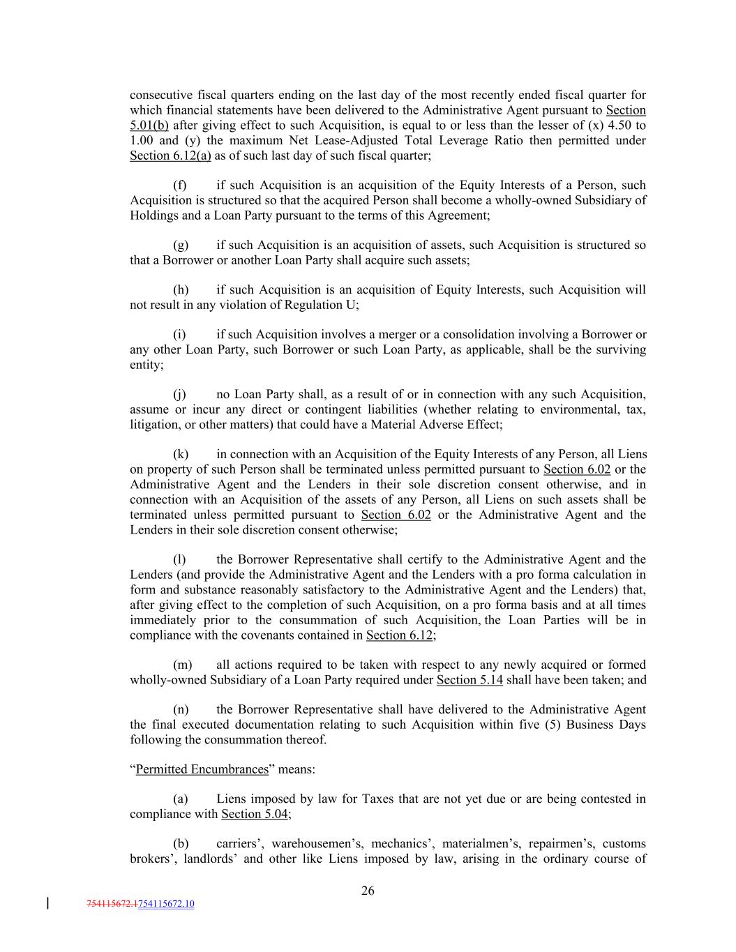 consecutive fiscal quarters ending on the last day of the most recently ended fiscal quarter for which financial statements have been delivered to the Administrative Agent pursuant to Section 5.01(b) after giving effect to such Acquisition, is equal to or less than the lesser of (x) 4.50 to 1.00 and (y) the maximum Net Lease-Adjusted Total Leverage Ratio then permitted under Section 6.12(a) as of such last day of such fiscal quarter; (f) if such Acquisition is an acquisition of the Equity Interests of a Person, such Acquisition is structured so that the acquired Person shall become a wholly-owned Subsidiary of Holdings and a Loan Party pursuant to the terms of this Agreement; (g) if such Acquisition is an acquisition of assets, such Acquisition is structured so that a Borrower or another Loan Party shall acquire such assets; (h) if such Acquisition is an acquisition of Equity Interests, such Acquisition will not result in any violation of Regulation U; (i) if such Acquisition involves a merger or a consolidation involving a Borrower or any other Loan Party, such Borrower or such Loan Party, as applicable, shall be the surviving entity; (j) no Loan Party shall, as a result of or in connection with any such Acquisition, assume or incur any direct or contingent liabilities (whether relating to environmental, tax, litigation, or other matters) that could have a Material Adverse Effect; (k) in connection with an Acquisition of the Equity Interests of any Person, all Liens on property of such Person shall be terminated unless permitted pursuant to Section 6.02 or the Administrative Agent and the Lenders in their sole discretion consent otherwise, and in connection with an Acquisition of the assets of any Person, all Liens on such assets shall be terminated unless permitted pursuant to Section 6.02 or the Administrative Agent and the Lenders in their sole discretion consent otherwise; (l) the Borrower Representative shall certify to the Administrative Agent and the Lenders (and provide the Administrative Agent and the Lenders with a pro forma calculation in form and substance reasonably satisfactory to the Administrative Agent and the Lenders) that, after giving effect to the completion of such Acquisition, on a pro forma basis and at all times immediately prior to the consummation of such Acquisition, the Loan Parties will be in compliance with the covenants contained in Section 6.12; (m) all actions required to be taken with respect to any newly acquired or formed wholly-owned Subsidiary of a Loan Party required under Section 5.14 shall have been taken; and (n) the Borrower Representative shall have delivered to the Administrative Agent the final executed documentation relating to such Acquisition within five (5) Business Days following the consummation thereof. “Permitted Encumbrances” means: (a) Liens imposed by law for Taxes that are not yet due or are being contested in compliance with Section 5.04; (b) carriers’, warehousemen’s, mechanics’, materialmen’s, repairmen’s, customs brokers’, landlords’ and other like Liens imposed by law, arising in the ordinary course of 26 754115672.1754115672.10