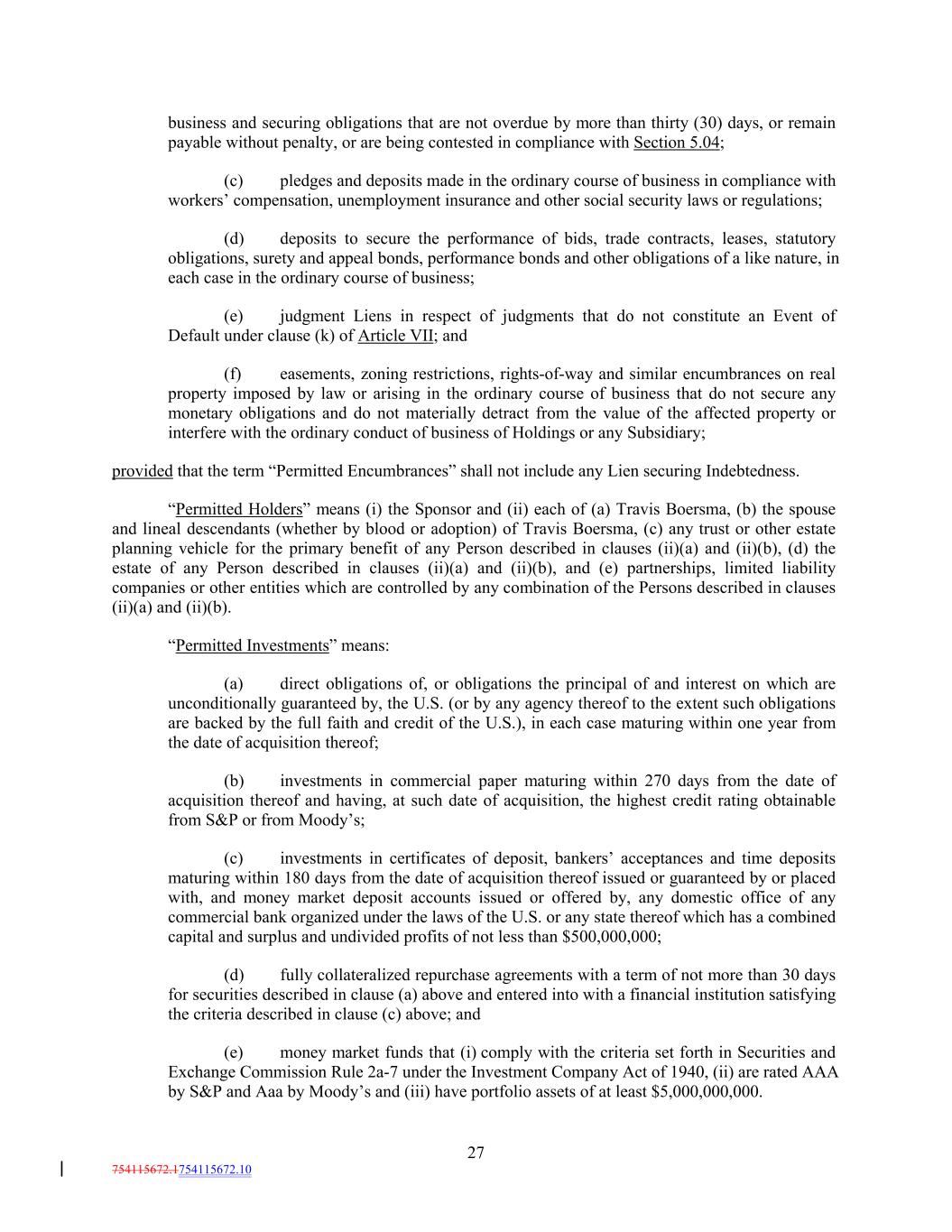 business and securing obligations that are not overdue by more than thirty (30) days, or remain payable without penalty, or are being contested in compliance with Section 5.04; (c) pledges and deposits made in the ordinary course of business in compliance with workers’ compensation, unemployment insurance and other social security laws or regulations; (d) deposits to secure the performance of bids, trade contracts, leases, statutory obligations, surety and appeal bonds, performance bonds and other obligations of a like nature, in each case in the ordinary course of business; (e) judgment Liens in respect of judgments that do not constitute an Event of Default under clause (k) of Article VII; and (f) easements, zoning restrictions, rights-of-way and similar encumbrances on real property imposed by law or arising in the ordinary course of business that do not secure any monetary obligations and do not materially detract from the value of the affected property or interfere with the ordinary conduct of business of Holdings or any Subsidiary; provided that the term “Permitted Encumbrances” shall not include any Lien securing Indebtedness. “Permitted Holders” means (i) the Sponsor and (ii) each of (a) Travis Boersma, (b) the spouse and lineal descendants (whether by blood or adoption) of Travis Boersma, (c) any trust or other estate planning vehicle for the primary benefit of any Person described in clauses (ii)(a) and (ii)(b), (d) the estate of any Person described in clauses (ii)(a) and (ii)(b), and (e) partnerships, limited liability companies or other entities which are controlled by any combination of the Persons described in clauses (ii)(a) and (ii)(b). “Permitted Investments” means: (a) direct obligations of, or obligations the principal of and interest on which are unconditionally guaranteed by, the U.S. (or by any agency thereof to the extent such obligations are backed by the full faith and credit of the U.S.), in each case maturing within one year from the date of acquisition thereof; (b) investments in commercial paper maturing within 270 days from the date of acquisition thereof and having, at such date of acquisition, the highest credit rating obtainable from S&P or from Moody’s; (c) investments in certificates of deposit, bankers’ acceptances and time deposits maturing within 180 days from the date of acquisition thereof issued or guaranteed by or placed with, and money market deposit accounts issued or offered by, any domestic office of any commercial bank organized under the laws of the U.S. or any state thereof which has a combined capital and surplus and undivided profits of not less than $500,000,000; (d) fully collateralized repurchase agreements with a term of not more than 30 days for securities described in clause (a) above and entered into with a financial institution satisfying the criteria described in clause (c) above; and (e) money market funds that (i) comply with the criteria set forth in Securities and Exchange Commission Rule 2a-7 under the Investment Company Act of 1940, (ii) are rated AAA by S&P and Aaa by Moody’s and (iii) have portfolio assets of at least $5,000,000,000. 27 754115672.1754115672.10