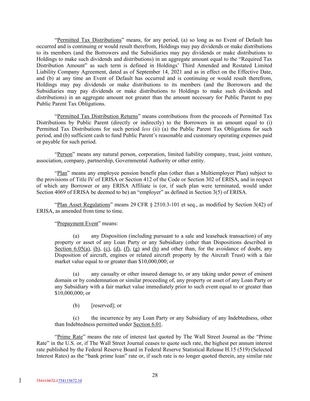 “Permitted Tax Distributions” means, for any period, (a) so long as no Event of Default has occurred and is continuing or would result therefrom, Holdings may pay dividends or make distributions to its members (and the Borrowers and the Subsidiaries may pay dividends or make distributions to Holdings to make such dividends and distributions) in an aggregate amount equal to the “Required Tax Distribution Amount” as such term is defined in Holdings’ Third Amended and Restated Limited Liability Company Agreement, dated as of September 14, 2021 and as in effect on the Effective Date, and (b) at any time an Event of Default has occurred and is continuing or would result therefrom, Holdings may pay dividends or make distributions to its members (and the Borrowers and the Subsidiaries may pay dividends or make distributions to Holdings to make such dividends and distributions) in an aggregate amount not greater than the amount necessary for Public Parent to pay Public Parent Tax Obligations. “Permitted Tax Distribution Returns” means contributions from the proceeds of Permitted Tax Distributions by Public Parent (directly or indirectly) to the Borrowers in an amount equal to (i) Permitted Tax Distributions for such period less (ii) (a) the Public Parent Tax Obligations for such period, and (b) sufficient cash to fund Public Parent’s reasonable and customary operating expenses paid or payable for such period. “Person” means any natural person, corporation, limited liability company, trust, joint venture, association, company, partnership, Governmental Authority or other entity. “Plan” means any employee pension benefit plan (other than a Multiemployer Plan) subject to the provisions of Title IV of ERISA or Section 412 of the Code or Section 302 of ERISA, and in respect of which any Borrower or any ERISA Affiliate is (or, if such plan were terminated, would under Section 4069 of ERISA be deemed to be) an “employer” as defined in Section 3(5) of ERISA. “Plan Asset Regulations” means 29 CFR § 2510.3-101 et seq., as modified by Section 3(42) of ERISA, as amended from time to time. “Prepayment Event” means: (a) any Disposition (including pursuant to a sale and leaseback transaction) of any property or asset of any Loan Party or any Subsidiary (other than Dispositions described in Section 6.05(a), (b), (c), (d), (f), (g) and (h) and other than, for the avoidance of doubt, any Disposition of aircraft, engines or related aircraft property by the Aircraft Trust) with a fair market value equal to or greater than $10,000,000; or (a) any casualty or other insured damage to, or any taking under power of eminent domain or by condemnation or similar proceeding of, any property or asset of any Loan Party or any Subsidiary with a fair market value immediately prior to such event equal to or greater than $10,000,000; or (b) [reserved]; or (c) the incurrence by any Loan Party or any Subsidiary of any Indebtedness, other than Indebtedness permitted under Section 6.01. “Prime Rate” means the rate of interest last quoted by The Wall Street Journal as the “Prime Rate” in the U.S. or, if The Wall Street Journal ceases to quote such rate, the highest per annum interest rate published by the Federal Reserve Board in Federal Reserve Statistical Release H.15 (519) (Selected Interest Rates) as the “bank prime loan” rate or, if such rate is no longer quoted therein, any similar rate 28 754115672.1754115672.10