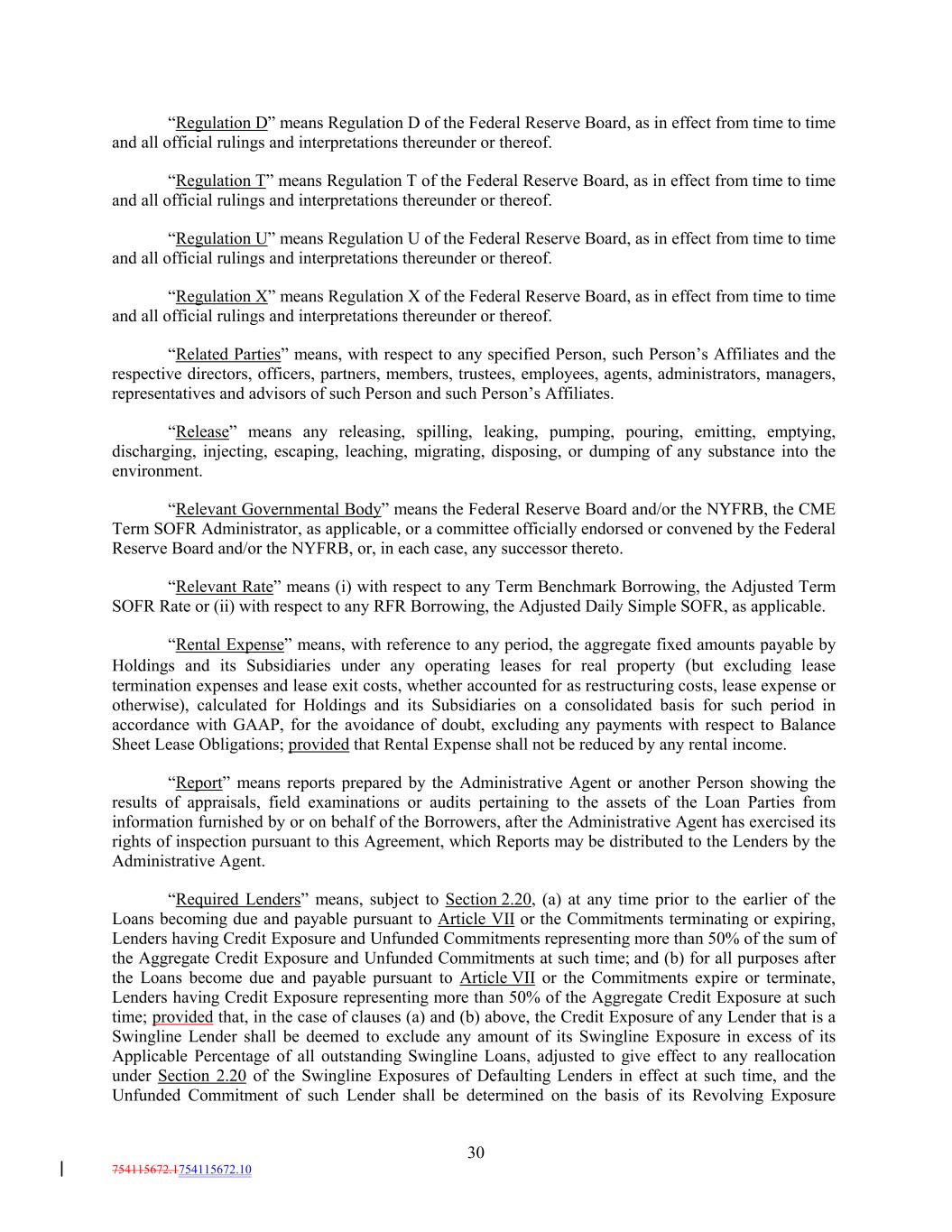 “Regulation D” means Regulation D of the Federal Reserve Board, as in effect from time to time and all official rulings and interpretations thereunder or thereof. “Regulation T” means Regulation T of the Federal Reserve Board, as in effect from time to time and all official rulings and interpretations thereunder or thereof. “Regulation U” means Regulation U of the Federal Reserve Board, as in effect from time to time and all official rulings and interpretations thereunder or thereof. “Regulation X” means Regulation X of the Federal Reserve Board, as in effect from time to time and all official rulings and interpretations thereunder or thereof. “Related Parties” means, with respect to any specified Person, such Person’s Affiliates and the respective directors, officers, partners, members, trustees, employees, agents, administrators, managers, representatives and advisors of such Person and such Person’s Affiliates. “Release” means any releasing, spilling, leaking, pumping, pouring, emitting, emptying, discharging, injecting, escaping, leaching, migrating, disposing, or dumping of any substance into the environment. “Relevant Governmental Body” means the Federal Reserve Board and/or the NYFRB, the CME Term SOFR Administrator, as applicable, or a committee officially endorsed or convened by the Federal Reserve Board and/or the NYFRB, or, in each case, any successor thereto. “Relevant Rate” means (i) with respect to any Term Benchmark Borrowing, the Adjusted Term SOFR Rate or (ii) with respect to any RFR Borrowing, the Adjusted Daily Simple SOFR, as applicable. “Rental Expense” means, with reference to any period, the aggregate fixed amounts payable by Holdings and its Subsidiaries under any operating leases for real property (but excluding lease termination expenses and lease exit costs, whether accounted for as restructuring costs, lease expense or otherwise), calculated for Holdings and its Subsidiaries on a consolidated basis for such period in accordance with GAAP, for the avoidance of doubt, excluding any payments with respect to Balance Sheet Lease Obligations; provided that Rental Expense shall not be reduced by any rental income. “Report” means reports prepared by the Administrative Agent or another Person showing the results of appraisals, field examinations or audits pertaining to the assets of the Loan Parties from information furnished by or on behalf of the Borrowers, after the Administrative Agent has exercised its rights of inspection pursuant to this Agreement, which Reports may be distributed to the Lenders by the Administrative Agent. “Required Lenders” means, subject to Section 2.20, (a) at any time prior to the earlier of the Loans becoming due and payable pursuant to Article VII or the Commitments terminating or expiring, Lenders having Credit Exposure and Unfunded Commitments representing more than 50% of the sum of the Aggregate Credit Exposure and Unfunded Commitments at such time; and (b) for all purposes after the Loans become due and payable pursuant to Article VII or the Commitments expire or terminate, Lenders having Credit Exposure representing more than 50% of the Aggregate Credit Exposure at such time; provided that, in the case of clauses (a) and (b) above, the Credit Exposure of any Lender that is a Swingline Lender shall be deemed to exclude any amount of its Swingline Exposure in excess of its Applicable Percentage of all outstanding Swingline Loans, adjusted to give effect to any reallocation under Section 2.20 of the Swingline Exposures of Defaulting Lenders in effect at such time, and the Unfunded Commitment of such Lender shall be determined on the basis of its Revolving Exposure 30 754115672.1754115672.10
