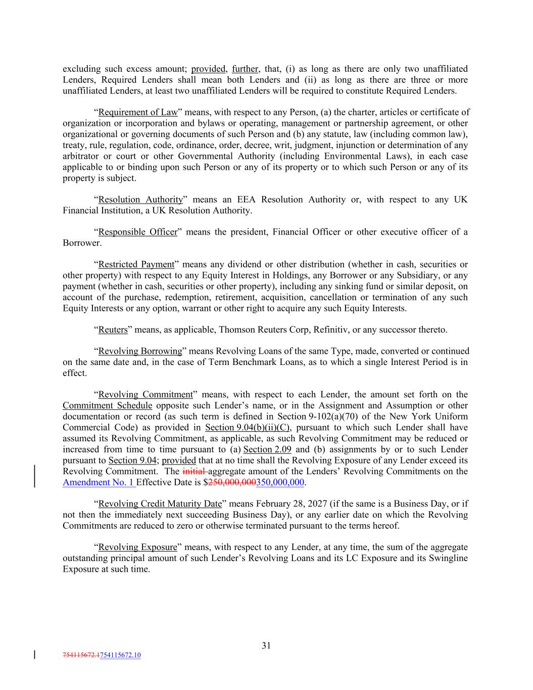 excluding such excess amount; provided, further, that, (i) as long as there are only two unaffiliated Lenders, Required Lenders shall mean both Lenders and (ii) as long as there are three or more unaffiliated Lenders, at least two unaffiliated Lenders will be required to constitute Required Lenders. “Requirement of Law” means, with respect to any Person, (a) the charter, articles or certificate of organization or incorporation and bylaws or operating, management or partnership agreement, or other organizational or governing documents of such Person and (b) any statute, law (including common law), treaty, rule, regulation, code, ordinance, order, decree, writ, judgment, injunction or determination of any arbitrator or court or other Governmental Authority (including Environmental Laws), in each case applicable to or binding upon such Person or any of its property or to which such Person or any of its property is subject. “Resolution Authority” means an EEA Resolution Authority or, with respect to any UK Financial Institution, a UK Resolution Authority. “Responsible Officer” means the president, Financial Officer or other executive officer of a Borrower. “Restricted Payment” means any dividend or other distribution (whether in cash, securities or other property) with respect to any Equity Interest in Holdings, any Borrower or any Subsidiary, or any payment (whether in cash, securities or other property), including any sinking fund or similar deposit, on account of the purchase, redemption, retirement, acquisition, cancellation or termination of any such Equity Interests or any option, warrant or other right to acquire any such Equity Interests. “Reuters” means, as applicable, Thomson Reuters Corp, Refinitiv, or any successor thereto. “Revolving Borrowing” means Revolving Loans of the same Type, made, converted or continued on the same date and, in the case of Term Benchmark Loans, as to which a single Interest Period is in effect. “Revolving Commitment” means, with respect to each Lender, the amount set forth on the Commitment Schedule opposite such Lender’s name, or in the Assignment and Assumption or other documentation or record (as such term is defined in Section 9-102(a)(70) of the New York Uniform Commercial Code) as provided in Section 9.04(b)(ii)(C), pursuant to which such Lender shall have assumed its Revolving Commitment, as applicable, as such Revolving Commitment may be reduced or increased from time to time pursuant to (a) Section 2.09 and (b) assignments by or to such Lender pursuant to Section 9.04; provided that at no time shall the Revolving Exposure of any Lender exceed its Revolving Commitment. The initial aggregate amount of the Lenders’ Revolving Commitments on the Amendment No. 1 Effective Date is $250,000,000350,000,000. “Revolving Credit Maturity Date” means February 28, 2027 (if the same is a Business Day, or if not then the immediately next succeeding Business Day), or any earlier date on which the Revolving Commitments are reduced to zero or otherwise terminated pursuant to the terms hereof. “Revolving Exposure” means, with respect to any Lender, at any time, the sum of the aggregate outstanding principal amount of such Lender’s Revolving Loans and its LC Exposure and its Swingline Exposure at such time. 31 754115672.1754115672.10