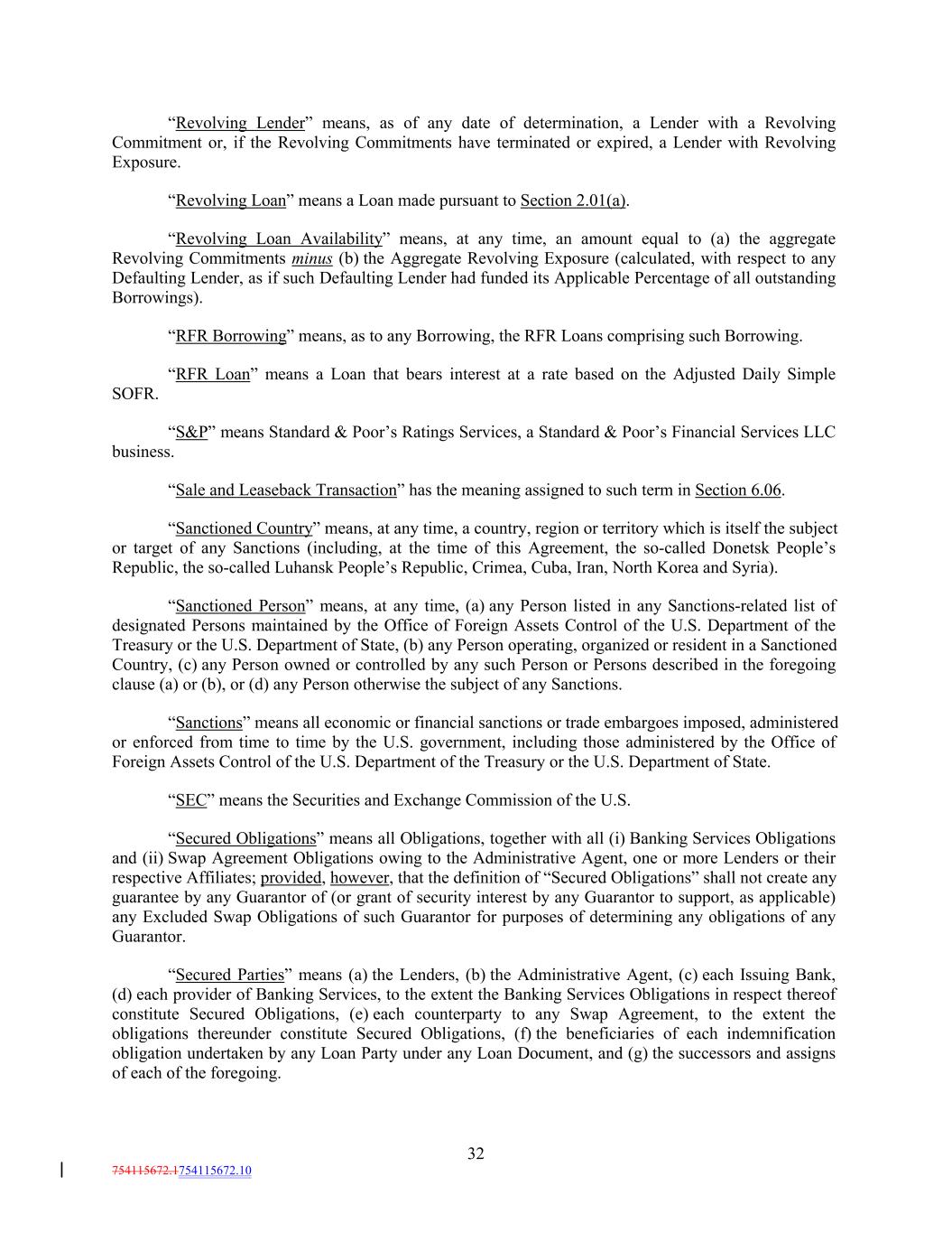 “Revolving Lender” means, as of any date of determination, a Lender with a Revolving Commitment or, if the Revolving Commitments have terminated or expired, a Lender with Revolving Exposure. “Revolving Loan” means a Loan made pursuant to Section 2.01(a). “Revolving Loan Availability” means, at any time, an amount equal to (a) the aggregate Revolving Commitments minus (b) the Aggregate Revolving Exposure (calculated, with respect to any Defaulting Lender, as if such Defaulting Lender had funded its Applicable Percentage of all outstanding Borrowings). “RFR Borrowing” means, as to any Borrowing, the RFR Loans comprising such Borrowing. “RFR Loan” means a Loan that bears interest at a rate based on the Adjusted Daily Simple SOFR. “S&P” means Standard & Poor’s Ratings Services, a Standard & Poor’s Financial Services LLC business. “Sale and Leaseback Transaction” has the meaning assigned to such term in Section 6.06. “Sanctioned Country” means, at any time, a country, region or territory which is itself the subject or target of any Sanctions (including, at the time of this Agreement, the so-called Donetsk People’s Republic, the so-called Luhansk People’s Republic, Crimea, Cuba, Iran, North Korea and Syria). “Sanctioned Person” means, at any time, (a) any Person listed in any Sanctions-related list of designated Persons maintained by the Office of Foreign Assets Control of the U.S. Department of the Treasury or the U.S. Department of State, (b) any Person operating, organized or resident in a Sanctioned Country, (c) any Person owned or controlled by any such Person or Persons described in the foregoing clause (a) or (b), or (d) any Person otherwise the subject of any Sanctions. “Sanctions” means all economic or financial sanctions or trade embargoes imposed, administered or enforced from time to time by the U.S. government, including those administered by the Office of Foreign Assets Control of the U.S. Department of the Treasury or the U.S. Department of State. “SEC” means the Securities and Exchange Commission of the U.S. “Secured Obligations” means all Obligations, together with all (i) Banking Services Obligations and (ii) Swap Agreement Obligations owing to the Administrative Agent, one or more Lenders or their respective Affiliates; provided, however, that the definition of “Secured Obligations” shall not create any guarantee by any Guarantor of (or grant of security interest by any Guarantor to support, as applicable) any Excluded Swap Obligations of such Guarantor for purposes of determining any obligations of any Guarantor. “Secured Parties” means (a) the Lenders, (b) the Administrative Agent, (c) each Issuing Bank, (d) each provider of Banking Services, to the extent the Banking Services Obligations in respect thereof constitute Secured Obligations, (e) each counterparty to any Swap Agreement, to the extent the obligations thereunder constitute Secured Obligations, (f) the beneficiaries of each indemnification obligation undertaken by any Loan Party under any Loan Document, and (g) the successors and assigns of each of the foregoing. 32 754115672.1754115672.10
