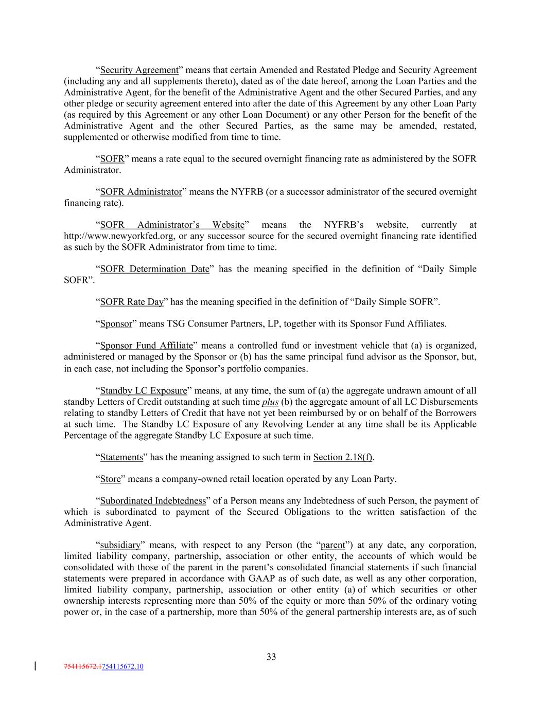 “Security Agreement” means that certain Amended and Restated Pledge and Security Agreement (including any and all supplements thereto), dated as of the date hereof, among the Loan Parties and the Administrative Agent, for the benefit of the Administrative Agent and the other Secured Parties, and any other pledge or security agreement entered into after the date of this Agreement by any other Loan Party (as required by this Agreement or any other Loan Document) or any other Person for the benefit of the Administrative Agent and the other Secured Parties, as the same may be amended, restated, supplemented or otherwise modified from time to time. “SOFR” means a rate equal to the secured overnight financing rate as administered by the SOFR Administrator. “SOFR Administrator” means the NYFRB (or a successor administrator of the secured overnight financing rate). “SOFR Administrator’s Website” means the NYFRB’s website, currently at http://www.newyorkfed.org, or any successor source for the secured overnight financing rate identified as such by the SOFR Administrator from time to time. “SOFR Determination Date” has the meaning specified in the definition of “Daily Simple SOFR”. “SOFR Rate Day” has the meaning specified in the definition of “Daily Simple SOFR”. “Sponsor” means TSG Consumer Partners, LP, together with its Sponsor Fund Affiliates. “Sponsor Fund Affiliate” means a controlled fund or investment vehicle that (a) is organized, administered or managed by the Sponsor or (b) has the same principal fund advisor as the Sponsor, but, in each case, not including the Sponsor’s portfolio companies. “Standby LC Exposure” means, at any time, the sum of (a) the aggregate undrawn amount of all standby Letters of Credit outstanding at such time plus (b) the aggregate amount of all LC Disbursements relating to standby Letters of Credit that have not yet been reimbursed by or on behalf of the Borrowers at such time. The Standby LC Exposure of any Revolving Lender at any time shall be its Applicable Percentage of the aggregate Standby LC Exposure at such time. “Statements” has the meaning assigned to such term in Section 2.18(f). “Store” means a company-owned retail location operated by any Loan Party. “Subordinated Indebtedness” of a Person means any Indebtedness of such Person, the payment of which is subordinated to payment of the Secured Obligations to the written satisfaction of the Administrative Agent. “subsidiary” means, with respect to any Person (the “parent”) at any date, any corporation, limited liability company, partnership, association or other entity, the accounts of which would be consolidated with those of the parent in the parent’s consolidated financial statements if such financial statements were prepared in accordance with GAAP as of such date, as well as any other corporation, limited liability company, partnership, association or other entity (a) of which securities or other ownership interests representing more than 50% of the equity or more than 50% of the ordinary voting power or, in the case of a partnership, more than 50% of the general partnership interests are, as of such 33 754115672.1754115672.10