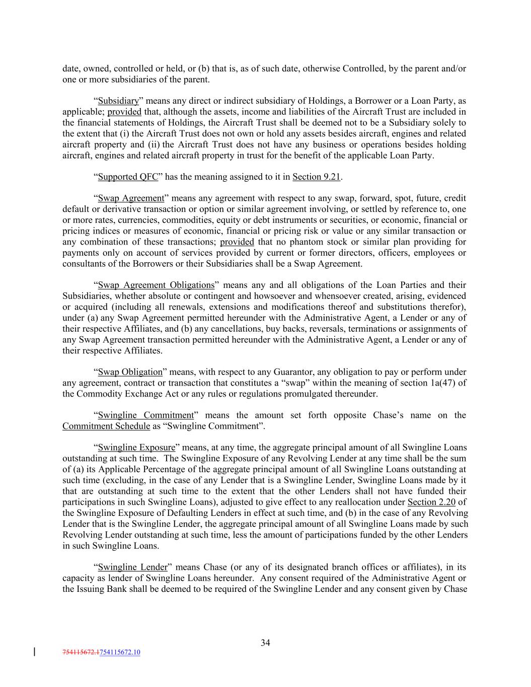 date, owned, controlled or held, or (b) that is, as of such date, otherwise Controlled, by the parent and/or one or more subsidiaries of the parent. “Subsidiary” means any direct or indirect subsidiary of Holdings, a Borrower or a Loan Party, as applicable; provided that, although the assets, income and liabilities of the Aircraft Trust are included in the financial statements of Holdings, the Aircraft Trust shall be deemed not to be a Subsidiary solely to the extent that (i) the Aircraft Trust does not own or hold any assets besides aircraft, engines and related aircraft property and (ii) the Aircraft Trust does not have any business or operations besides holding aircraft, engines and related aircraft property in trust for the benefit of the applicable Loan Party. “Supported QFC” has the meaning assigned to it in Section 9.21. “Swap Agreement” means any agreement with respect to any swap, forward, spot, future, credit default or derivative transaction or option or similar agreement involving, or settled by reference to, one or more rates, currencies, commodities, equity or debt instruments or securities, or economic, financial or pricing indices or measures of economic, financial or pricing risk or value or any similar transaction or any combination of these transactions; provided that no phantom stock or similar plan providing for payments only on account of services provided by current or former directors, officers, employees or consultants of the Borrowers or their Subsidiaries shall be a Swap Agreement. “Swap Agreement Obligations” means any and all obligations of the Loan Parties and their Subsidiaries, whether absolute or contingent and howsoever and whensoever created, arising, evidenced or acquired (including all renewals, extensions and modifications thereof and substitutions therefor), under (a) any Swap Agreement permitted hereunder with the Administrative Agent, a Lender or any of their respective Affiliates, and (b) any cancellations, buy backs, reversals, terminations or assignments of any Swap Agreement transaction permitted hereunder with the Administrative Agent, a Lender or any of their respective Affiliates. “Swap Obligation” means, with respect to any Guarantor, any obligation to pay or perform under any agreement, contract or transaction that constitutes a “swap” within the meaning of section 1a(47) of the Commodity Exchange Act or any rules or regulations promulgated thereunder. “Swingline Commitment” means the amount set forth opposite Chase’s name on the Commitment Schedule as “Swingline Commitment”. “Swingline Exposure” means, at any time, the aggregate principal amount of all Swingline Loans outstanding at such time. The Swingline Exposure of any Revolving Lender at any time shall be the sum of (a) its Applicable Percentage of the aggregate principal amount of all Swingline Loans outstanding at such time (excluding, in the case of any Lender that is a Swingline Lender, Swingline Loans made by it that are outstanding at such time to the extent that the other Lenders shall not have funded their participations in such Swingline Loans), adjusted to give effect to any reallocation under Section 2.20 of the Swingline Exposure of Defaulting Lenders in effect at such time, and (b) in the case of any Revolving Lender that is the Swingline Lender, the aggregate principal amount of all Swingline Loans made by such Revolving Lender outstanding at such time, less the amount of participations funded by the other Lenders in such Swingline Loans. “Swingline Lender” means Chase (or any of its designated branch offices or affiliates), in its capacity as lender of Swingline Loans hereunder. Any consent required of the Administrative Agent or the Issuing Bank shall be deemed to be required of the Swingline Lender and any consent given by Chase 34 754115672.1754115672.10
