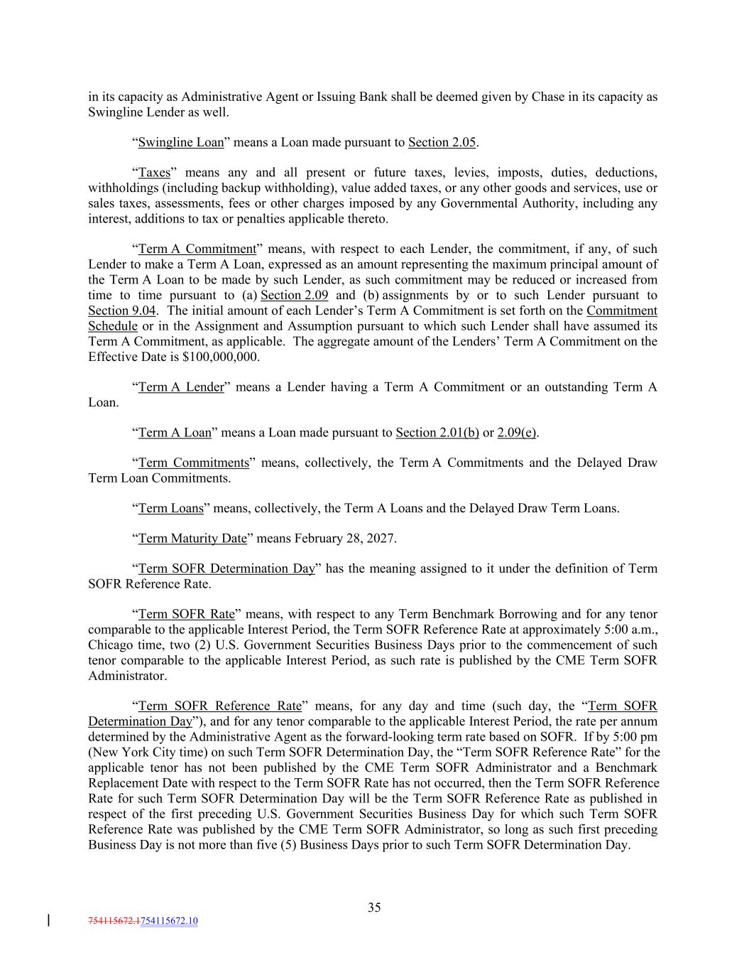 in its capacity as Administrative Agent or Issuing Bank shall be deemed given by Chase in its capacity as Swingline Lender as well. “Swingline Loan” means a Loan made pursuant to Section 2.05. “Taxes” means any and all present or future taxes, levies, imposts, duties, deductions, withholdings (including backup withholding), value added taxes, or any other goods and services, use or sales taxes, assessments, fees or other charges imposed by any Governmental Authority, including any interest, additions to tax or penalties applicable thereto. “Term A Commitment” means, with respect to each Lender, the commitment, if any, of such Lender to make a Term A Loan, expressed as an amount representing the maximum principal amount of the Term A Loan to be made by such Lender, as such commitment may be reduced or increased from time to time pursuant to (a) Section 2.09 and (b) assignments by or to such Lender pursuant to Section 9.04. The initial amount of each Lender’s Term A Commitment is set forth on the Commitment Schedule or in the Assignment and Assumption pursuant to which such Lender shall have assumed its Term A Commitment, as applicable. The aggregate amount of the Lenders’ Term A Commitment on the Effective Date is $100,000,000. “Term A Lender” means a Lender having a Term A Commitment or an outstanding Term A Loan. “Term A Loan” means a Loan made pursuant to Section 2.01(b) or 2.09(e). “Term Commitments” means, collectively, the Term A Commitments and the Delayed Draw Term Loan Commitments. “Term Loans” means, collectively, the Term A Loans and the Delayed Draw Term Loans. “Term Maturity Date” means February 28, 2027. “Term SOFR Determination Day” has the meaning assigned to it under the definition of Term SOFR Reference Rate. “Term SOFR Rate” means, with respect to any Term Benchmark Borrowing and for any tenor comparable to the applicable Interest Period, the Term SOFR Reference Rate at approximately 5:00 a.m., Chicago time, two (2) U.S. Government Securities Business Days prior to the commencement of such tenor comparable to the applicable Interest Period, as such rate is published by the CME Term SOFR Administrator. “Term SOFR Reference Rate” means, for any day and time (such day, the “Term SOFR Determination Day”), and for any tenor comparable to the applicable Interest Period, the rate per annum determined by the Administrative Agent as the forward-looking term rate based on SOFR. If by 5:00 pm (New York City time) on such Term SOFR Determination Day, the “Term SOFR Reference Rate” for the applicable tenor has not been published by the CME Term SOFR Administrator and a Benchmark Replacement Date with respect to the Term SOFR Rate has not occurred, then the Term SOFR Reference Rate for such Term SOFR Determination Day will be the Term SOFR Reference Rate as published in respect of the first preceding U.S. Government Securities Business Day for which such Term SOFR Reference Rate was published by the CME Term SOFR Administrator, so long as such first preceding Business Day is not more than five (5) Business Days prior to such Term SOFR Determination Day. 35 754115672.1754115672.10