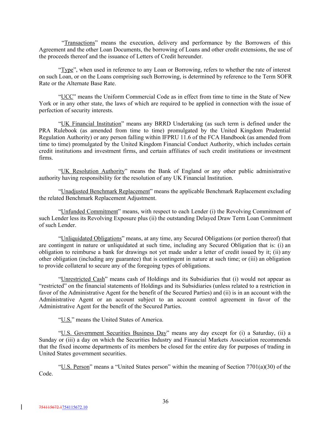 “Transactions” means the execution, delivery and performance by the Borrowers of this Agreement and the other Loan Documents, the borrowing of Loans and other credit extensions, the use of the proceeds thereof and the issuance of Letters of Credit hereunder. “Type”, when used in reference to any Loan or Borrowing, refers to whether the rate of interest on such Loan, or on the Loans comprising such Borrowing, is determined by reference to the Term SOFR Rate or the Alternate Base Rate. “UCC” means the Uniform Commercial Code as in effect from time to time in the State of New York or in any other state, the laws of which are required to be applied in connection with the issue of perfection of security interests. “UK Financial Institution” means any BRRD Undertaking (as such term is defined under the PRA Rulebook (as amended from time to time) promulgated by the United Kingdom Prudential Regulation Authority) or any person falling within IFPRU 11.6 of the FCA Handbook (as amended from time to time) promulgated by the United Kingdom Financial Conduct Authority, which includes certain credit institutions and investment firms, and certain affiliates of such credit institutions or investment firms. “UK Resolution Authority” means the Bank of England or any other public administrative authority having responsibility for the resolution of any UK Financial Institution. “Unadjusted Benchmark Replacement” means the applicable Benchmark Replacement excluding the related Benchmark Replacement Adjustment. “Unfunded Commitment” means, with respect to each Lender (i) the Revolving Commitment of such Lender less its Revolving Exposure plus (ii) the outstanding Delayed Draw Term Loan Commitment of such Lender. “Unliquidated Obligations” means, at any time, any Secured Obligations (or portion thereof) that are contingent in nature or unliquidated at such time, including any Secured Obligation that is: (i) an obligation to reimburse a bank for drawings not yet made under a letter of credit issued by it; (ii) any other obligation (including any guarantee) that is contingent in nature at such time; or (iii) an obligation to provide collateral to secure any of the foregoing types of obligations. “Unrestricted Cash” means cash of Holdings and its Subsidiaries that (i) would not appear as “restricted” on the financial statements of Holdings and its Subsidiaries (unless related to a restriction in favor of the Administrative Agent for the benefit of the Secured Parties) and (ii) is in an account with the Administrative Agent or an account subject to an account control agreement in favor of the Administrative Agent for the benefit of the Secured Parties. “U.S.” means the United States of America. “U.S. Government Securities Business Day” means any day except for (i) a Saturday, (ii) a Sunday or (iii) a day on which the Securities Industry and Financial Markets Association recommends that the fixed income departments of its members be closed for the entire day for purposes of trading in United States government securities. “U.S. Person” means a “United States person” within the meaning of Section 7701(a)(30) of the Code. 36 754115672.1754115672.10