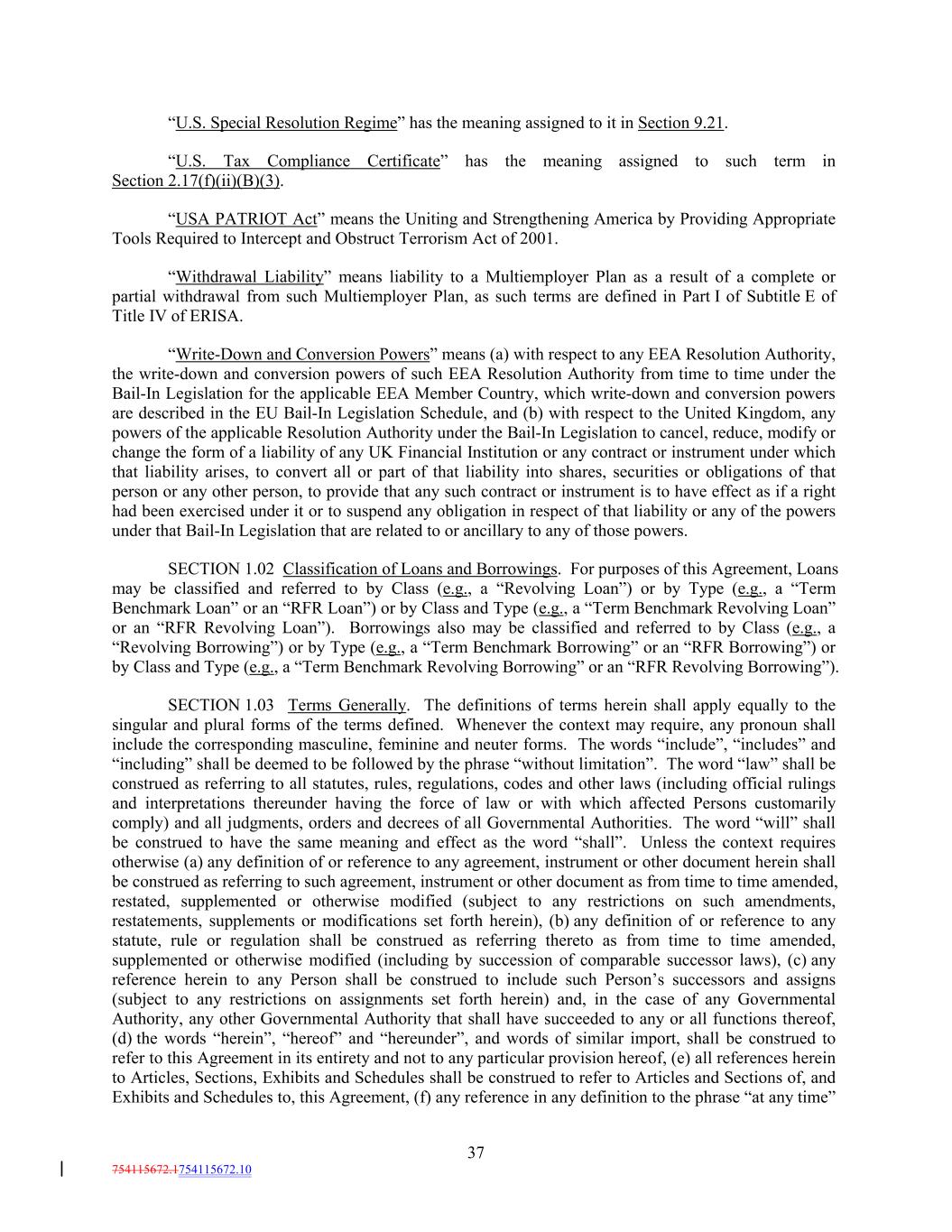 “U.S. Special Resolution Regime” has the meaning assigned to it in Section 9.21. “U.S. Tax Compliance Certificate” has the meaning assigned to such term in Section 2.17(f)(ii)(B)(3). “USA PATRIOT Act” means the Uniting and Strengthening America by Providing Appropriate Tools Required to Intercept and Obstruct Terrorism Act of 2001. “Withdrawal Liability” means liability to a Multiemployer Plan as a result of a complete or partial withdrawal from such Multiemployer Plan, as such terms are defined in Part I of Subtitle E of Title IV of ERISA. “Write-Down and Conversion Powers” means (a) with respect to any EEA Resolution Authority, the write-down and conversion powers of such EEA Resolution Authority from time to time under the Bail-In Legislation for the applicable EEA Member Country, which write-down and conversion powers are described in the EU Bail-In Legislation Schedule, and (b) with respect to the United Kingdom, any powers of the applicable Resolution Authority under the Bail-In Legislation to cancel, reduce, modify or change the form of a liability of any UK Financial Institution or any contract or instrument under which that liability arises, to convert all or part of that liability into shares, securities or obligations of that person or any other person, to provide that any such contract or instrument is to have effect as if a right had been exercised under it or to suspend any obligation in respect of that liability or any of the powers under that Bail-In Legislation that are related to or ancillary to any of those powers. SECTION 1.02 Classification of Loans and Borrowings. For purposes of this Agreement, Loans may be classified and referred to by Class (e.g., a “Revolving Loan”) or by Type (e.g., a “Term Benchmark Loan” or an “RFR Loan”) or by Class and Type (e.g., a “Term Benchmark Revolving Loan” or an “RFR Revolving Loan”). Borrowings also may be classified and referred to by Class (e.g., a “Revolving Borrowing”) or by Type (e.g., a “Term Benchmark Borrowing” or an “RFR Borrowing”) or by Class and Type (e.g., a “Term Benchmark Revolving Borrowing” or an “RFR Revolving Borrowing”). SECTION 1.03 Terms Generally. The definitions of terms herein shall apply equally to the singular and plural forms of the terms defined. Whenever the context may require, any pronoun shall include the corresponding masculine, feminine and neuter forms. The words “include”, “includes” and “including” shall be deemed to be followed by the phrase “without limitation”. The word “law” shall be construed as referring to all statutes, rules, regulations, codes and other laws (including official rulings and interpretations thereunder having the force of law or with which affected Persons customarily comply) and all judgments, orders and decrees of all Governmental Authorities. The word “will” shall be construed to have the same meaning and effect as the word “shall”. Unless the context requires otherwise (a) any definition of or reference to any agreement, instrument or other document herein shall be construed as referring to such agreement, instrument or other document as from time to time amended, restated, supplemented or otherwise modified (subject to any restrictions on such amendments, restatements, supplements or modifications set forth herein), (b) any definition of or reference to any statute, rule or regulation shall be construed as referring thereto as from time to time amended, supplemented or otherwise modified (including by succession of comparable successor laws), (c) any reference herein to any Person shall be construed to include such Person’s successors and assigns (subject to any restrictions on assignments set forth herein) and, in the case of any Governmental Authority, any other Governmental Authority that shall have succeeded to any or all functions thereof, (d) the words “herein”, “hereof” and “hereunder”, and words of similar import, shall be construed to refer to this Agreement in its entirety and not to any particular provision hereof, (e) all references herein to Articles, Sections, Exhibits and Schedules shall be construed to refer to Articles and Sections of, and Exhibits and Schedules to, this Agreement, (f) any reference in any definition to the phrase “at any time” 37 754115672.1754115672.10