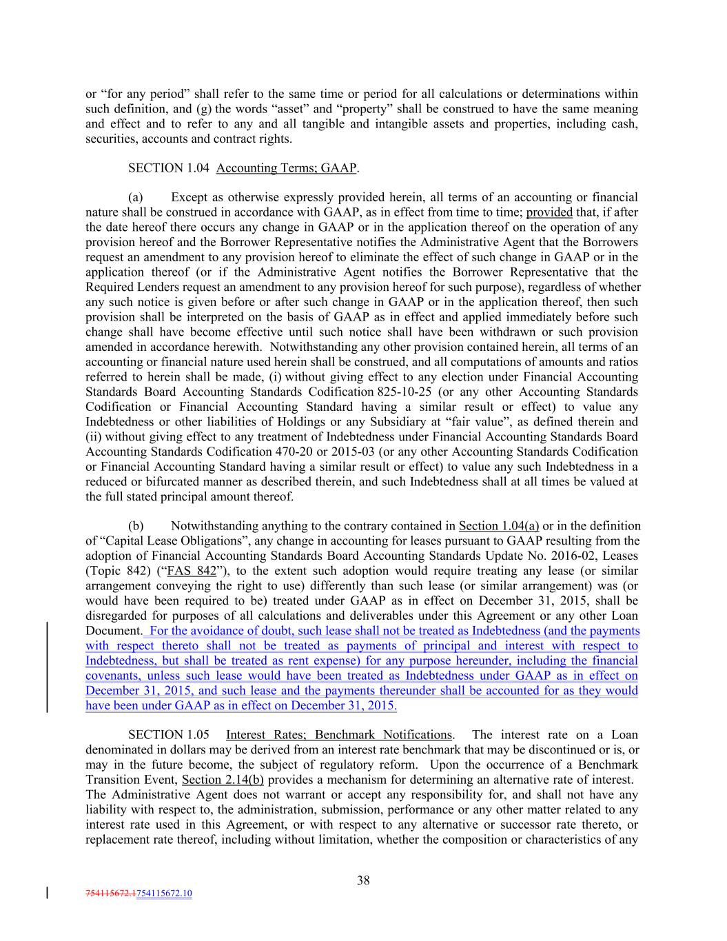 or “for any period” shall refer to the same time or period for all calculations or determinations within such definition, and (g) the words “asset” and “property” shall be construed to have the same meaning and effect and to refer to any and all tangible and intangible assets and properties, including cash, securities, accounts and contract rights. SECTION 1.04 Accounting Terms; GAAP. (a) Except as otherwise expressly provided herein, all terms of an accounting or financial nature shall be construed in accordance with GAAP, as in effect from time to time; provided that, if after the date hereof there occurs any change in GAAP or in the application thereof on the operation of any provision hereof and the Borrower Representative notifies the Administrative Agent that the Borrowers request an amendment to any provision hereof to eliminate the effect of such change in GAAP or in the application thereof (or if the Administrative Agent notifies the Borrower Representative that the Required Lenders request an amendment to any provision hereof for such purpose), regardless of whether any such notice is given before or after such change in GAAP or in the application thereof, then such provision shall be interpreted on the basis of GAAP as in effect and applied immediately before such change shall have become effective until such notice shall have been withdrawn or such provision amended in accordance herewith. Notwithstanding any other provision contained herein, all terms of an accounting or financial nature used herein shall be construed, and all computations of amounts and ratios referred to herein shall be made, (i) without giving effect to any election under Financial Accounting Standards Board Accounting Standards Codification 825-10-25 (or any other Accounting Standards Codification or Financial Accounting Standard having a similar result or effect) to value any Indebtedness or other liabilities of Holdings or any Subsidiary at “fair value”, as defined therein and (ii) without giving effect to any treatment of Indebtedness under Financial Accounting Standards Board Accounting Standards Codification 470-20 or 2015-03 (or any other Accounting Standards Codification or Financial Accounting Standard having a similar result or effect) to value any such Indebtedness in a reduced or bifurcated manner as described therein, and such Indebtedness shall at all times be valued at the full stated principal amount thereof. (b) Notwithstanding anything to the contrary contained in Section 1.04(a) or in the definition of “Capital Lease Obligations”, any change in accounting for leases pursuant to GAAP resulting from the adoption of Financial Accounting Standards Board Accounting Standards Update No. 2016-02, Leases (Topic 842) (“FAS 842”), to the extent such adoption would require treating any lease (or similar arrangement conveying the right to use) differently than such lease (or similar arrangement) was (or would have been required to be) treated under GAAP as in effect on December 31, 2015, shall be disregarded for purposes of all calculations and deliverables under this Agreement or any other Loan Document. For the avoidance of doubt, such lease shall not be treated as Indebtedness (and the payments with respect thereto shall not be treated as payments of principal and interest with respect to Indebtedness, but shall be treated as rent expense) for any purpose hereunder, including the financial covenants, unless such lease would have been treated as Indebtedness under GAAP as in effect on December 31, 2015, and such lease and the payments thereunder shall be accounted for as they would have been under GAAP as in effect on December 31, 2015. SECTION 1.05 Interest Rates; Benchmark Notifications. The interest rate on a Loan denominated in dollars may be derived from an interest rate benchmark that may be discontinued or is, or may in the future become, the subject of regulatory reform. Upon the occurrence of a Benchmark Transition Event, Section 2.14(b) provides a mechanism for determining an alternative rate of interest. The Administrative Agent does not warrant or accept any responsibility for, and shall not have any liability with respect to, the administration, submission, performance or any other matter related to any interest rate used in this Agreement, or with respect to any alternative or successor rate thereto, or replacement rate thereof, including without limitation, whether the composition or characteristics of any 38 754115672.1754115672.10