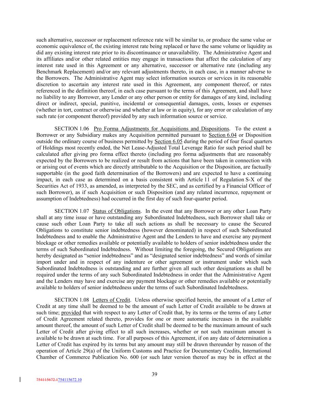 such alternative, successor or replacement reference rate will be similar to, or produce the same value or economic equivalence of, the existing interest rate being replaced or have the same volume or liquidity as did any existing interest rate prior to its discontinuance or unavailability. The Administrative Agent and its affiliates and/or other related entities may engage in transactions that affect the calculation of any interest rate used in this Agreement or any alternative, successor or alternative rate (including any Benchmark Replacement) and/or any relevant adjustments thereto, in each case, in a manner adverse to the Borrowers. The Administrative Agent may select information sources or services in its reasonable discretion to ascertain any interest rate used in this Agreement, any component thereof, or rates referenced in the definition thereof, in each case pursuant to the terms of this Agreement, and shall have no liability to any Borrower, any Lender or any other person or entity for damages of any kind, including direct or indirect, special, punitive, incidental or consequential damages, costs, losses or expenses (whether in tort, contract or otherwise and whether at law or in equity), for any error or calculation of any such rate (or component thereof) provided by any such information source or service. SECTION 1.06 Pro Forma Adjustments for Acquisitions and Dispositions. To the extent a Borrower or any Subsidiary makes any Acquisition permitted pursuant to Section 6.04 or Disposition outside the ordinary course of business permitted by Section 6.05 during the period of four fiscal quarters of Holdings most recently ended, the Net Lease-Adjusted Total Leverage Ratio for such period shall be calculated after giving pro forma effect thereto (including pro forma adjustments that are reasonably expected by the Borrowers to be realized or result from actions that have been taken in connection with or arising out of events which are directly attributable to the Acquisition or the Disposition, are factually supportable (in the good faith determination of the Borrowers) and are expected to have a continuing impact, in each case as determined on a basis consistent with Article 11 of Regulation S-X of the Securities Act of 1933, as amended, as interpreted by the SEC, and as certified by a Financial Officer of such Borrower), as if such Acquisition or such Disposition (and any related incurrence, repayment or assumption of Indebtedness) had occurred in the first day of such four-quarter period. SECTION 1.07 Status of Obligations. In the event that any Borrower or any other Loan Party shall at any time issue or have outstanding any Subordinated Indebtedness, such Borrower shall take or cause such other Loan Party to take all such actions as shall be necessary to cause the Secured Obligations to constitute senior indebtedness (however denominated) in respect of such Subordinated Indebtedness and to enable the Administrative Agent and the Lenders to have and exercise any payment blockage or other remedies available or potentially available to holders of senior indebtedness under the terms of such Subordinated Indebtedness. Without limiting the foregoing, the Secured Obligations are hereby designated as “senior indebtedness” and as “designated senior indebtedness” and words of similar import under and in respect of any indenture or other agreement or instrument under which such Subordinated Indebtedness is outstanding and are further given all such other designations as shall be required under the terms of any such Subordinated Indebtedness in order that the Administrative Agent and the Lenders may have and exercise any payment blockage or other remedies available or potentially available to holders of senior indebtedness under the terms of such Subordinated Indebtedness. SECTION 1.08 Letters of Credit. Unless otherwise specified herein, the amount of a Letter of Credit at any time shall be deemed to be the amount of such Letter of Credit available to be drawn at such time; provided that with respect to any Letter of Credit that, by its terms or the terms of any Letter of Credit Agreement related thereto, provides for one or more automatic increases in the available amount thereof, the amount of such Letter of Credit shall be deemed to be the maximum amount of such Letter of Credit after giving effect to all such increases, whether or not such maximum amount is available to be drawn at such time. For all purposes of this Agreement, if on any date of determination a Letter of Credit has expired by its terms but any amount may still be drawn thereunder by reason of the operation of Article 29(a) of the Uniform Customs and Practice for Documentary Credits, International Chamber of Commerce Publication No. 600 (or such later version thereof as may be in effect at the 39 754115672.1754115672.10