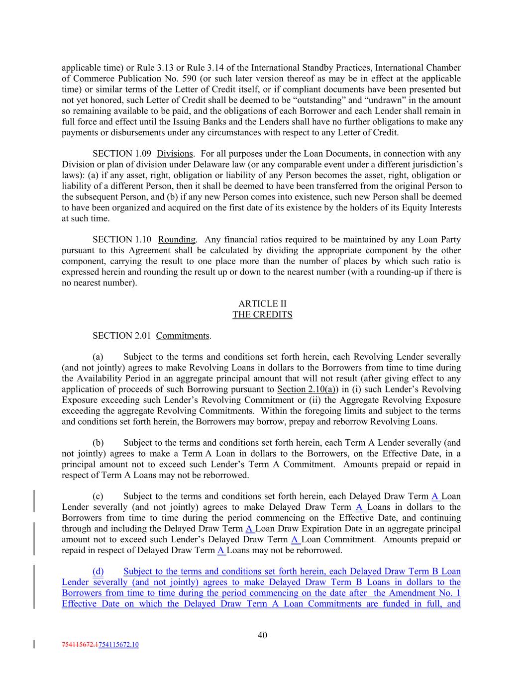 applicable time) or Rule 3.13 or Rule 3.14 of the International Standby Practices, International Chamber of Commerce Publication No. 590 (or such later version thereof as may be in effect at the applicable time) or similar terms of the Letter of Credit itself, or if compliant documents have been presented but not yet honored, such Letter of Credit shall be deemed to be “outstanding” and “undrawn” in the amount so remaining available to be paid, and the obligations of each Borrower and each Lender shall remain in full force and effect until the Issuing Banks and the Lenders shall have no further obligations to make any payments or disbursements under any circumstances with respect to any Letter of Credit. SECTION 1.09 Divisions. For all purposes under the Loan Documents, in connection with any Division or plan of division under Delaware law (or any comparable event under a different jurisdiction’s laws): (a) if any asset, right, obligation or liability of any Person becomes the asset, right, obligation or liability of a different Person, then it shall be deemed to have been transferred from the original Person to the subsequent Person, and (b) if any new Person comes into existence, such new Person shall be deemed to have been organized and acquired on the first date of its existence by the holders of its Equity Interests at such time. SECTION 1.10 Rounding. Any financial ratios required to be maintained by any Loan Party pursuant to this Agreement shall be calculated by dividing the appropriate component by the other component, carrying the result to one place more than the number of places by which such ratio is expressed herein and rounding the result up or down to the nearest number (with a rounding-up if there is no nearest number). ARTICLE II THE CREDITS SECTION 2.01 Commitments. (a) Subject to the terms and conditions set forth herein, each Revolving Lender severally (and not jointly) agrees to make Revolving Loans in dollars to the Borrowers from time to time during the Availability Period in an aggregate principal amount that will not result (after giving effect to any application of proceeds of such Borrowing pursuant to Section 2.10(a)) in (i) such Lender’s Revolving Exposure exceeding such Lender’s Revolving Commitment or (ii) the Aggregate Revolving Exposure exceeding the aggregate Revolving Commitments. Within the foregoing limits and subject to the terms and conditions set forth herein, the Borrowers may borrow, prepay and reborrow Revolving Loans. (b) Subject to the terms and conditions set forth herein, each Term A Lender severally (and not jointly) agrees to make a Term A Loan in dollars to the Borrowers, on the Effective Date, in a principal amount not to exceed such Lender’s Term A Commitment. Amounts prepaid or repaid in respect of Term A Loans may not be reborrowed. (c) Subject to the terms and conditions set forth herein, each Delayed Draw Term A Loan Lender severally (and not jointly) agrees to make Delayed Draw Term A Loans in dollars to the Borrowers from time to time during the period commencing on the Effective Date, and continuing through and including the Delayed Draw Term A Loan Draw Expiration Date in an aggregate principal amount not to exceed such Lender’s Delayed Draw Term A Loan Commitment. Amounts prepaid or repaid in respect of Delayed Draw Term A Loans may not be reborrowed. (d) Subject to the terms and conditions set forth herein, each Delayed Draw Term B Loan Lender severally (and not jointly) agrees to make Delayed Draw Term B Loans in dollars to the Borrowers from time to time during the period commencing on the date after the Amendment No. 1 Effective Date on which the Delayed Draw Term A Loan Commitments are funded in full, and 40 754115672.1754115672.10