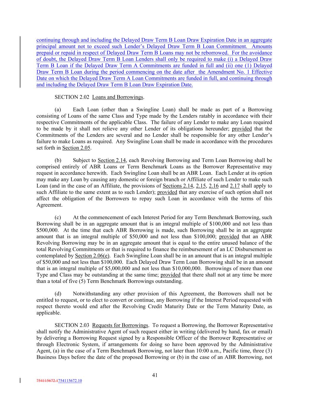 continuing through and including the Delayed Draw Term B Loan Draw Expiration Date in an aggregate principal amount not to exceed such Lender’s Delayed Draw Term B Loan Commitment. Amounts prepaid or repaid in respect of Delayed Draw Term B Loans may not be reborrowed. For the avoidance of doubt, the Delayed Draw Term B Loan Lenders shall only be required to make (i) a Delayed Draw Term B Loan if the Delayed Draw Term A Commitments are funded in full and (ii) one (1) Delayed Draw Term B Loan during the period commencing on the date after the Amendment No. 1 Effective Date on which the Delayed Draw Term A Loan Commitments are funded in full, and continuing through and including the Delayed Draw Term B Loan Draw Expiration Date. SECTION 2.02 Loans and Borrowings. (a) Each Loan (other than a Swingline Loan) shall be made as part of a Borrowing consisting of Loans of the same Class and Type made by the Lenders ratably in accordance with their respective Commitments of the applicable Class. The failure of any Lender to make any Loan required to be made by it shall not relieve any other Lender of its obligations hereunder; provided that the Commitments of the Lenders are several and no Lender shall be responsible for any other Lender’s failure to make Loans as required. Any Swingline Loan shall be made in accordance with the procedures set forth in Section 2.05. (b) Subject to Section 2.14, each Revolving Borrowing and Term Loan Borrowing shall be comprised entirely of ABR Loans or Term Benchmark Loans as the Borrower Representative may request in accordance herewith. Each Swingline Loan shall be an ABR Loan. Each Lender at its option may make any Loan by causing any domestic or foreign branch or Affiliate of such Lender to make such Loan (and in the case of an Affiliate, the provisions of Sections 2.14, 2.15, 2.16 and 2.17 shall apply to such Affiliate to the same extent as to such Lender); provided that any exercise of such option shall not affect the obligation of the Borrowers to repay such Loan in accordance with the terms of this Agreement. (c) At the commencement of each Interest Period for any Term Benchmark Borrowing, such Borrowing shall be in an aggregate amount that is an integral multiple of $100,000 and not less than $500,000. At the time that each ABR Borrowing is made, such Borrowing shall be in an aggregate amount that is an integral multiple of $50,000 and not less than $100,000; provided that an ABR Revolving Borrowing may be in an aggregate amount that is equal to the entire unused balance of the total Revolving Commitments or that is required to finance the reimbursement of an LC Disbursement as contemplated by Section 2.06(e). Each Swingline Loan shall be in an amount that is an integral multiple of $50,000 and not less than $100,000. Each Delayed Draw Term Loan Borrowing shall be in an amount that is an integral multiple of $5,000,000 and not less than $10,000,000. Borrowings of more than one Type and Class may be outstanding at the same time; provided that there shall not at any time be more than a total of five (5) Term Benchmark Borrowings outstanding. (d) Notwithstanding any other provision of this Agreement, the Borrowers shall not be entitled to request, or to elect to convert or continue, any Borrowing if the Interest Period requested with respect thereto would end after the Revolving Credit Maturity Date or the Term Maturity Date, as applicable. SECTION 2.03 Requests for Borrowings. To request a Borrowing, the Borrower Representative shall notify the Administrative Agent of such request either in writing (delivered by hand, fax or email) by delivering a Borrowing Request signed by a Responsible Officer of the Borrower Representative or through Electronic System, if arrangements for doing so have been approved by the Administrative Agent, (a) in the case of a Term Benchmark Borrowing, not later than 10:00 a.m., Pacific time, three (3) Business Days before the date of the proposed Borrowing or (b) in the case of an ABR Borrowing, not 41 754115672.1754115672.10