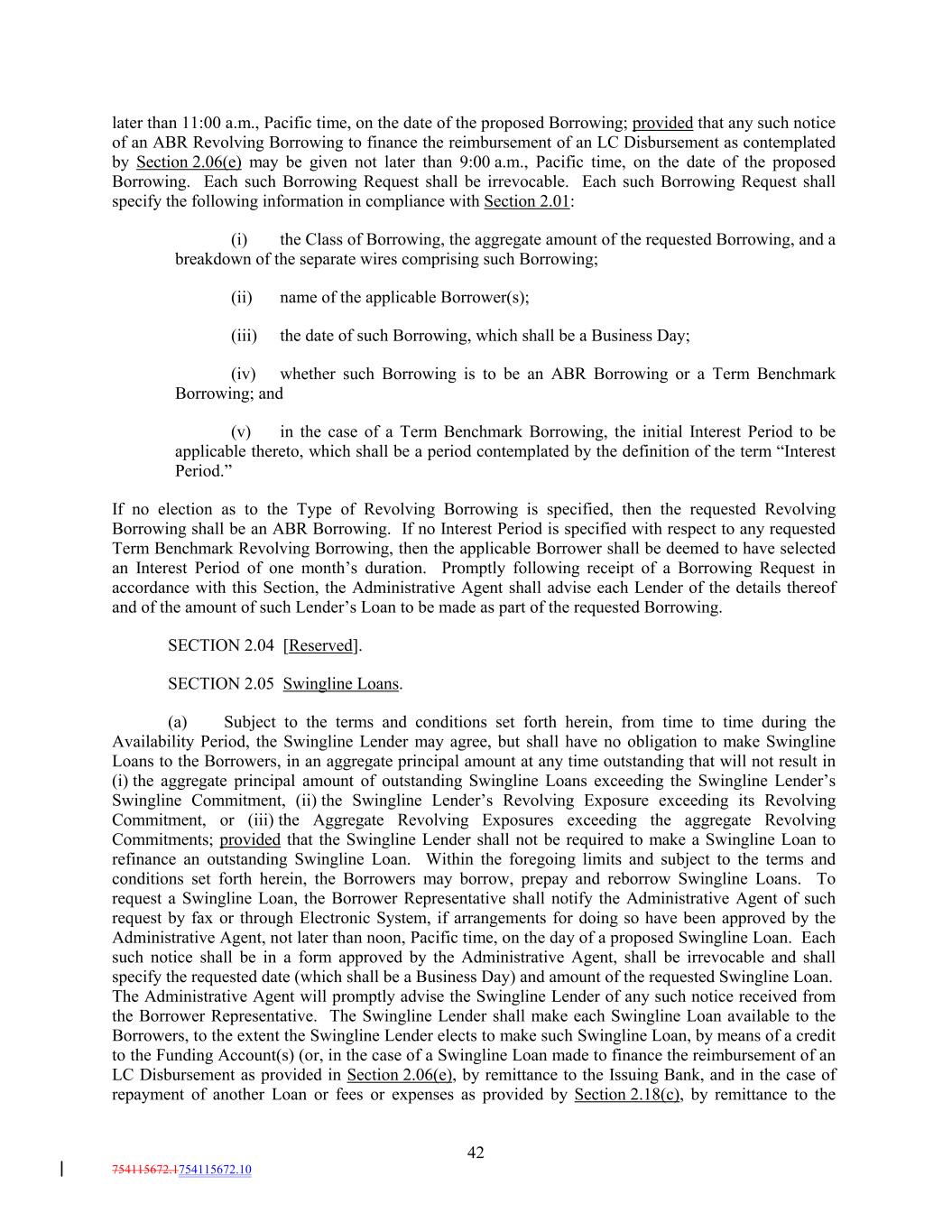 later than 11:00 a.m., Pacific time, on the date of the proposed Borrowing; provided that any such notice of an ABR Revolving Borrowing to finance the reimbursement of an LC Disbursement as contemplated by Section 2.06(e) may be given not later than 9:00 a.m., Pacific time, on the date of the proposed Borrowing. Each such Borrowing Request shall be irrevocable. Each such Borrowing Request shall specify the following information in compliance with Section 2.01: (i) the Class of Borrowing, the aggregate amount of the requested Borrowing, and a breakdown of the separate wires comprising such Borrowing; (ii) name of the applicable Borrower(s); (iii) the date of such Borrowing, which shall be a Business Day; (iv) whether such Borrowing is to be an ABR Borrowing or a Term Benchmark Borrowing; and (v) in the case of a Term Benchmark Borrowing, the initial Interest Period to be applicable thereto, which shall be a period contemplated by the definition of the term “Interest Period.” If no election as to the Type of Revolving Borrowing is specified, then the requested Revolving Borrowing shall be an ABR Borrowing. If no Interest Period is specified with respect to any requested Term Benchmark Revolving Borrowing, then the applicable Borrower shall be deemed to have selected an Interest Period of one month’s duration. Promptly following receipt of a Borrowing Request in accordance with this Section, the Administrative Agent shall advise each Lender of the details thereof and of the amount of such Lender’s Loan to be made as part of the requested Borrowing. SECTION 2.04 [Reserved]. SECTION 2.05 Swingline Loans. (a) Subject to the terms and conditions set forth herein, from time to time during the Availability Period, the Swingline Lender may agree, but shall have no obligation to make Swingline Loans to the Borrowers, in an aggregate principal amount at any time outstanding that will not result in (i) the aggregate principal amount of outstanding Swingline Loans exceeding the Swingline Lender’s Swingline Commitment, (ii) the Swingline Lender’s Revolving Exposure exceeding its Revolving Commitment, or (iii) the Aggregate Revolving Exposures exceeding the aggregate Revolving Commitments; provided that the Swingline Lender shall not be required to make a Swingline Loan to refinance an outstanding Swingline Loan. Within the foregoing limits and subject to the terms and conditions set forth herein, the Borrowers may borrow, prepay and reborrow Swingline Loans. To request a Swingline Loan, the Borrower Representative shall notify the Administrative Agent of such request by fax or through Electronic System, if arrangements for doing so have been approved by the Administrative Agent, not later than noon, Pacific time, on the day of a proposed Swingline Loan. Each such notice shall be in a form approved by the Administrative Agent, shall be irrevocable and shall specify the requested date (which shall be a Business Day) and amount of the requested Swingline Loan. The Administrative Agent will promptly advise the Swingline Lender of any such notice received from the Borrower Representative. The Swingline Lender shall make each Swingline Loan available to the Borrowers, to the extent the Swingline Lender elects to make such Swingline Loan, by means of a credit to the Funding Account(s) (or, in the case of a Swingline Loan made to finance the reimbursement of an LC Disbursement as provided in Section 2.06(e), by remittance to the Issuing Bank, and in the case of repayment of another Loan or fees or expenses as provided by Section 2.18(c), by remittance to the 42 754115672.1754115672.10
