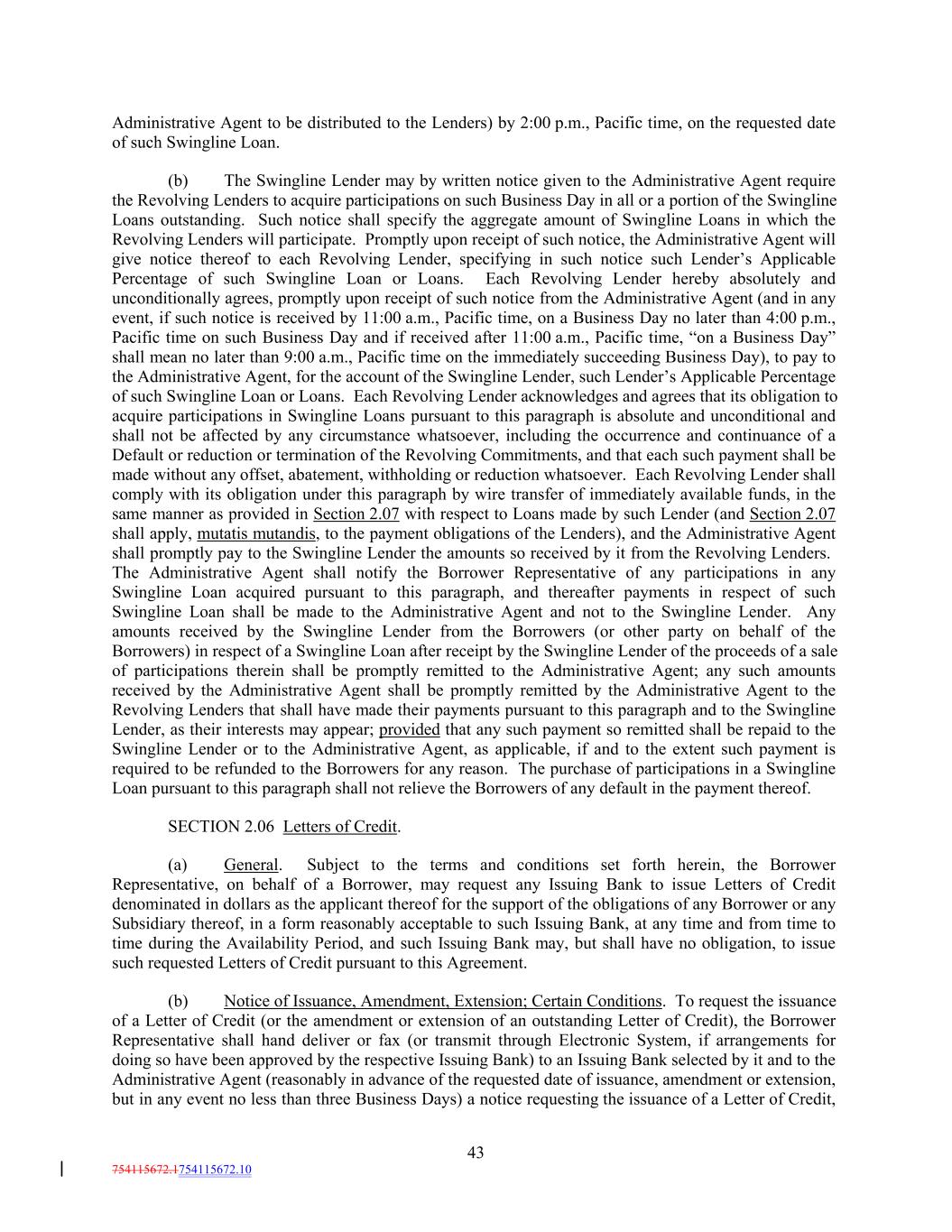 Administrative Agent to be distributed to the Lenders) by 2:00 p.m., Pacific time, on the requested date of such Swingline Loan. (b) The Swingline Lender may by written notice given to the Administrative Agent require the Revolving Lenders to acquire participations on such Business Day in all or a portion of the Swingline Loans outstanding. Such notice shall specify the aggregate amount of Swingline Loans in which the Revolving Lenders will participate. Promptly upon receipt of such notice, the Administrative Agent will give notice thereof to each Revolving Lender, specifying in such notice such Lender’s Applicable Percentage of such Swingline Loan or Loans. Each Revolving Lender hereby absolutely and unconditionally agrees, promptly upon receipt of such notice from the Administrative Agent (and in any event, if such notice is received by 11:00 a.m., Pacific time, on a Business Day no later than 4:00 p.m., Pacific time on such Business Day and if received after 11:00 a.m., Pacific time, “on a Business Day” shall mean no later than 9:00 a.m., Pacific time on the immediately succeeding Business Day), to pay to the Administrative Agent, for the account of the Swingline Lender, such Lender’s Applicable Percentage of such Swingline Loan or Loans. Each Revolving Lender acknowledges and agrees that its obligation to acquire participations in Swingline Loans pursuant to this paragraph is absolute and unconditional and shall not be affected by any circumstance whatsoever, including the occurrence and continuance of a Default or reduction or termination of the Revolving Commitments, and that each such payment shall be made without any offset, abatement, withholding or reduction whatsoever. Each Revolving Lender shall comply with its obligation under this paragraph by wire transfer of immediately available funds, in the same manner as provided in Section 2.07 with respect to Loans made by such Lender (and Section 2.07 shall apply, mutatis mutandis, to the payment obligations of the Lenders), and the Administrative Agent shall promptly pay to the Swingline Lender the amounts so received by it from the Revolving Lenders. The Administrative Agent shall notify the Borrower Representative of any participations in any Swingline Loan acquired pursuant to this paragraph, and thereafter payments in respect of such Swingline Loan shall be made to the Administrative Agent and not to the Swingline Lender. Any amounts received by the Swingline Lender from the Borrowers (or other party on behalf of the Borrowers) in respect of a Swingline Loan after receipt by the Swingline Lender of the proceeds of a sale of participations therein shall be promptly remitted to the Administrative Agent; any such amounts received by the Administrative Agent shall be promptly remitted by the Administrative Agent to the Revolving Lenders that shall have made their payments pursuant to this paragraph and to the Swingline Lender, as their interests may appear; provided that any such payment so remitted shall be repaid to the Swingline Lender or to the Administrative Agent, as applicable, if and to the extent such payment is required to be refunded to the Borrowers for any reason. The purchase of participations in a Swingline Loan pursuant to this paragraph shall not relieve the Borrowers of any default in the payment thereof. SECTION 2.06 Letters of Credit. (a) General. Subject to the terms and conditions set forth herein, the Borrower Representative, on behalf of a Borrower, may request any Issuing Bank to issue Letters of Credit denominated in dollars as the applicant thereof for the support of the obligations of any Borrower or any Subsidiary thereof, in a form reasonably acceptable to such Issuing Bank, at any time and from time to time during the Availability Period, and such Issuing Bank may, but shall have no obligation, to issue such requested Letters of Credit pursuant to this Agreement. (b) Notice of Issuance, Amendment, Extension; Certain Conditions. To request the issuance of a Letter of Credit (or the amendment or extension of an outstanding Letter of Credit), the Borrower Representative shall hand deliver or fax (or transmit through Electronic System, if arrangements for doing so have been approved by the respective Issuing Bank) to an Issuing Bank selected by it and to the Administrative Agent (reasonably in advance of the requested date of issuance, amendment or extension, but in any event no less than three Business Days) a notice requesting the issuance of a Letter of Credit, 43 754115672.1754115672.10