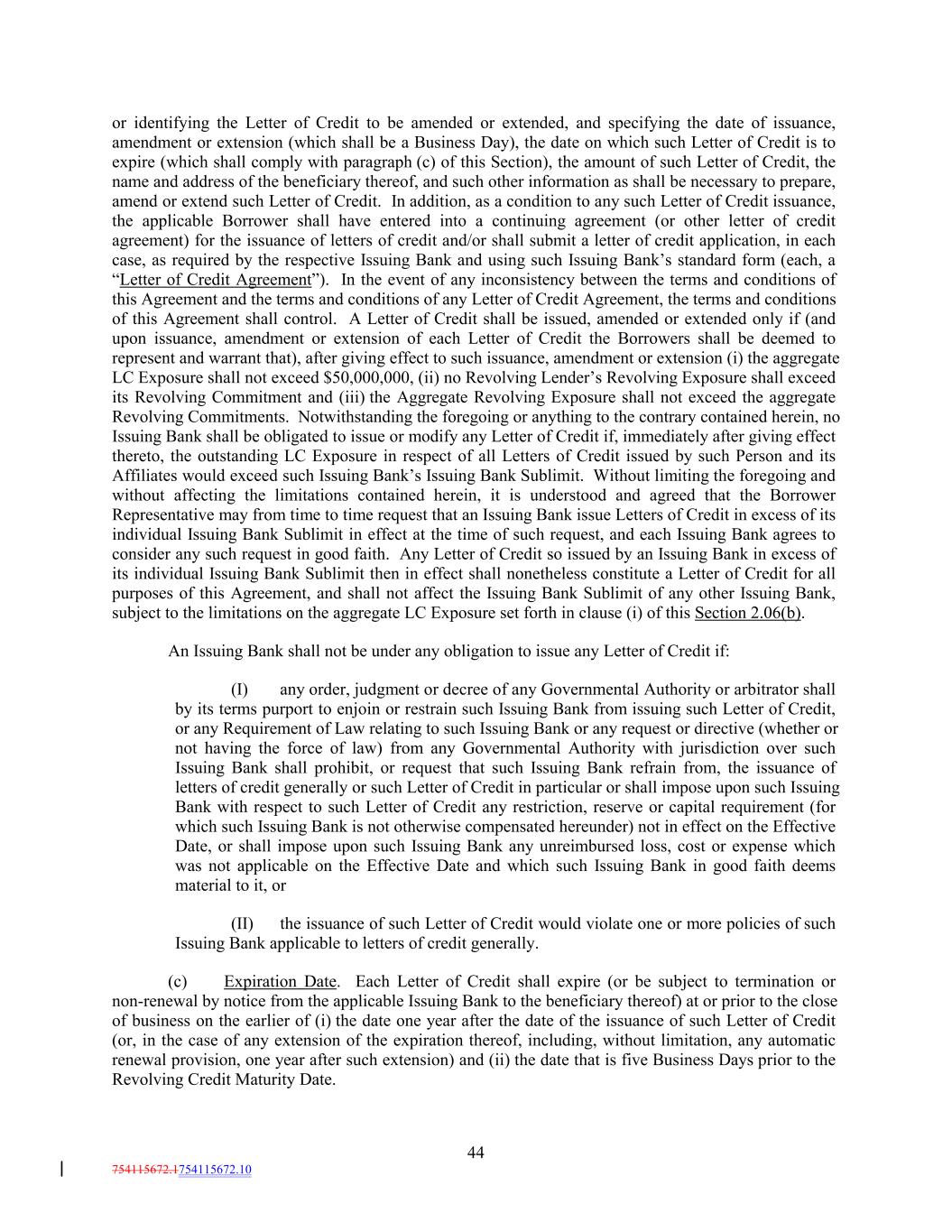 or identifying the Letter of Credit to be amended or extended, and specifying the date of issuance, amendment or extension (which shall be a Business Day), the date on which such Letter of Credit is to expire (which shall comply with paragraph (c) of this Section), the amount of such Letter of Credit, the name and address of the beneficiary thereof, and such other information as shall be necessary to prepare, amend or extend such Letter of Credit. In addition, as a condition to any such Letter of Credit issuance, the applicable Borrower shall have entered into a continuing agreement (or other letter of credit agreement) for the issuance of letters of credit and/or shall submit a letter of credit application, in each case, as required by the respective Issuing Bank and using such Issuing Bank’s standard form (each, a “Letter of Credit Agreement”). In the event of any inconsistency between the terms and conditions of this Agreement and the terms and conditions of any Letter of Credit Agreement, the terms and conditions of this Agreement shall control. A Letter of Credit shall be issued, amended or extended only if (and upon issuance, amendment or extension of each Letter of Credit the Borrowers shall be deemed to represent and warrant that), after giving effect to such issuance, amendment or extension (i) the aggregate LC Exposure shall not exceed $50,000,000, (ii) no Revolving Lender’s Revolving Exposure shall exceed its Revolving Commitment and (iii) the Aggregate Revolving Exposure shall not exceed the aggregate Revolving Commitments. Notwithstanding the foregoing or anything to the contrary contained herein, no Issuing Bank shall be obligated to issue or modify any Letter of Credit if, immediately after giving effect thereto, the outstanding LC Exposure in respect of all Letters of Credit issued by such Person and its Affiliates would exceed such Issuing Bank’s Issuing Bank Sublimit. Without limiting the foregoing and without affecting the limitations contained herein, it is understood and agreed that the Borrower Representative may from time to time request that an Issuing Bank issue Letters of Credit in excess of its individual Issuing Bank Sublimit in effect at the time of such request, and each Issuing Bank agrees to consider any such request in good faith. Any Letter of Credit so issued by an Issuing Bank in excess of its individual Issuing Bank Sublimit then in effect shall nonetheless constitute a Letter of Credit for all purposes of this Agreement, and shall not affect the Issuing Bank Sublimit of any other Issuing Bank, subject to the limitations on the aggregate LC Exposure set forth in clause (i) of this Section 2.06(b). An Issuing Bank shall not be under any obligation to issue any Letter of Credit if: (I) any order, judgment or decree of any Governmental Authority or arbitrator shall by its terms purport to enjoin or restrain such Issuing Bank from issuing such Letter of Credit, or any Requirement of Law relating to such Issuing Bank or any request or directive (whether or not having the force of law) from any Governmental Authority with jurisdiction over such Issuing Bank shall prohibit, or request that such Issuing Bank refrain from, the issuance of letters of credit generally or such Letter of Credit in particular or shall impose upon such Issuing Bank with respect to such Letter of Credit any restriction, reserve or capital requirement (for which such Issuing Bank is not otherwise compensated hereunder) not in effect on the Effective Date, or shall impose upon such Issuing Bank any unreimbursed loss, cost or expense which was not applicable on the Effective Date and which such Issuing Bank in good faith deems material to it, or (II) the issuance of such Letter of Credit would violate one or more policies of such Issuing Bank applicable to letters of credit generally. (c) Expiration Date. Each Letter of Credit shall expire (or be subject to termination or non-renewal by notice from the applicable Issuing Bank to the beneficiary thereof) at or prior to the close of business on the earlier of (i) the date one year after the date of the issuance of such Letter of Credit (or, in the case of any extension of the expiration thereof, including, without limitation, any automatic renewal provision, one year after such extension) and (ii) the date that is five Business Days prior to the Revolving Credit Maturity Date. 44 754115672.1754115672.10