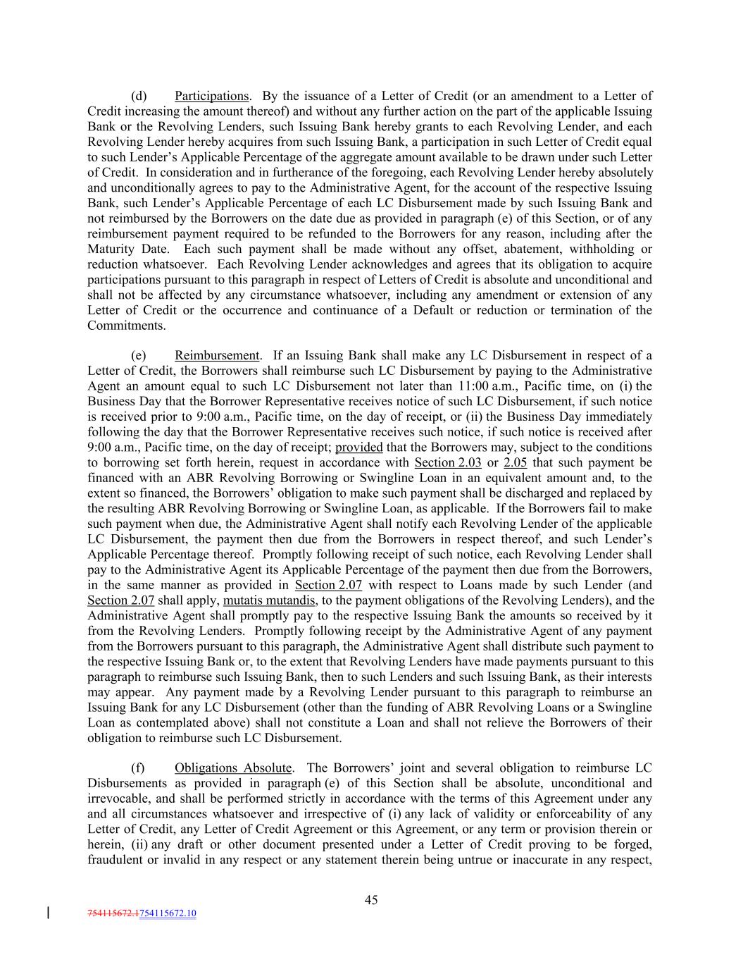 (d) Participations. By the issuance of a Letter of Credit (or an amendment to a Letter of Credit increasing the amount thereof) and without any further action on the part of the applicable Issuing Bank or the Revolving Lenders, such Issuing Bank hereby grants to each Revolving Lender, and each Revolving Lender hereby acquires from such Issuing Bank, a participation in such Letter of Credit equal to such Lender’s Applicable Percentage of the aggregate amount available to be drawn under such Letter of Credit. In consideration and in furtherance of the foregoing, each Revolving Lender hereby absolutely and unconditionally agrees to pay to the Administrative Agent, for the account of the respective Issuing Bank, such Lender’s Applicable Percentage of each LC Disbursement made by such Issuing Bank and not reimbursed by the Borrowers on the date due as provided in paragraph (e) of this Section, or of any reimbursement payment required to be refunded to the Borrowers for any reason, including after the Maturity Date. Each such payment shall be made without any offset, abatement, withholding or reduction whatsoever. Each Revolving Lender acknowledges and agrees that its obligation to acquire participations pursuant to this paragraph in respect of Letters of Credit is absolute and unconditional and shall not be affected by any circumstance whatsoever, including any amendment or extension of any Letter of Credit or the occurrence and continuance of a Default or reduction or termination of the Commitments. (e) Reimbursement. If an Issuing Bank shall make any LC Disbursement in respect of a Letter of Credit, the Borrowers shall reimburse such LC Disbursement by paying to the Administrative Agent an amount equal to such LC Disbursement not later than 11:00 a.m., Pacific time, on (i) the Business Day that the Borrower Representative receives notice of such LC Disbursement, if such notice is received prior to 9:00 a.m., Pacific time, on the day of receipt, or (ii) the Business Day immediately following the day that the Borrower Representative receives such notice, if such notice is received after 9:00 a.m., Pacific time, on the day of receipt; provided that the Borrowers may, subject to the conditions to borrowing set forth herein, request in accordance with Section 2.03 or 2.05 that such payment be financed with an ABR Revolving Borrowing or Swingline Loan in an equivalent amount and, to the extent so financed, the Borrowers’ obligation to make such payment shall be discharged and replaced by the resulting ABR Revolving Borrowing or Swingline Loan, as applicable. If the Borrowers fail to make such payment when due, the Administrative Agent shall notify each Revolving Lender of the applicable LC Disbursement, the payment then due from the Borrowers in respect thereof, and such Lender’s Applicable Percentage thereof. Promptly following receipt of such notice, each Revolving Lender shall pay to the Administrative Agent its Applicable Percentage of the payment then due from the Borrowers, in the same manner as provided in Section 2.07 with respect to Loans made by such Lender (and Section 2.07 shall apply, mutatis mutandis, to the payment obligations of the Revolving Lenders), and the Administrative Agent shall promptly pay to the respective Issuing Bank the amounts so received by it from the Revolving Lenders. Promptly following receipt by the Administrative Agent of any payment from the Borrowers pursuant to this paragraph, the Administrative Agent shall distribute such payment to the respective Issuing Bank or, to the extent that Revolving Lenders have made payments pursuant to this paragraph to reimburse such Issuing Bank, then to such Lenders and such Issuing Bank, as their interests may appear. Any payment made by a Revolving Lender pursuant to this paragraph to reimburse an Issuing Bank for any LC Disbursement (other than the funding of ABR Revolving Loans or a Swingline Loan as contemplated above) shall not constitute a Loan and shall not relieve the Borrowers of their obligation to reimburse such LC Disbursement. (f) Obligations Absolute. The Borrowers’ joint and several obligation to reimburse LC Disbursements as provided in paragraph (e) of this Section shall be absolute, unconditional and irrevocable, and shall be performed strictly in accordance with the terms of this Agreement under any and all circumstances whatsoever and irrespective of (i) any lack of validity or enforceability of any Letter of Credit, any Letter of Credit Agreement or this Agreement, or any term or provision therein or herein, (ii) any draft or other document presented under a Letter of Credit proving to be forged, fraudulent or invalid in any respect or any statement therein being untrue or inaccurate in any respect, 45 754115672.1754115672.10