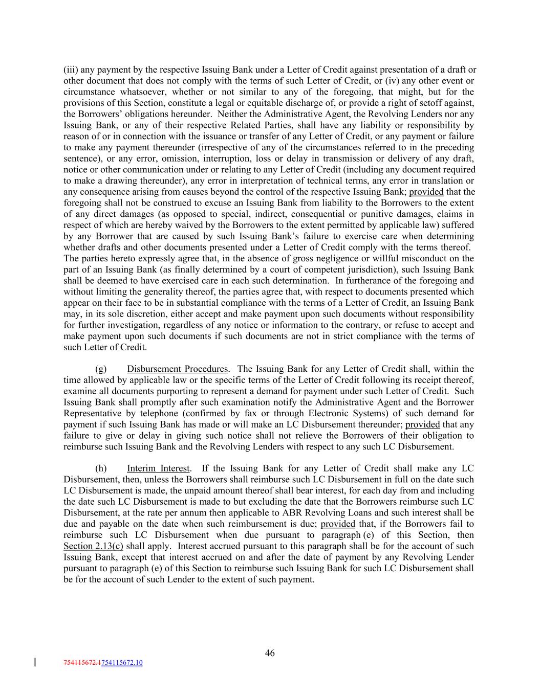 (iii) any payment by the respective Issuing Bank under a Letter of Credit against presentation of a draft or other document that does not comply with the terms of such Letter of Credit, or (iv) any other event or circumstance whatsoever, whether or not similar to any of the foregoing, that might, but for the provisions of this Section, constitute a legal or equitable discharge of, or provide a right of setoff against, the Borrowers’ obligations hereunder. Neither the Administrative Agent, the Revolving Lenders nor any Issuing Bank, or any of their respective Related Parties, shall have any liability or responsibility by reason of or in connection with the issuance or transfer of any Letter of Credit, or any payment or failure to make any payment thereunder (irrespective of any of the circumstances referred to in the preceding sentence), or any error, omission, interruption, loss or delay in transmission or delivery of any draft, notice or other communication under or relating to any Letter of Credit (including any document required to make a drawing thereunder), any error in interpretation of technical terms, any error in translation or any consequence arising from causes beyond the control of the respective Issuing Bank; provided that the foregoing shall not be construed to excuse an Issuing Bank from liability to the Borrowers to the extent of any direct damages (as opposed to special, indirect, consequential or punitive damages, claims in respect of which are hereby waived by the Borrowers to the extent permitted by applicable law) suffered by any Borrower that are caused by such Issuing Bank’s failure to exercise care when determining whether drafts and other documents presented under a Letter of Credit comply with the terms thereof. The parties hereto expressly agree that, in the absence of gross negligence or willful misconduct on the part of an Issuing Bank (as finally determined by a court of competent jurisdiction), such Issuing Bank shall be deemed to have exercised care in each such determination. In furtherance of the foregoing and without limiting the generality thereof, the parties agree that, with respect to documents presented which appear on their face to be in substantial compliance with the terms of a Letter of Credit, an Issuing Bank may, in its sole discretion, either accept and make payment upon such documents without responsibility for further investigation, regardless of any notice or information to the contrary, or refuse to accept and make payment upon such documents if such documents are not in strict compliance with the terms of such Letter of Credit. (g) Disbursement Procedures. The Issuing Bank for any Letter of Credit shall, within the time allowed by applicable law or the specific terms of the Letter of Credit following its receipt thereof, examine all documents purporting to represent a demand for payment under such Letter of Credit. Such Issuing Bank shall promptly after such examination notify the Administrative Agent and the Borrower Representative by telephone (confirmed by fax or through Electronic Systems) of such demand for payment if such Issuing Bank has made or will make an LC Disbursement thereunder; provided that any failure to give or delay in giving such notice shall not relieve the Borrowers of their obligation to reimburse such Issuing Bank and the Revolving Lenders with respect to any such LC Disbursement. (h) Interim Interest. If the Issuing Bank for any Letter of Credit shall make any LC Disbursement, then, unless the Borrowers shall reimburse such LC Disbursement in full on the date such LC Disbursement is made, the unpaid amount thereof shall bear interest, for each day from and including the date such LC Disbursement is made to but excluding the date that the Borrowers reimburse such LC Disbursement, at the rate per annum then applicable to ABR Revolving Loans and such interest shall be due and payable on the date when such reimbursement is due; provided that, if the Borrowers fail to reimburse such LC Disbursement when due pursuant to paragraph (e) of this Section, then Section 2.13(c) shall apply. Interest accrued pursuant to this paragraph shall be for the account of such Issuing Bank, except that interest accrued on and after the date of payment by any Revolving Lender pursuant to paragraph (e) of this Section to reimburse such Issuing Bank for such LC Disbursement shall be for the account of such Lender to the extent of such payment. 46 754115672.1754115672.10