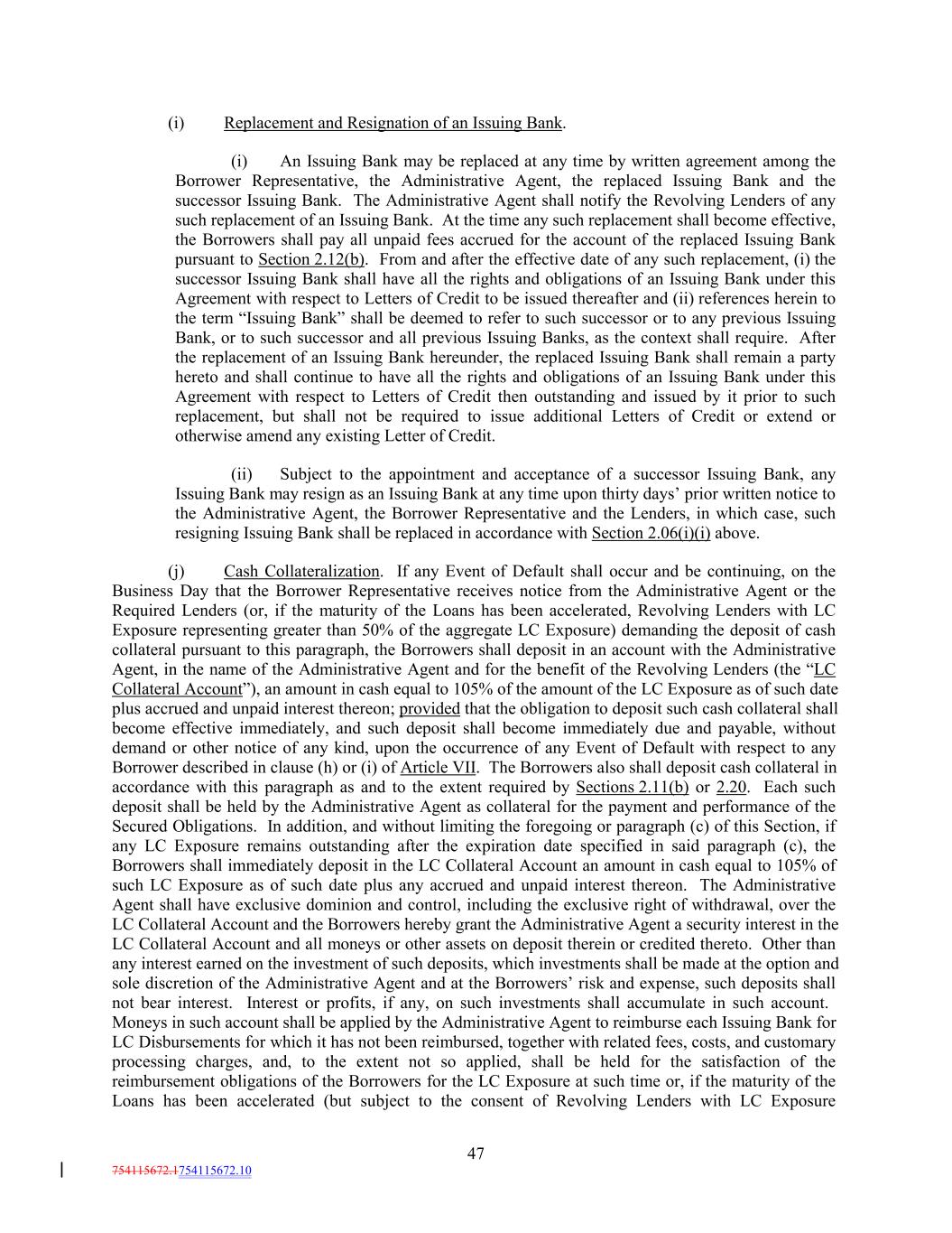 (i) Replacement and Resignation of an Issuing Bank. (i) An Issuing Bank may be replaced at any time by written agreement among the Borrower Representative, the Administrative Agent, the replaced Issuing Bank and the successor Issuing Bank. The Administrative Agent shall notify the Revolving Lenders of any such replacement of an Issuing Bank. At the time any such replacement shall become effective, the Borrowers shall pay all unpaid fees accrued for the account of the replaced Issuing Bank pursuant to Section 2.12(b). From and after the effective date of any such replacement, (i) the successor Issuing Bank shall have all the rights and obligations of an Issuing Bank under this Agreement with respect to Letters of Credit to be issued thereafter and (ii) references herein to the term “Issuing Bank” shall be deemed to refer to such successor or to any previous Issuing Bank, or to such successor and all previous Issuing Banks, as the context shall require. After the replacement of an Issuing Bank hereunder, the replaced Issuing Bank shall remain a party hereto and shall continue to have all the rights and obligations of an Issuing Bank under this Agreement with respect to Letters of Credit then outstanding and issued by it prior to such replacement, but shall not be required to issue additional Letters of Credit or extend or otherwise amend any existing Letter of Credit. (ii) Subject to the appointment and acceptance of a successor Issuing Bank, any Issuing Bank may resign as an Issuing Bank at any time upon thirty days’ prior written notice to the Administrative Agent, the Borrower Representative and the Lenders, in which case, such resigning Issuing Bank shall be replaced in accordance with Section 2.06(i)(i) above. (j) Cash Collateralization. If any Event of Default shall occur and be continuing, on the Business Day that the Borrower Representative receives notice from the Administrative Agent or the Required Lenders (or, if the maturity of the Loans has been accelerated, Revolving Lenders with LC Exposure representing greater than 50% of the aggregate LC Exposure) demanding the deposit of cash collateral pursuant to this paragraph, the Borrowers shall deposit in an account with the Administrative Agent, in the name of the Administrative Agent and for the benefit of the Revolving Lenders (the “LC Collateral Account”), an amount in cash equal to 105% of the amount of the LC Exposure as of such date plus accrued and unpaid interest thereon; provided that the obligation to deposit such cash collateral shall become effective immediately, and such deposit shall become immediately due and payable, without demand or other notice of any kind, upon the occurrence of any Event of Default with respect to any Borrower described in clause (h) or (i) of Article VII. The Borrowers also shall deposit cash collateral in accordance with this paragraph as and to the extent required by Sections 2.11(b) or 2.20. Each such deposit shall be held by the Administrative Agent as collateral for the payment and performance of the Secured Obligations. In addition, and without limiting the foregoing or paragraph (c) of this Section, if any LC Exposure remains outstanding after the expiration date specified in said paragraph (c), the Borrowers shall immediately deposit in the LC Collateral Account an amount in cash equal to 105% of such LC Exposure as of such date plus any accrued and unpaid interest thereon. The Administrative Agent shall have exclusive dominion and control, including the exclusive right of withdrawal, over the LC Collateral Account and the Borrowers hereby grant the Administrative Agent a security interest in the LC Collateral Account and all moneys or other assets on deposit therein or credited thereto. Other than any interest earned on the investment of such deposits, which investments shall be made at the option and sole discretion of the Administrative Agent and at the Borrowers’ risk and expense, such deposits shall not bear interest. Interest or profits, if any, on such investments shall accumulate in such account. Moneys in such account shall be applied by the Administrative Agent to reimburse each Issuing Bank for LC Disbursements for which it has not been reimbursed, together with related fees, costs, and customary processing charges, and, to the extent not so applied, shall be held for the satisfaction of the reimbursement obligations of the Borrowers for the LC Exposure at such time or, if the maturity of the Loans has been accelerated (but subject to the consent of Revolving Lenders with LC Exposure 47 754115672.1754115672.10