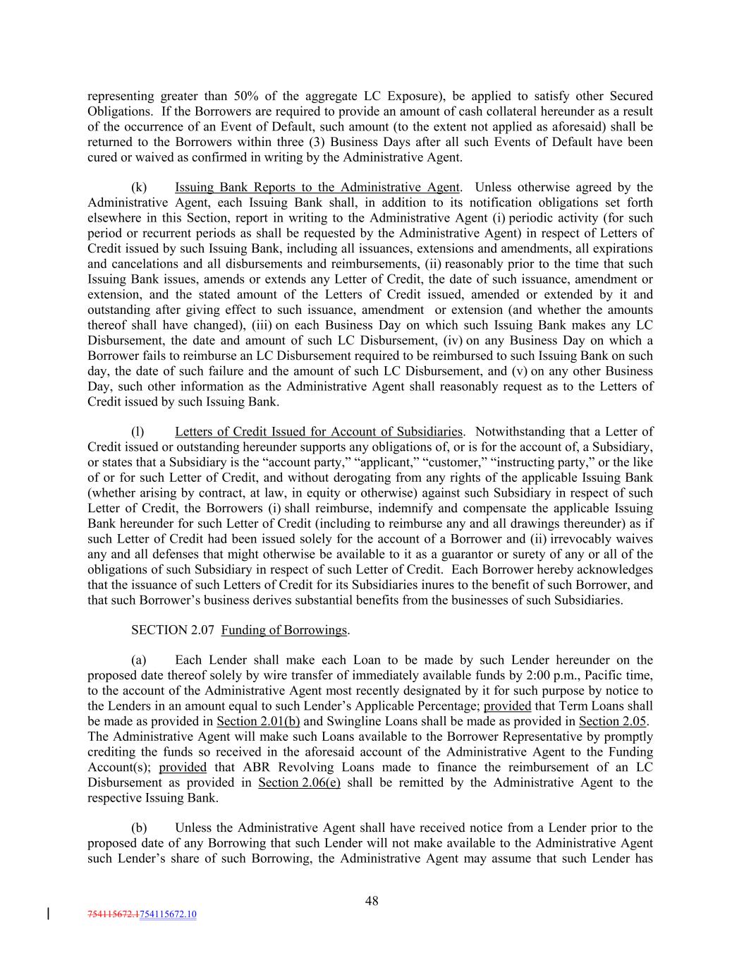 representing greater than 50% of the aggregate LC Exposure), be applied to satisfy other Secured Obligations. If the Borrowers are required to provide an amount of cash collateral hereunder as a result of the occurrence of an Event of Default, such amount (to the extent not applied as aforesaid) shall be returned to the Borrowers within three (3) Business Days after all such Events of Default have been cured or waived as confirmed in writing by the Administrative Agent. (k) Issuing Bank Reports to the Administrative Agent. Unless otherwise agreed by the Administrative Agent, each Issuing Bank shall, in addition to its notification obligations set forth elsewhere in this Section, report in writing to the Administrative Agent (i) periodic activity (for such period or recurrent periods as shall be requested by the Administrative Agent) in respect of Letters of Credit issued by such Issuing Bank, including all issuances, extensions and amendments, all expirations and cancelations and all disbursements and reimbursements, (ii) reasonably prior to the time that such Issuing Bank issues, amends or extends any Letter of Credit, the date of such issuance, amendment or extension, and the stated amount of the Letters of Credit issued, amended or extended by it and outstanding after giving effect to such issuance, amendment or extension (and whether the amounts thereof shall have changed), (iii) on each Business Day on which such Issuing Bank makes any LC Disbursement, the date and amount of such LC Disbursement, (iv) on any Business Day on which a Borrower fails to reimburse an LC Disbursement required to be reimbursed to such Issuing Bank on such day, the date of such failure and the amount of such LC Disbursement, and (v) on any other Business Day, such other information as the Administrative Agent shall reasonably request as to the Letters of Credit issued by such Issuing Bank. (l) Letters of Credit Issued for Account of Subsidiaries. Notwithstanding that a Letter of Credit issued or outstanding hereunder supports any obligations of, or is for the account of, a Subsidiary, or states that a Subsidiary is the “account party,” “applicant,” “customer,” “instructing party,” or the like of or for such Letter of Credit, and without derogating from any rights of the applicable Issuing Bank (whether arising by contract, at law, in equity or otherwise) against such Subsidiary in respect of such Letter of Credit, the Borrowers (i) shall reimburse, indemnify and compensate the applicable Issuing Bank hereunder for such Letter of Credit (including to reimburse any and all drawings thereunder) as if such Letter of Credit had been issued solely for the account of a Borrower and (ii) irrevocably waives any and all defenses that might otherwise be available to it as a guarantor or surety of any or all of the obligations of such Subsidiary in respect of such Letter of Credit. Each Borrower hereby acknowledges that the issuance of such Letters of Credit for its Subsidiaries inures to the benefit of such Borrower, and that such Borrower’s business derives substantial benefits from the businesses of such Subsidiaries. SECTION 2.07 Funding of Borrowings. (a) Each Lender shall make each Loan to be made by such Lender hereunder on the proposed date thereof solely by wire transfer of immediately available funds by 2:00 p.m., Pacific time, to the account of the Administrative Agent most recently designated by it for such purpose by notice to the Lenders in an amount equal to such Lender’s Applicable Percentage; provided that Term Loans shall be made as provided in Section 2.01(b) and Swingline Loans shall be made as provided in Section 2.05. The Administrative Agent will make such Loans available to the Borrower Representative by promptly crediting the funds so received in the aforesaid account of the Administrative Agent to the Funding Account(s); provided that ABR Revolving Loans made to finance the reimbursement of an LC Disbursement as provided in Section 2.06(e) shall be remitted by the Administrative Agent to the respective Issuing Bank. (b) Unless the Administrative Agent shall have received notice from a Lender prior to the proposed date of any Borrowing that such Lender will not make available to the Administrative Agent such Lender’s share of such Borrowing, the Administrative Agent may assume that such Lender has 48 754115672.1754115672.10