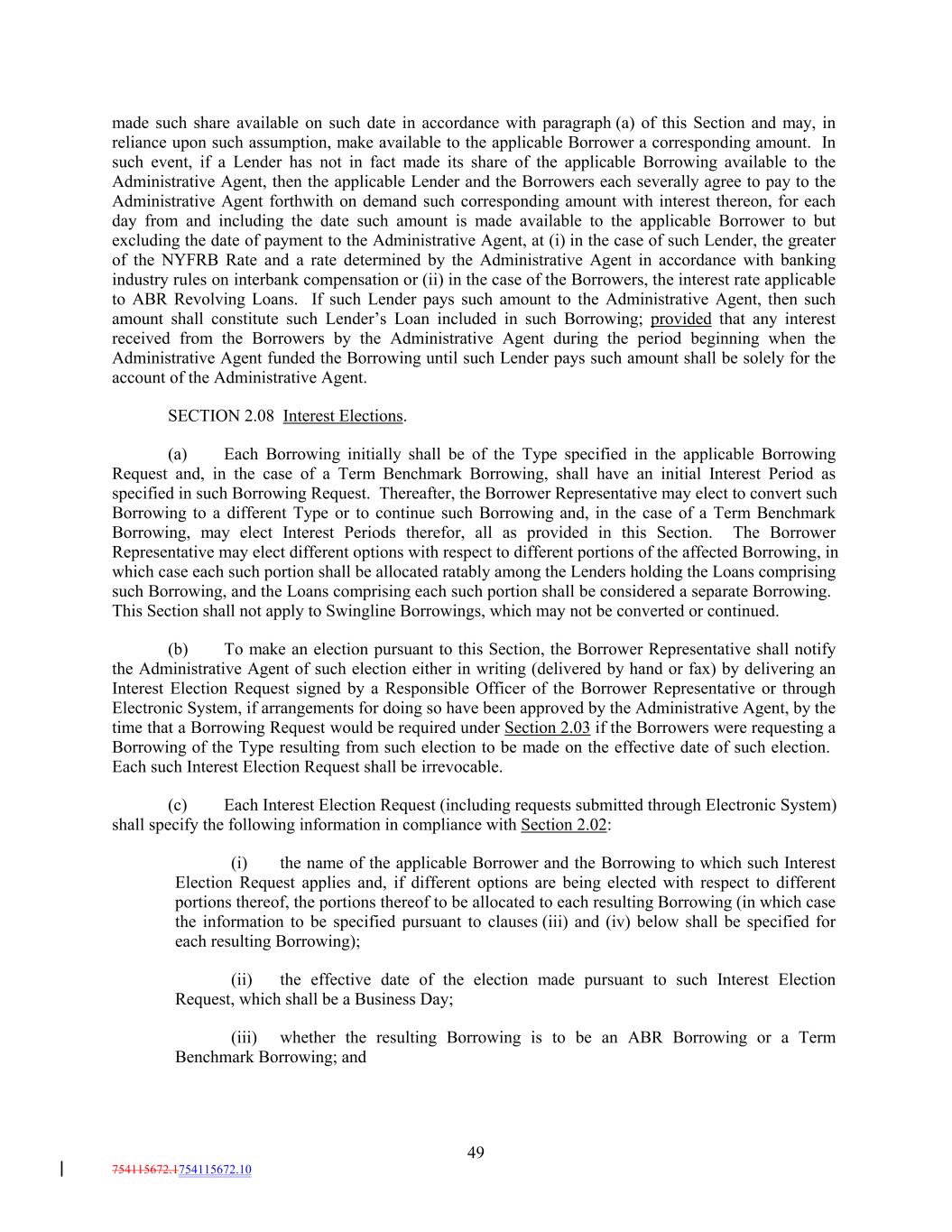 made such share available on such date in accordance with paragraph (a) of this Section and may, in reliance upon such assumption, make available to the applicable Borrower a corresponding amount. In such event, if a Lender has not in fact made its share of the applicable Borrowing available to the Administrative Agent, then the applicable Lender and the Borrowers each severally agree to pay to the Administrative Agent forthwith on demand such corresponding amount with interest thereon, for each day from and including the date such amount is made available to the applicable Borrower to but excluding the date of payment to the Administrative Agent, at (i) in the case of such Lender, the greater of the NYFRB Rate and a rate determined by the Administrative Agent in accordance with banking industry rules on interbank compensation or (ii) in the case of the Borrowers, the interest rate applicable to ABR Revolving Loans. If such Lender pays such amount to the Administrative Agent, then such amount shall constitute such Lender’s Loan included in such Borrowing; provided that any interest received from the Borrowers by the Administrative Agent during the period beginning when the Administrative Agent funded the Borrowing until such Lender pays such amount shall be solely for the account of the Administrative Agent. SECTION 2.08 Interest Elections. (a) Each Borrowing initially shall be of the Type specified in the applicable Borrowing Request and, in the case of a Term Benchmark Borrowing, shall have an initial Interest Period as specified in such Borrowing Request. Thereafter, the Borrower Representative may elect to convert such Borrowing to a different Type or to continue such Borrowing and, in the case of a Term Benchmark Borrowing, may elect Interest Periods therefor, all as provided in this Section. The Borrower Representative may elect different options with respect to different portions of the affected Borrowing, in which case each such portion shall be allocated ratably among the Lenders holding the Loans comprising such Borrowing, and the Loans comprising each such portion shall be considered a separate Borrowing. This Section shall not apply to Swingline Borrowings, which may not be converted or continued. (b) To make an election pursuant to this Section, the Borrower Representative shall notify the Administrative Agent of such election either in writing (delivered by hand or fax) by delivering an Interest Election Request signed by a Responsible Officer of the Borrower Representative or through Electronic System, if arrangements for doing so have been approved by the Administrative Agent, by the time that a Borrowing Request would be required under Section 2.03 if the Borrowers were requesting a Borrowing of the Type resulting from such election to be made on the effective date of such election. Each such Interest Election Request shall be irrevocable. (c) Each Interest Election Request (including requests submitted through Electronic System) shall specify the following information in compliance with Section 2.02: (i) the name of the applicable Borrower and the Borrowing to which such Interest Election Request applies and, if different options are being elected with respect to different portions thereof, the portions thereof to be allocated to each resulting Borrowing (in which case the information to be specified pursuant to clauses (iii) and (iv) below shall be specified for each resulting Borrowing); (ii) the effective date of the election made pursuant to such Interest Election Request, which shall be a Business Day; (iii) whether the resulting Borrowing is to be an ABR Borrowing or a Term Benchmark Borrowing; and 49 754115672.1754115672.10