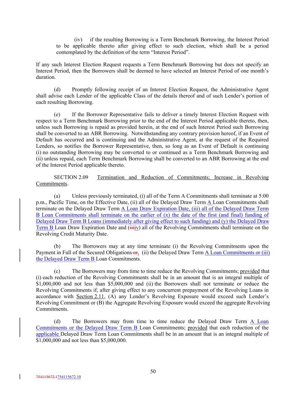 (iv) if the resulting Borrowing is a Term Benchmark Borrowing, the Interest Period to be applicable thereto after giving effect to such election, which shall be a period contemplated by the definition of the term “Interest Period”. If any such Interest Election Request requests a Term Benchmark Borrowing but does not specify an Interest Period, then the Borrowers shall be deemed to have selected an Interest Period of one month’s duration. (d) Promptly following receipt of an Interest Election Request, the Administrative Agent shall advise each Lender of the applicable Class of the details thereof and of such Lender’s portion of each resulting Borrowing. (e) If the Borrower Representative fails to deliver a timely Interest Election Request with respect to a Term Benchmark Borrowing prior to the end of the Interest Period applicable thereto, then, unless such Borrowing is repaid as provided herein, at the end of such Interest Period such Borrowing shall be converted to an ABR Borrowing. Notwithstanding any contrary provision hereof, if an Event of Default has occurred and is continuing and the Administrative Agent, at the request of the Required Lenders, so notifies the Borrower Representative, then, so long as an Event of Default is continuing (i) no outstanding Borrowing may be converted to or continued as a Term Benchmark Borrowing and (ii) unless repaid, each Term Benchmark Borrowing shall be converted to an ABR Borrowing at the end of the Interest Period applicable thereto. SECTION 2.09 Termination and Reduction of Commitments; Increase in Revolving Commitments. (a) Unless previously terminated, (i) all of the Term A Commitments shall terminate at 5:00 p.m., Pacific Time, on the Effective Date, (ii) all of the Delayed Draw Term A Loan Commitments shall terminate on the Delayed Draw Term A Loan Draw Expiration Date, (iii) all of the Delayed Draw Term B Loan Commitments shall terminate on the earlier of (x) the date of the first (and final) funding of Delayed Draw Term B Loans (immediately after giving effect to such funding) and (y) the Delayed Draw Term B Loan Draw Expiration Date and (iiiiv) all of the Revolving Commitments shall terminate on the Revolving Credit Maturity Date. (b) The Borrowers may at any time terminate (i) the Revolving Commitments upon the Payment in Full of the Secured Obligations or, (ii) the Delayed Draw Term A Loan Commitments or (iii) the Delayed Draw Term B Loan Commitments. (c) The Borrowers may from time to time reduce the Revolving Commitments; provided that (i) each reduction of the Revolving Commitments shall be in an amount that is an integral multiple of $1,000,000 and not less than $5,000,000 and (ii) the Borrowers shall not terminate or reduce the Revolving Commitments if, after giving effect to any concurrent prepayment of the Revolving Loans in accordance with Section 2.11, (A) any Lender’s Revolving Exposure would exceed such Lender’s Revolving Commitment or (B) the Aggregate Revolving Exposure would exceed the aggregate Revolving Commitments. (d) The Borrowers may from time to time reduce the Delayed Draw Term A Loan Commitments or the Delayed Draw Term B Loan Commitments; provided that each reduction of the applicable Delayed Draw Term Loan Commitments shall be in an amount that is an integral multiple of $1,000,000 and not less than $5,000,000. 50 754115672.1754115672.10