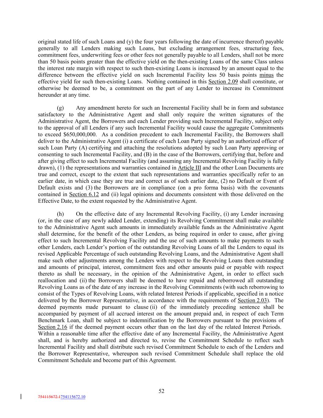 original stated life of such Loans and (y) the four years following the date of incurrence thereof) payable generally to all Lenders making such Loans, but excluding arrangement fees, structuring fees, commitment fees, underwriting fees or other fees not generally payable to all Lenders, shall not be more than 50 basis points greater than the effective yield on the then-existing Loans of the same Class unless the interest rate margin with respect to such then-existing Loans is increased by an amount equal to the difference between the effective yield on such Incremental Facility less 50 basis points minus the effective yield for such then-existing Loans. Nothing contained in this Section 2.09 shall constitute, or otherwise be deemed to be, a commitment on the part of any Lender to increase its Commitment hereunder at any time. (g) Any amendment hereto for such an Incremental Facility shall be in form and substance satisfactory to the Administrative Agent and shall only require the written signatures of the Administrative Agent, the Borrowers and each Lender providing such Incremental Facility, subject only to the approval of all Lenders if any such Incremental Facility would cause the aggregate Commitments to exceed $650,000,000. As a condition precedent to each Incremental Facility, the Borrowers shall deliver to the Administrative Agent (i) a certificate of each Loan Party signed by an authorized officer of such Loan Party (A) certifying and attaching the resolutions adopted by such Loan Party approving or consenting to such Incremental Facility, and (B) in the case of the Borrowers, certifying that, before and after giving effect to such Incremental Facility (and assuming any Incremental Revolving Facility is fully drawn), (1) the representations and warranties contained in Article III and the other Loan Documents are true and correct, except to the extent that such representations and warranties specifically refer to an earlier date, in which case they are true and correct as of such earlier date, (2) no Default or Event of Default exists and (3) the Borrowers are in compliance (on a pro forma basis) with the covenants contained in Section 6.12 and (ii) legal opinions and documents consistent with those delivered on the Effective Date, to the extent requested by the Administrative Agent. (h) On the effective date of any Incremental Revolving Facility, (i) any Lender increasing (or, in the case of any newly added Lender, extending) its Revolving Commitment shall make available to the Administrative Agent such amounts in immediately available funds as the Administrative Agent shall determine, for the benefit of the other Lenders, as being required in order to cause, after giving effect to such Incremental Revolving Facility and the use of such amounts to make payments to such other Lenders, each Lender’s portion of the outstanding Revolving Loans of all the Lenders to equal its revised Applicable Percentage of such outstanding Revolving Loans, and the Administrative Agent shall make such other adjustments among the Lenders with respect to the Revolving Loans then outstanding and amounts of principal, interest, commitment fees and other amounts paid or payable with respect thereto as shall be necessary, in the opinion of the Administrative Agent, in order to effect such reallocation and (ii) the Borrowers shall be deemed to have repaid and reborrowed all outstanding Revolving Loans as of the date of any increase in the Revolving Commitments (with such reborrowing to consist of the Types of Revolving Loans, with related Interest Periods if applicable, specified in a notice delivered by the Borrower Representative, in accordance with the requirements of Section 2.03). The deemed payments made pursuant to clause (ii) of the immediately preceding sentence shall be accompanied by payment of all accrued interest on the amount prepaid and, in respect of each Term Benchmark Loan, shall be subject to indemnification by the Borrowers pursuant to the provisions of Section 2.16 if the deemed payment occurs other than on the last day of the related Interest Periods. Within a reasonable time after the effective date of any Incremental Facility, the Administrative Agent shall, and is hereby authorized and directed to, revise the Commitment Schedule to reflect such Incremental Facility and shall distribute such revised Commitment Schedule to each of the Lenders and the Borrower Representative, whereupon such revised Commitment Schedule shall replace the old Commitment Schedule and become part of this Agreement. 52 754115672.1754115672.10