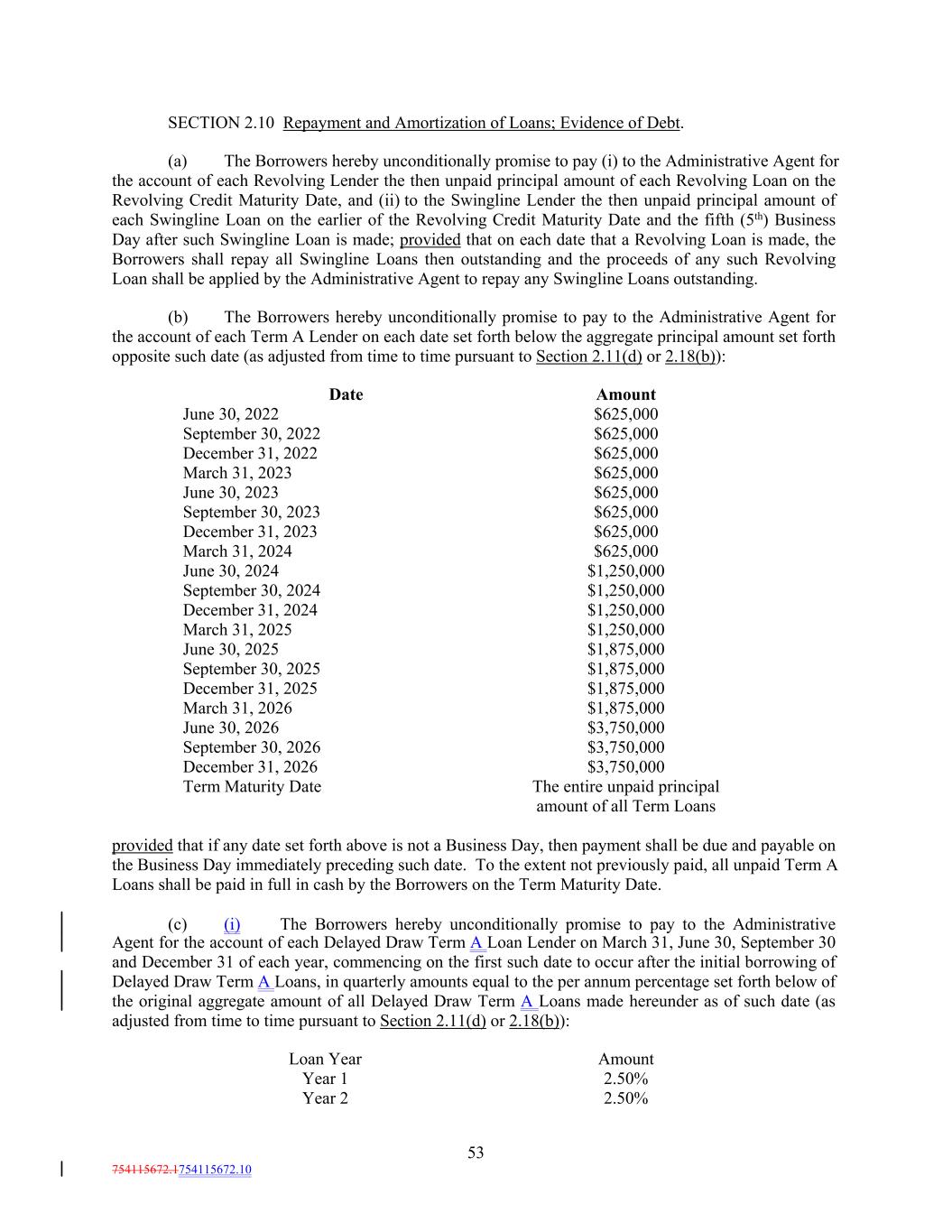 53 754115672.1754115672.10 $1,250,000 June 30, 2023 March 31, 2025 $625,000 $1,250,000 September 30, 2022 June 30, 2025 Amount $1,875,000 September 30, 2023 $625,000 September 30, 2025 $625,000 $1,875,000 SECTION 2.10 Repayment and Amortization of Loans; Evidence of Debt. (a) The Borrowers hereby unconditionally promise to pay (i) to the Administrative Agent for the account of each Revolving Lender the then unpaid principal amount of each Revolving Loan on the Revolving Credit Maturity Date, and (ii) to the Swingline Lender the then unpaid principal amount of each Swingline Loan on the earlier of the Revolving Credit Maturity Date and the fifth (5th) Business Day after such Swingline Loan is made; provided that on each date that a Revolving Loan is made, the Borrowers shall repay all Swingline Loans then outstanding and the proceeds of any such Revolving Loan shall be applied by the Administrative Agent to repay any Swingline Loans outstanding. (b) The Borrowers hereby unconditionally promise to pay to the Administrative Agent for the account of each Term A Lender on each date set forth below the aggregate principal amount set forth opposite such date (as adjusted from time to time pursuant to Section 2.11(d) or 2.18(b)): December 31, 2025 $1,875,000 December 31, 2023 March 31, 2026 $625,000 $1,875,000 December 31, 2022 June 30, 2026 $3,750,000 March 31, 2024 $625,000 September 30, 2026 $625,000 $3,750,000 June 30, 2022 December 31, 2026 $3,750,000 June 30, 2024 Term Maturity Date $1,250,000 The entire unpaid principal amount of all Term Loans March 31, 2023 provided that if any date set forth above is not a Business Day, then payment shall be due and payable on the Business Day immediately preceding such date. To the extent not previously paid, all unpaid Term A Loans shall be paid in full in cash by the Borrowers on the Term Maturity Date. (c) (i) The Borrowers hereby unconditionally promise to pay to the Administrative Agent for the account of each Delayed Draw Term A Loan Lender on March 31, June 30, September 30 and December 31 of each year, commencing on the first such date to occur after the initial borrowing of Delayed Draw Term A Loans, in quarterly amounts equal to the per annum percentage set forth below of the original aggregate amount of all Delayed Draw Term A Loans made hereunder as of such date (as adjusted from time to time pursuant to Section 2.11(d) or 2.18(b)): Loan Year $625,000 Amount September 30, 2024 $625,000 Year 1 $1,250,000 2.50% Date Year 2 2.50% December 31, 2024
