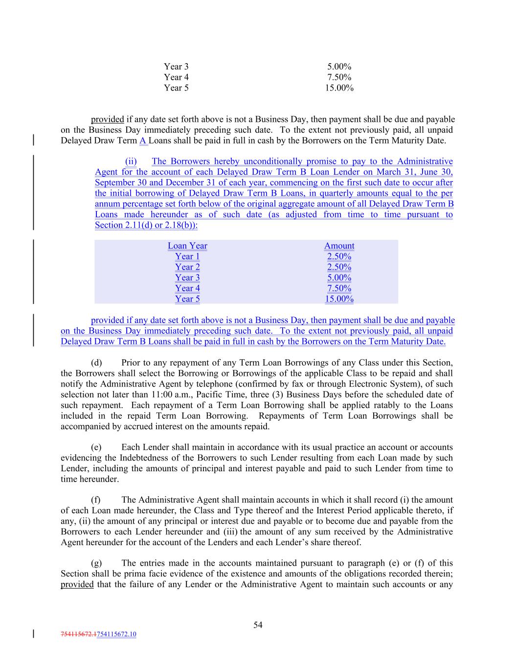 54 754115672.1754115672.10 7.50% Year 1 2.50% 5.00% Year 2 Year 5 2.50% 15.00% Year 3 5.00% provided if any date set forth above is not a Business Day, then payment shall be due and payable on the Business Day immediately preceding such date. To the extent not previously paid, all unpaid Delayed Draw Term A Loans shall be paid in full in cash by the Borrowers on the Term Maturity Date. (ii) The Borrowers hereby unconditionally promise to pay to the Administrative Agent for the account of each Delayed Draw Term B Loan Lender on March 31, June 30, September 30 and December 31 of each year, commencing on the first such date to occur after the initial borrowing of Delayed Draw Term B Loans, in quarterly amounts equal to the per annum percentage set forth below of the original aggregate amount of all Delayed Draw Term B Loans made hereunder as of such date (as adjusted from time to time pursuant to Section 2.11(d) or 2.18(b)): Year 4 7.50% Loan Year Year 4 Year 5 Amount 15.00% Year 3 provided if any date set forth above is not a Business Day, then payment shall be due and payable on the Business Day immediately preceding such date. To the extent not previously paid, all unpaid Delayed Draw Term B Loans shall be paid in full in cash by the Borrowers on the Term Maturity Date. (d) Prior to any repayment of any Term Loan Borrowings of any Class under this Section, the Borrowers shall select the Borrowing or Borrowings of the applicable Class to be repaid and shall notify the Administrative Agent by telephone (confirmed by fax or through Electronic System), of such selection not later than 11:00 a.m., Pacific Time, three (3) Business Days before the scheduled date of such repayment. Each repayment of a Term Loan Borrowing shall be applied ratably to the Loans included in the repaid Term Loan Borrowing. Repayments of Term Loan Borrowings shall be accompanied by accrued interest on the amounts repaid. (e) Each Lender shall maintain in accordance with its usual practice an account or accounts evidencing the Indebtedness of the Borrowers to such Lender resulting from each Loan made by such Lender, including the amounts of principal and interest payable and paid to such Lender from time to time hereunder. (f) The Administrative Agent shall maintain accounts in which it shall record (i) the amount of each Loan made hereunder, the Class and Type thereof and the Interest Period applicable thereto, if any, (ii) the amount of any principal or interest due and payable or to become due and payable from the Borrowers to each Lender hereunder and (iii) the amount of any sum received by the Administrative Agent hereunder for the account of the Lenders and each Lender’s share thereof. (g) The entries made in the accounts maintained pursuant to paragraph (e) or (f) of this Section shall be prima facie evidence of the existence and amounts of the obligations recorded therein; provided that the failure of any Lender or the Administrative Agent to maintain such accounts or any