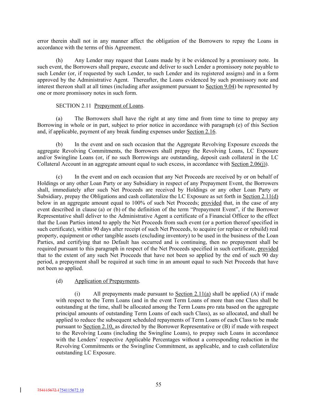 error therein shall not in any manner affect the obligation of the Borrowers to repay the Loans in accordance with the terms of this Agreement. (h) Any Lender may request that Loans made by it be evidenced by a promissory note. In such event, the Borrowers shall prepare, execute and deliver to such Lender a promissory note payable to such Lender (or, if requested by such Lender, to such Lender and its registered assigns) and in a form approved by the Administrative Agent. Thereafter, the Loans evidenced by such promissory note and interest thereon shall at all times (including after assignment pursuant to Section 9.04) be represented by one or more promissory notes in such form. SECTION 2.11 Prepayment of Loans. (a) The Borrowers shall have the right at any time and from time to time to prepay any Borrowing in whole or in part, subject to prior notice in accordance with paragraph (e) of this Section and, if applicable, payment of any break funding expenses under Section 2.16. (b) In the event and on such occasion that the Aggregate Revolving Exposure exceeds the aggregate Revolving Commitments, the Borrowers shall prepay the Revolving Loans, LC Exposure and/or Swingline Loans (or, if no such Borrowings are outstanding, deposit cash collateral in the LC Collateral Account in an aggregate amount equal to such excess, in accordance with Section 2.06(j)). (c) In the event and on each occasion that any Net Proceeds are received by or on behalf of Holdings or any other Loan Party or any Subsidiary in respect of any Prepayment Event, the Borrowers shall, immediately after such Net Proceeds are received by Holdings or any other Loan Party or Subsidiary, prepay the Obligations and cash collateralize the LC Exposure as set forth in Section 2.11(d) below in an aggregate amount equal to 100% of such Net Proceeds; provided that, in the case of any event described in clause (a) or (b) of the definition of the term “Prepayment Event”, if the Borrower Representative shall deliver to the Administrative Agent a certificate of a Financial Officer to the effect that the Loan Parties intend to apply the Net Proceeds from such event (or a portion thereof specified in such certificate), within 90 days after receipt of such Net Proceeds, to acquire (or replace or rebuild) real property, equipment or other tangible assets (excluding inventory) to be used in the business of the Loan Parties, and certifying that no Default has occurred and is continuing, then no prepayment shall be required pursuant to this paragraph in respect of the Net Proceeds specified in such certificate, provided that to the extent of any such Net Proceeds that have not been so applied by the end of such 90 day period, a prepayment shall be required at such time in an amount equal to such Net Proceeds that have not been so applied. (d) Application of Prepayments. (i) All prepayments made pursuant to Section 2.11(a) shall be applied (A) if made with respect to the Term Loans (and in the event Term Loans of more than one Class shall be outstanding at the time, shall be allocated among the Term Loans pro rata based on the aggregate principal amounts of outstanding Term Loans of each such Class), as so allocated, and shall be applied to reduce the subsequent scheduled repayments of Term Loans of each Class to be made pursuant to Section 2.10, as directed by the Borrower Representative or (B) if made with respect to the Revolving Loans (including the Swingline Loans), to prepay such Loans in accordance with the Lenders’ respective Applicable Percentages without a corresponding reduction in the Revolving Commitments or the Swingline Commitment, as applicable, and to cash collateralize outstanding LC Exposure. 55 754115672.1754115672.10