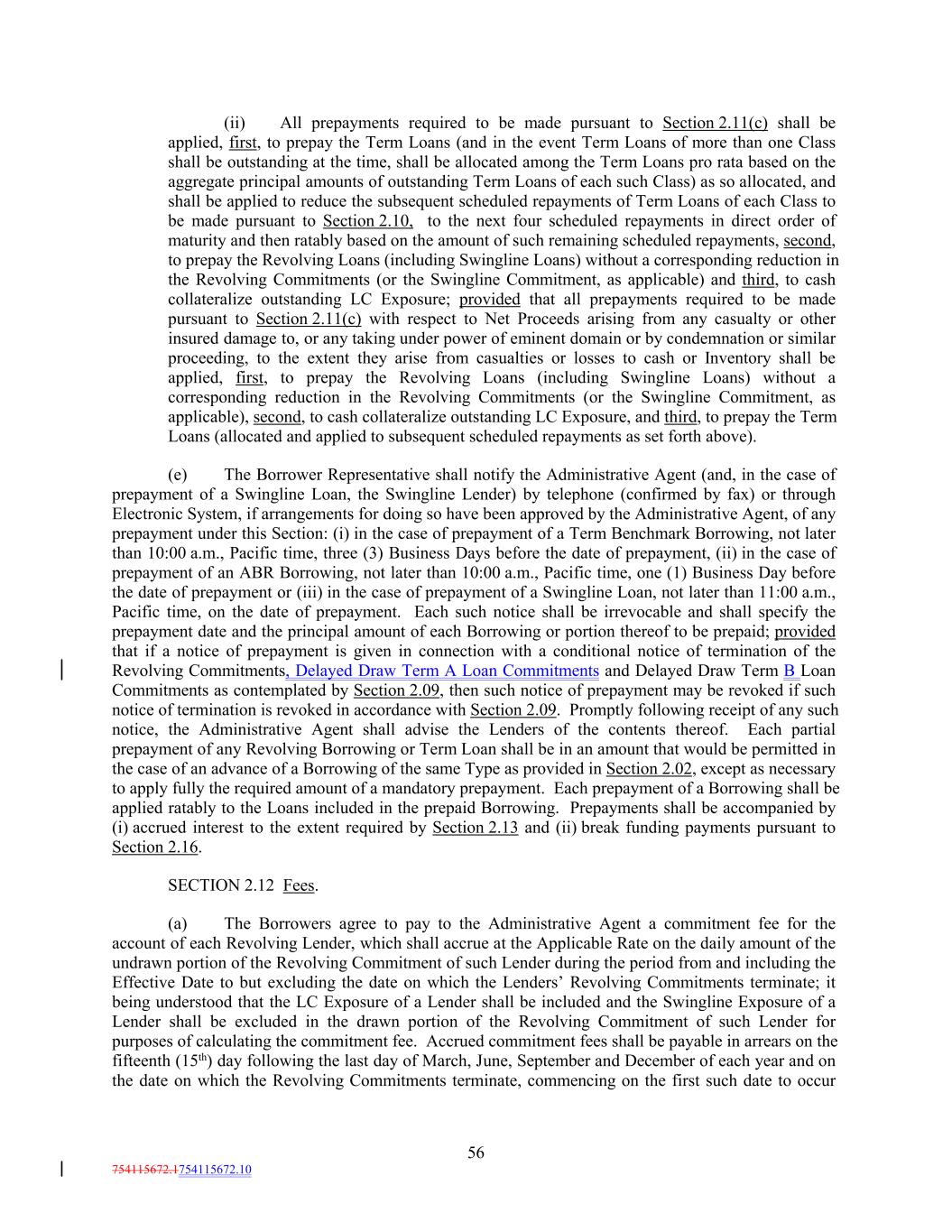(ii) All prepayments required to be made pursuant to Section 2.11(c) shall be applied, first, to prepay the Term Loans (and in the event Term Loans of more than one Class shall be outstanding at the time, shall be allocated among the Term Loans pro rata based on the aggregate principal amounts of outstanding Term Loans of each such Class) as so allocated, and shall be applied to reduce the subsequent scheduled repayments of Term Loans of each Class to be made pursuant to Section 2.10, to the next four scheduled repayments in direct order of maturity and then ratably based on the amount of such remaining scheduled repayments, second, to prepay the Revolving Loans (including Swingline Loans) without a corresponding reduction in the Revolving Commitments (or the Swingline Commitment, as applicable) and third, to cash collateralize outstanding LC Exposure; provided that all prepayments required to be made pursuant to Section 2.11(c) with respect to Net Proceeds arising from any casualty or other insured damage to, or any taking under power of eminent domain or by condemnation or similar proceeding, to the extent they arise from casualties or losses to cash or Inventory shall be applied, first, to prepay the Revolving Loans (including Swingline Loans) without a corresponding reduction in the Revolving Commitments (or the Swingline Commitment, as applicable), second, to cash collateralize outstanding LC Exposure, and third, to prepay the Term Loans (allocated and applied to subsequent scheduled repayments as set forth above). (e) The Borrower Representative shall notify the Administrative Agent (and, in the case of prepayment of a Swingline Loan, the Swingline Lender) by telephone (confirmed by fax) or through Electronic System, if arrangements for doing so have been approved by the Administrative Agent, of any prepayment under this Section: (i) in the case of prepayment of a Term Benchmark Borrowing, not later than 10:00 a.m., Pacific time, three (3) Business Days before the date of prepayment, (ii) in the case of prepayment of an ABR Borrowing, not later than 10:00 a.m., Pacific time, one (1) Business Day before the date of prepayment or (iii) in the case of prepayment of a Swingline Loan, not later than 11:00 a.m., Pacific time, on the date of prepayment. Each such notice shall be irrevocable and shall specify the prepayment date and the principal amount of each Borrowing or portion thereof to be prepaid; provided that if a notice of prepayment is given in connection with a conditional notice of termination of the Revolving Commitments, Delayed Draw Term A Loan Commitments and Delayed Draw Term B Loan Commitments as contemplated by Section 2.09, then such notice of prepayment may be revoked if such notice of termination is revoked in accordance with Section 2.09. Promptly following receipt of any such notice, the Administrative Agent shall advise the Lenders of the contents thereof. Each partial prepayment of any Revolving Borrowing or Term Loan shall be in an amount that would be permitted in the case of an advance of a Borrowing of the same Type as provided in Section 2.02, except as necessary to apply fully the required amount of a mandatory prepayment. Each prepayment of a Borrowing shall be applied ratably to the Loans included in the prepaid Borrowing. Prepayments shall be accompanied by (i) accrued interest to the extent required by Section 2.13 and (ii) break funding payments pursuant to Section 2.16. SECTION 2.12 Fees. (a) The Borrowers agree to pay to the Administrative Agent a commitment fee for the account of each Revolving Lender, which shall accrue at the Applicable Rate on the daily amount of the undrawn portion of the Revolving Commitment of such Lender during the period from and including the Effective Date to but excluding the date on which the Lenders’ Revolving Commitments terminate; it being understood that the LC Exposure of a Lender shall be included and the Swingline Exposure of a Lender shall be excluded in the drawn portion of the Revolving Commitment of such Lender for purposes of calculating the commitment fee. Accrued commitment fees shall be payable in arrears on the fifteenth (15th) day following the last day of March, June, September and December of each year and on the date on which the Revolving Commitments terminate, commencing on the first such date to occur 56 754115672.1754115672.10