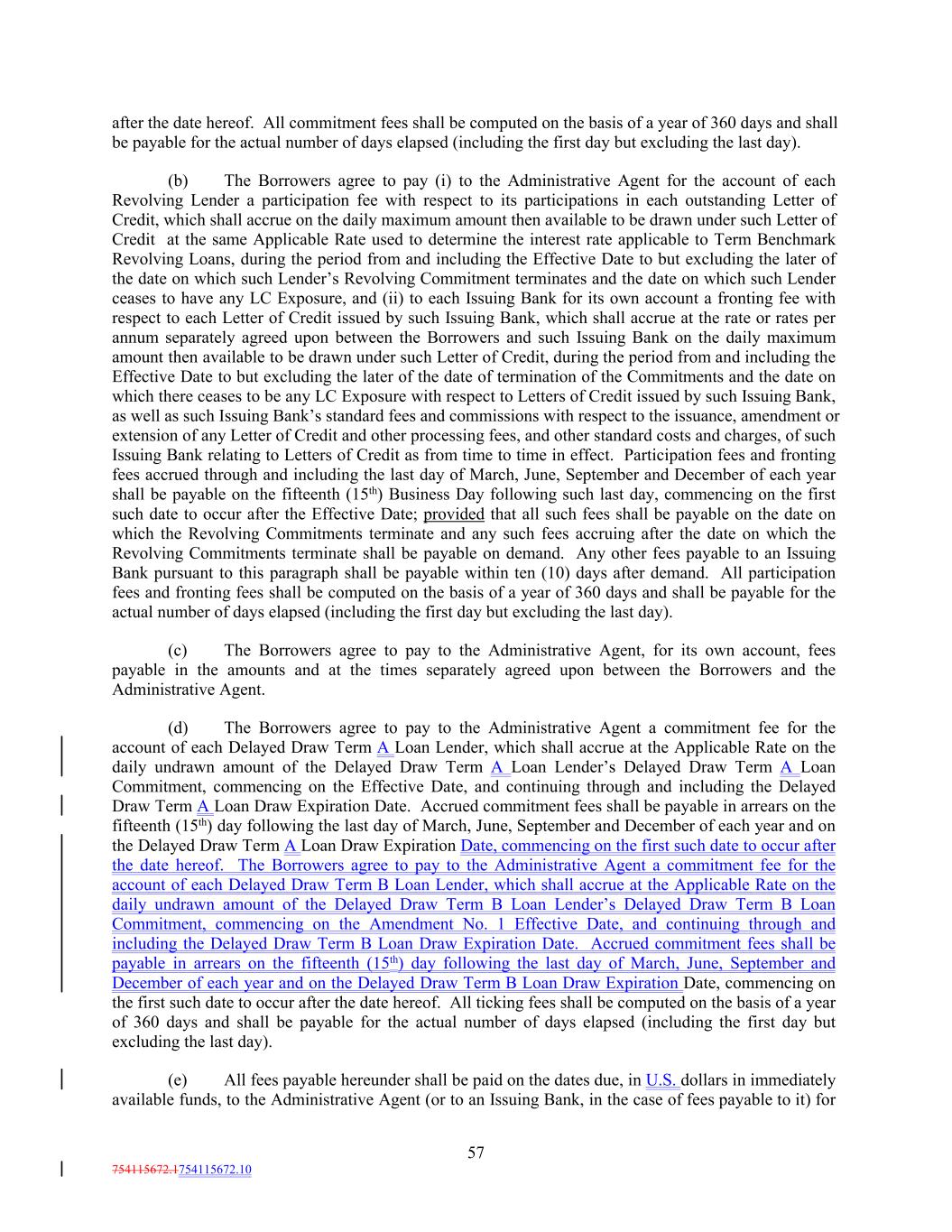 after the date hereof. All commitment fees shall be computed on the basis of a year of 360 days and shall be payable for the actual number of days elapsed (including the first day but excluding the last day). (b) The Borrowers agree to pay (i) to the Administrative Agent for the account of each Revolving Lender a participation fee with respect to its participations in each outstanding Letter of Credit, which shall accrue on the daily maximum amount then available to be drawn under such Letter of Credit at the same Applicable Rate used to determine the interest rate applicable to Term Benchmark Revolving Loans, during the period from and including the Effective Date to but excluding the later of the date on which such Lender’s Revolving Commitment terminates and the date on which such Lender ceases to have any LC Exposure, and (ii) to each Issuing Bank for its own account a fronting fee with respect to each Letter of Credit issued by such Issuing Bank, which shall accrue at the rate or rates per annum separately agreed upon between the Borrowers and such Issuing Bank on the daily maximum amount then available to be drawn under such Letter of Credit, during the period from and including the Effective Date to but excluding the later of the date of termination of the Commitments and the date on which there ceases to be any LC Exposure with respect to Letters of Credit issued by such Issuing Bank, as well as such Issuing Bank’s standard fees and commissions with respect to the issuance, amendment or extension of any Letter of Credit and other processing fees, and other standard costs and charges, of such Issuing Bank relating to Letters of Credit as from time to time in effect. Participation fees and fronting fees accrued through and including the last day of March, June, September and December of each year shall be payable on the fifteenth (15th) Business Day following such last day, commencing on the first such date to occur after the Effective Date; provided that all such fees shall be payable on the date on which the Revolving Commitments terminate and any such fees accruing after the date on which the Revolving Commitments terminate shall be payable on demand. Any other fees payable to an Issuing Bank pursuant to this paragraph shall be payable within ten (10) days after demand. All participation fees and fronting fees shall be computed on the basis of a year of 360 days and shall be payable for the actual number of days elapsed (including the first day but excluding the last day). (c) The Borrowers agree to pay to the Administrative Agent, for its own account, fees payable in the amounts and at the times separately agreed upon between the Borrowers and the Administrative Agent. (d) The Borrowers agree to pay to the Administrative Agent a commitment fee for the account of each Delayed Draw Term A Loan Lender, which shall accrue at the Applicable Rate on the daily undrawn amount of the Delayed Draw Term A Loan Lender’s Delayed Draw Term A Loan Commitment, commencing on the Effective Date, and continuing through and including the Delayed Draw Term A Loan Draw Expiration Date. Accrued commitment fees shall be payable in arrears on the fifteenth (15th) day following the last day of March, June, September and December of each year and on the Delayed Draw Term A Loan Draw Expiration Date, commencing on the first such date to occur after the date hereof. The Borrowers agree to pay to the Administrative Agent a commitment fee for the account of each Delayed Draw Term B Loan Lender, which shall accrue at the Applicable Rate on the daily undrawn amount of the Delayed Draw Term B Loan Lender’s Delayed Draw Term B Loan Commitment, commencing on the Amendment No. 1 Effective Date, and continuing through and including the Delayed Draw Term B Loan Draw Expiration Date. Accrued commitment fees shall be payable in arrears on the fifteenth (15th) day following the last day of March, June, September and December of each year and on the Delayed Draw Term B Loan Draw Expiration Date, commencing on the first such date to occur after the date hereof. All ticking fees shall be computed on the basis of a year of 360 days and shall be payable for the actual number of days elapsed (including the first day but excluding the last day). (e) All fees payable hereunder shall be paid on the dates due, in U.S. dollars in immediately available funds, to the Administrative Agent (or to an Issuing Bank, in the case of fees payable to it) for 57 754115672.1754115672.10