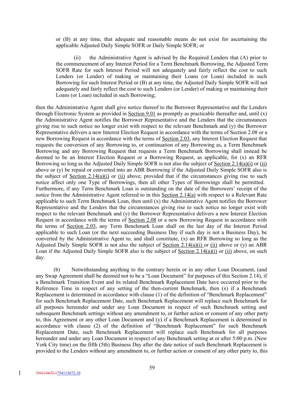 or (B) at any time, that adequate and reasonable means do not exist for ascertaining the applicable Adjusted Daily Simple SOFR or Daily Simple SOFR; or (ii) the Administrative Agent is advised by the Required Lenders that (A) prior to the commencement of any Interest Period for a Term Benchmark Borrowing, the Adjusted Term SOFR Rate for such Interest Period will not adequately and fairly reflect the cost to such Lenders (or Lender) of making or maintaining their Loans (or Loan) included in such Borrowing for such Interest Period or (B) at any time, the Adjusted Daily Simple SOFR will not adequately and fairly reflect the cost to such Lenders (or Lender) of making or maintaining their Loans (or Loan) included in such Borrowing; then the Administrative Agent shall give notice thereof to the Borrower Representative and the Lenders through Electronic System as provided in Section 9.01 as promptly as practicable thereafter and, until (x) the Administrative Agent notifies the Borrower Representative and the Lenders that the circumstances giving rise to such notice no longer exist with respect to the relevant Benchmark and (y) the Borrower Representative delivers a new Interest Election Request in accordance with the terms of Section 2.08 or a new Borrowing Request in accordance with the terms of Section 2.03, any Interest Election Request that requests the conversion of any Borrowing to, or continuation of any Borrowing as, a Term Benchmark Borrowing and any Borrowing Request that requests a Term Benchmark Borrowing shall instead be deemed to be an Interest Election Request or a Borrowing Request, as applicable, for (x) an RFR Borrowing so long as the Adjusted Daily Simple SOFR is not also the subject of Section 2.14(a)(i) or (ii) above or (y) be repaid or converted into an ABR Borrowing if the Adjusted Daily Simple SOFR also is the subject of Section 2.14(a)(i) or (ii) above; provided that if the circumstances giving rise to such notice affect only one Type of Borrowings, then all other Types of Borrowings shall be permitted. Furthermore, if any Term Benchmark Loan is outstanding on the date of the Borrowers’ receipt of the notice from the Administrative Agent referred to in this Section 2.14(a) with respect to a Relevant Rate applicable to such Term Benchmark Loan, then until (x) the Administrative Agent notifies the Borrower Representative and the Lenders that the circumstances giving rise to such notice no longer exist with respect to the relevant Benchmark and (y) the Borrower Representative delivers a new Interest Election Request in accordance with the terms of Section 2.08 or a new Borrowing Request in accordance with the terms of Section 2.03, any Term Benchmark Loan shall on the last day of the Interest Period applicable to such Loan (or the next succeeding Business Day if such day is not a Business Day), be converted by the Administrative Agent to, and shall constitute, (x) an RFR Borrowing so long as the Adjusted Daily Simple SOFR is not also the subject of Section 2.14(a)(i) or (ii) above or (y) an ABR Loan if the Adjusted Daily Simple SOFR also is the subject of Section 2.14(a)(i) or (ii) above, on such day. (b) Notwithstanding anything to the contrary herein or in any other Loan Document, (and any Swap Agreement shall be deemed not to be a “Loan Document” for purposes of this Section 2.14), if a Benchmark Transition Event and its related Benchmark Replacement Date have occurred prior to the Reference Time in respect of any setting of the then-current Benchmark, then (x) if a Benchmark Replacement is determined in accordance with clause (1) of the definition of “Benchmark Replacement” for such Benchmark Replacement Date, such Benchmark Replacement will replace such Benchmark for all purposes hereunder and under any Loan Document in respect of such Benchmark setting and subsequent Benchmark settings without any amendment to, or further action or consent of any other party to, this Agreement or any other Loan Document and (y) if a Benchmark Replacement is determined in accordance with clause (2) of the definition of “Benchmark Replacement” for such Benchmark Replacement Date, such Benchmark Replacement will replace such Benchmark for all purposes hereunder and under any Loan Document in respect of any Benchmark setting at or after 5:00 p.m. (New York City time) on the fifth (5th) Business Day after the date notice of such Benchmark Replacement is provided to the Lenders without any amendment to, or further action or consent of any other party to, this 59 754115672.1754115672.10