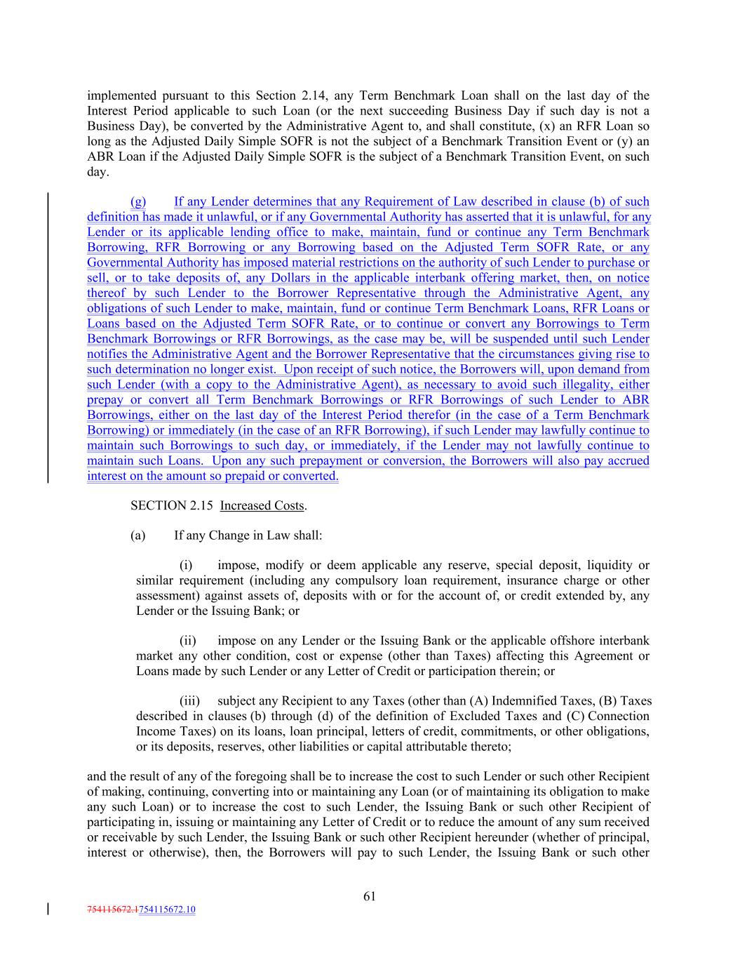 implemented pursuant to this Section 2.14, any Term Benchmark Loan shall on the last day of the Interest Period applicable to such Loan (or the next succeeding Business Day if such day is not a Business Day), be converted by the Administrative Agent to, and shall constitute, (x) an RFR Loan so long as the Adjusted Daily Simple SOFR is not the subject of a Benchmark Transition Event or (y) an ABR Loan if the Adjusted Daily Simple SOFR is the subject of a Benchmark Transition Event, on such day. (g) If any Lender determines that any Requirement of Law described in clause (b) of such definition has made it unlawful, or if any Governmental Authority has asserted that it is unlawful, for any Lender or its applicable lending office to make, maintain, fund or continue any Term Benchmark Borrowing, RFR Borrowing or any Borrowing based on the Adjusted Term SOFR Rate, or any Governmental Authority has imposed material restrictions on the authority of such Lender to purchase or sell, or to take deposits of, any Dollars in the applicable interbank offering market, then, on notice thereof by such Lender to the Borrower Representative through the Administrative Agent, any obligations of such Lender to make, maintain, fund or continue Term Benchmark Loans, RFR Loans or Loans based on the Adjusted Term SOFR Rate, or to continue or convert any Borrowings to Term Benchmark Borrowings or RFR Borrowings, as the case may be, will be suspended until such Lender notifies the Administrative Agent and the Borrower Representative that the circumstances giving rise to such determination no longer exist. Upon receipt of such notice, the Borrowers will, upon demand from such Lender (with a copy to the Administrative Agent), as necessary to avoid such illegality, either prepay or convert all Term Benchmark Borrowings or RFR Borrowings of such Lender to ABR Borrowings, either on the last day of the Interest Period therefor (in the case of a Term Benchmark Borrowing) or immediately (in the case of an RFR Borrowing), if such Lender may lawfully continue to maintain such Borrowings to such day, or immediately, if the Lender may not lawfully continue to maintain such Loans. Upon any such prepayment or conversion, the Borrowers will also pay accrued interest on the amount so prepaid or converted. SECTION 2.15 Increased Costs. (a) If any Change in Law shall: (i) impose, modify or deem applicable any reserve, special deposit, liquidity or similar requirement (including any compulsory loan requirement, insurance charge or other assessment) against assets of, deposits with or for the account of, or credit extended by, any Lender or the Issuing Bank; or (ii) impose on any Lender or the Issuing Bank or the applicable offshore interbank market any other condition, cost or expense (other than Taxes) affecting this Agreement or Loans made by such Lender or any Letter of Credit or participation therein; or (iii) subject any Recipient to any Taxes (other than (A) Indemnified Taxes, (B) Taxes described in clauses (b) through (d) of the definition of Excluded Taxes and (C) Connection Income Taxes) on its loans, loan principal, letters of credit, commitments, or other obligations, or its deposits, reserves, other liabilities or capital attributable thereto; and the result of any of the foregoing shall be to increase the cost to such Lender or such other Recipient of making, continuing, converting into or maintaining any Loan (or of maintaining its obligation to make any such Loan) or to increase the cost to such Lender, the Issuing Bank or such other Recipient of participating in, issuing or maintaining any Letter of Credit or to reduce the amount of any sum received or receivable by such Lender, the Issuing Bank or such other Recipient hereunder (whether of principal, interest or otherwise), then, the Borrowers will pay to such Lender, the Issuing Bank or such other 61 754115672.1754115672.10
