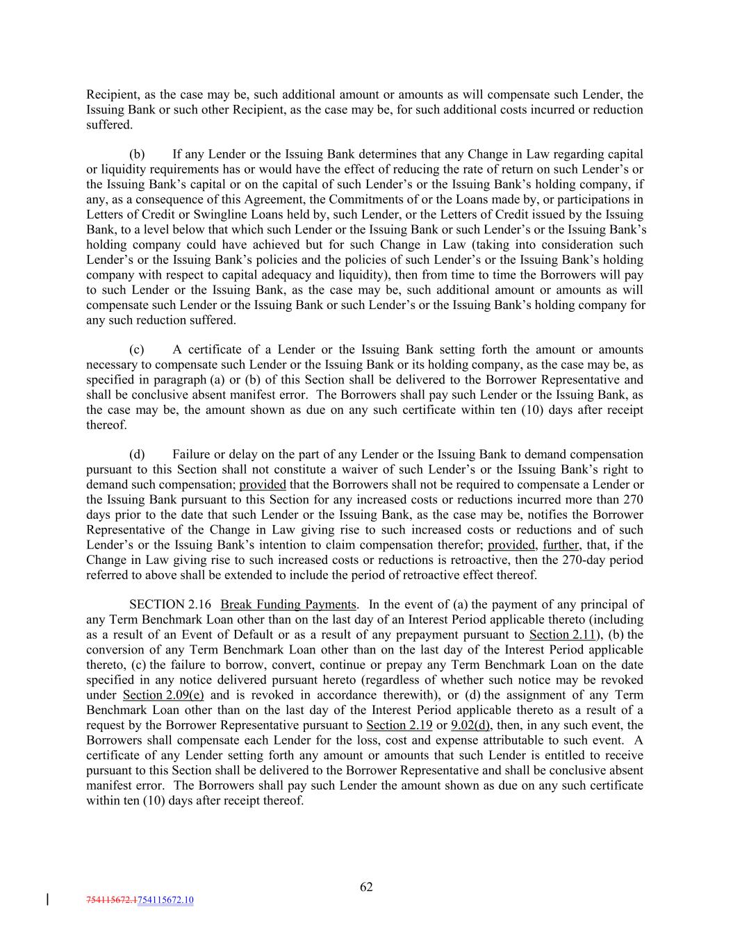 Recipient, as the case may be, such additional amount or amounts as will compensate such Lender, the Issuing Bank or such other Recipient, as the case may be, for such additional costs incurred or reduction suffered. (b) If any Lender or the Issuing Bank determines that any Change in Law regarding capital or liquidity requirements has or would have the effect of reducing the rate of return on such Lender’s or the Issuing Bank’s capital or on the capital of such Lender’s or the Issuing Bank’s holding company, if any, as a consequence of this Agreement, the Commitments of or the Loans made by, or participations in Letters of Credit or Swingline Loans held by, such Lender, or the Letters of Credit issued by the Issuing Bank, to a level below that which such Lender or the Issuing Bank or such Lender’s or the Issuing Bank’s holding company could have achieved but for such Change in Law (taking into consideration such Lender’s or the Issuing Bank’s policies and the policies of such Lender’s or the Issuing Bank’s holding company with respect to capital adequacy and liquidity), then from time to time the Borrowers will pay to such Lender or the Issuing Bank, as the case may be, such additional amount or amounts as will compensate such Lender or the Issuing Bank or such Lender’s or the Issuing Bank’s holding company for any such reduction suffered. (c) A certificate of a Lender or the Issuing Bank setting forth the amount or amounts necessary to compensate such Lender or the Issuing Bank or its holding company, as the case may be, as specified in paragraph (a) or (b) of this Section shall be delivered to the Borrower Representative and shall be conclusive absent manifest error. The Borrowers shall pay such Lender or the Issuing Bank, as the case may be, the amount shown as due on any such certificate within ten (10) days after receipt thereof. (d) Failure or delay on the part of any Lender or the Issuing Bank to demand compensation pursuant to this Section shall not constitute a waiver of such Lender’s or the Issuing Bank’s right to demand such compensation; provided that the Borrowers shall not be required to compensate a Lender or the Issuing Bank pursuant to this Section for any increased costs or reductions incurred more than 270 days prior to the date that such Lender or the Issuing Bank, as the case may be, notifies the Borrower Representative of the Change in Law giving rise to such increased costs or reductions and of such Lender’s or the Issuing Bank’s intention to claim compensation therefor; provided, further, that, if the Change in Law giving rise to such increased costs or reductions is retroactive, then the 270-day period referred to above shall be extended to include the period of retroactive effect thereof. SECTION 2.16 Break Funding Payments. In the event of (a) the payment of any principal of any Term Benchmark Loan other than on the last day of an Interest Period applicable thereto (including as a result of an Event of Default or as a result of any prepayment pursuant to Section 2.11), (b) the conversion of any Term Benchmark Loan other than on the last day of the Interest Period applicable thereto, (c) the failure to borrow, convert, continue or prepay any Term Benchmark Loan on the date specified in any notice delivered pursuant hereto (regardless of whether such notice may be revoked under Section 2.09(e) and is revoked in accordance therewith), or (d) the assignment of any Term Benchmark Loan other than on the last day of the Interest Period applicable thereto as a result of a request by the Borrower Representative pursuant to Section 2.19 or 9.02(d), then, in any such event, the Borrowers shall compensate each Lender for the loss, cost and expense attributable to such event. A certificate of any Lender setting forth any amount or amounts that such Lender is entitled to receive pursuant to this Section shall be delivered to the Borrower Representative and shall be conclusive absent manifest error. The Borrowers shall pay such Lender the amount shown as due on any such certificate within ten (10) days after receipt thereof. 62 754115672.1754115672.10