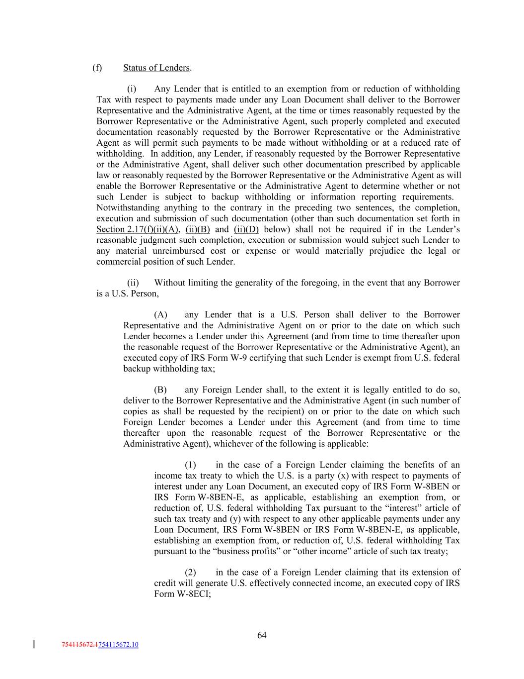 (f) Status of Lenders. (i) Any Lender that is entitled to an exemption from or reduction of withholding Tax with respect to payments made under any Loan Document shall deliver to the Borrower Representative and the Administrative Agent, at the time or times reasonably requested by the Borrower Representative or the Administrative Agent, such properly completed and executed documentation reasonably requested by the Borrower Representative or the Administrative Agent as will permit such payments to be made without withholding or at a reduced rate of withholding. In addition, any Lender, if reasonably requested by the Borrower Representative or the Administrative Agent, shall deliver such other documentation prescribed by applicable law or reasonably requested by the Borrower Representative or the Administrative Agent as will enable the Borrower Representative or the Administrative Agent to determine whether or not such Lender is subject to backup withholding or information reporting requirements. Notwithstanding anything to the contrary in the preceding two sentences, the completion, execution and submission of such documentation (other than such documentation set forth in Section 2.17(f)(ii)(A), (ii)(B) and (ii)(D) below) shall not be required if in the Lender’s reasonable judgment such completion, execution or submission would subject such Lender to any material unreimbursed cost or expense or would materially prejudice the legal or commercial position of such Lender. (ii) Without limiting the generality of the foregoing, in the event that any Borrower is a U.S. Person, (A) any Lender that is a U.S. Person shall deliver to the Borrower Representative and the Administrative Agent on or prior to the date on which such Lender becomes a Lender under this Agreement (and from time to time thereafter upon the reasonable request of the Borrower Representative or the Administrative Agent), an executed copy of IRS Form W-9 certifying that such Lender is exempt from U.S. federal backup withholding tax; (B) any Foreign Lender shall, to the extent it is legally entitled to do so, deliver to the Borrower Representative and the Administrative Agent (in such number of copies as shall be requested by the recipient) on or prior to the date on which such Foreign Lender becomes a Lender under this Agreement (and from time to time thereafter upon the reasonable request of the Borrower Representative or the Administrative Agent), whichever of the following is applicable: (1) in the case of a Foreign Lender claiming the benefits of an income tax treaty to which the U.S. is a party (x) with respect to payments of interest under any Loan Document, an executed copy of IRS Form W-8BEN or IRS Form W-8BEN-E, as applicable, establishing an exemption from, or reduction of, U.S. federal withholding Tax pursuant to the “interest” article of such tax treaty and (y) with respect to any other applicable payments under any Loan Document, IRS Form W-8BEN or IRS Form W-8BEN-E, as applicable, establishing an exemption from, or reduction of, U.S. federal withholding Tax pursuant to the “business profits” or “other income” article of such tax treaty; (2) in the case of a Foreign Lender claiming that its extension of credit will generate U.S. effectively connected income, an executed copy of IRS Form W-8ECI; 64 754115672.1754115672.10