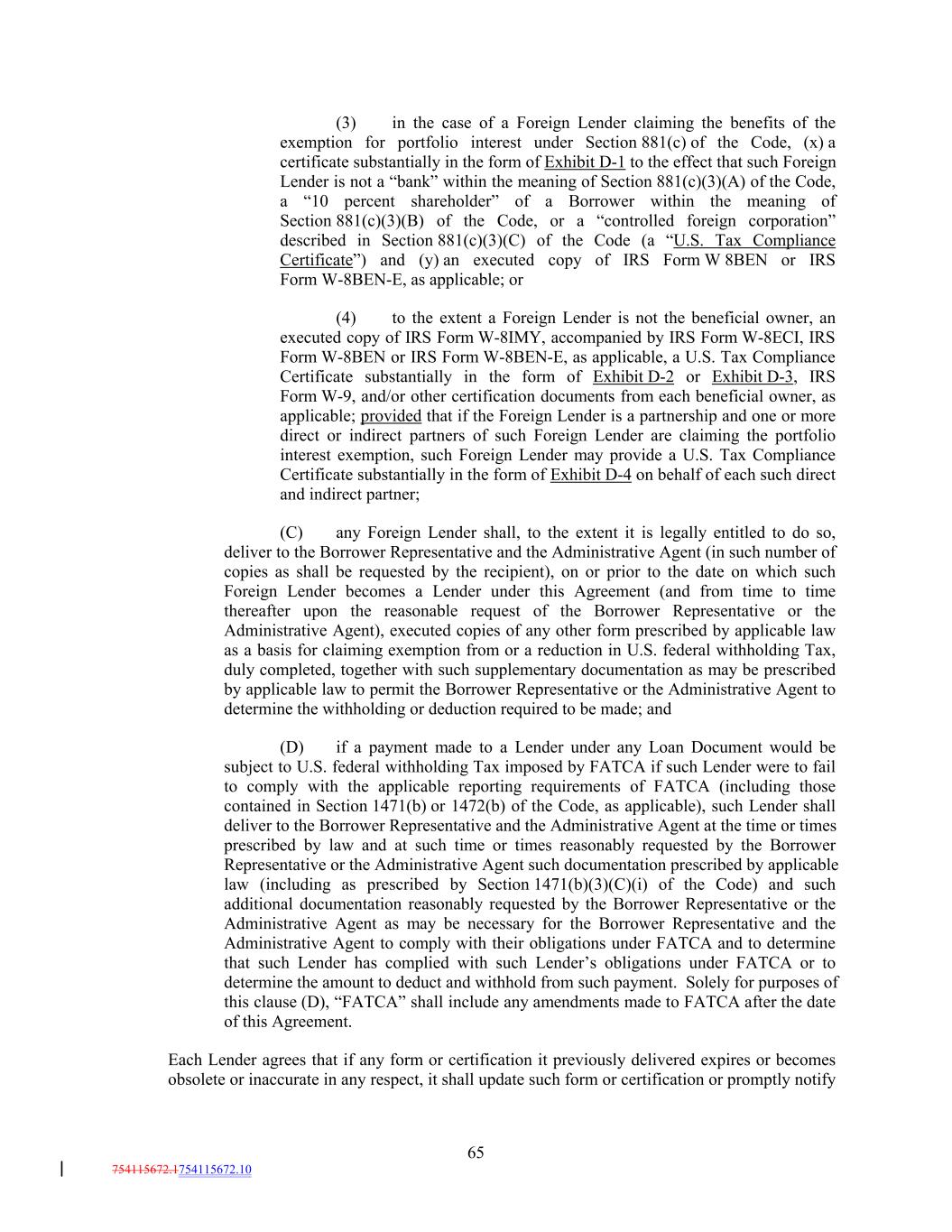 (3) in the case of a Foreign Lender claiming the benefits of the exemption for portfolio interest under Section 881(c) of the Code, (x) a certificate substantially in the form of Exhibit D-1 to the effect that such Foreign Lender is not a “bank” within the meaning of Section 881(c)(3)(A) of the Code, a “10 percent shareholder” of a Borrower within the meaning of Section 881(c)(3)(B) of the Code, or a “controlled foreign corporation” described in Section 881(c)(3)(C) of the Code (a “U.S. Tax Compliance Certificate”) and (y) an executed copy of IRS Form W 8BEN or IRS Form W-8BEN-E, as applicable; or (4) to the extent a Foreign Lender is not the beneficial owner, an executed copy of IRS Form W-8IMY, accompanied by IRS Form W-8ECI, IRS Form W-8BEN or IRS Form W-8BEN-E, as applicable, a U.S. Tax Compliance Certificate substantially in the form of Exhibit D-2 or Exhibit D-3, IRS Form W-9, and/or other certification documents from each beneficial owner, as applicable; provided that if the Foreign Lender is a partnership and one or more direct or indirect partners of such Foreign Lender are claiming the portfolio interest exemption, such Foreign Lender may provide a U.S. Tax Compliance Certificate substantially in the form of Exhibit D-4 on behalf of each such direct and indirect partner; (C) any Foreign Lender shall, to the extent it is legally entitled to do so, deliver to the Borrower Representative and the Administrative Agent (in such number of copies as shall be requested by the recipient), on or prior to the date on which such Foreign Lender becomes a Lender under this Agreement (and from time to time thereafter upon the reasonable request of the Borrower Representative or the Administrative Agent), executed copies of any other form prescribed by applicable law as a basis for claiming exemption from or a reduction in U.S. federal withholding Tax, duly completed, together with such supplementary documentation as may be prescribed by applicable law to permit the Borrower Representative or the Administrative Agent to determine the withholding or deduction required to be made; and (D) if a payment made to a Lender under any Loan Document would be subject to U.S. federal withholding Tax imposed by FATCA if such Lender were to fail to comply with the applicable reporting requirements of FATCA (including those contained in Section 1471(b) or 1472(b) of the Code, as applicable), such Lender shall deliver to the Borrower Representative and the Administrative Agent at the time or times prescribed by law and at such time or times reasonably requested by the Borrower Representative or the Administrative Agent such documentation prescribed by applicable law (including as prescribed by Section 1471(b)(3)(C)(i) of the Code) and such additional documentation reasonably requested by the Borrower Representative or the Administrative Agent as may be necessary for the Borrower Representative and the Administrative Agent to comply with their obligations under FATCA and to determine that such Lender has complied with such Lender’s obligations under FATCA or to determine the amount to deduct and withhold from such payment. Solely for purposes of this clause (D), “FATCA” shall include any amendments made to FATCA after the date of this Agreement. Each Lender agrees that if any form or certification it previously delivered expires or becomes obsolete or inaccurate in any respect, it shall update such form or certification or promptly notify 65 754115672.1754115672.10
