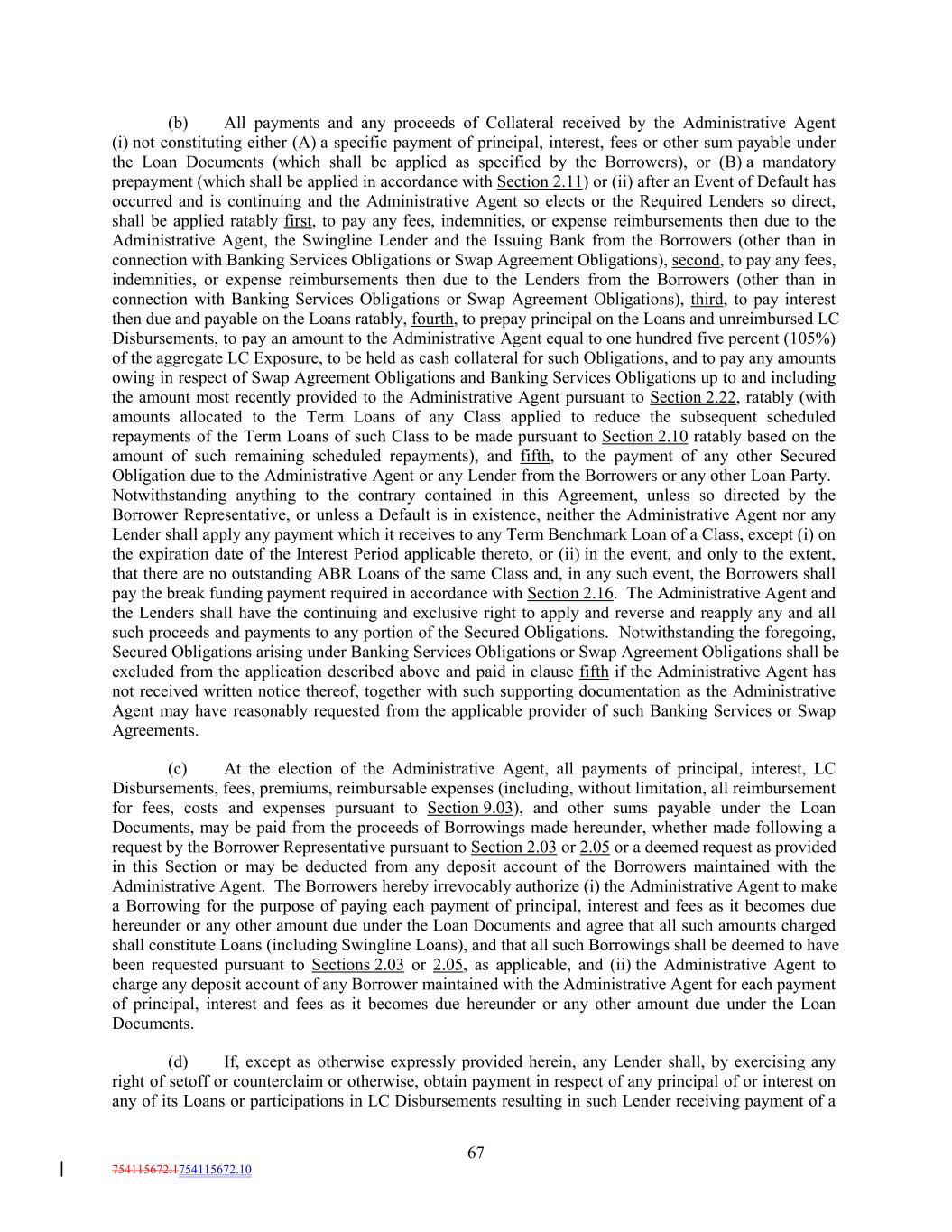 (b) All payments and any proceeds of Collateral received by the Administrative Agent (i) not constituting either (A) a specific payment of principal, interest, fees or other sum payable under the Loan Documents (which shall be applied as specified by the Borrowers), or (B) a mandatory prepayment (which shall be applied in accordance with Section 2.11) or (ii) after an Event of Default has occurred and is continuing and the Administrative Agent so elects or the Required Lenders so direct, shall be applied ratably first, to pay any fees, indemnities, or expense reimbursements then due to the Administrative Agent, the Swingline Lender and the Issuing Bank from the Borrowers (other than in connection with Banking Services Obligations or Swap Agreement Obligations), second, to pay any fees, indemnities, or expense reimbursements then due to the Lenders from the Borrowers (other than in connection with Banking Services Obligations or Swap Agreement Obligations), third, to pay interest then due and payable on the Loans ratably, fourth, to prepay principal on the Loans and unreimbursed LC Disbursements, to pay an amount to the Administrative Agent equal to one hundred five percent (105%) of the aggregate LC Exposure, to be held as cash collateral for such Obligations, and to pay any amounts owing in respect of Swap Agreement Obligations and Banking Services Obligations up to and including the amount most recently provided to the Administrative Agent pursuant to Section 2.22, ratably (with amounts allocated to the Term Loans of any Class applied to reduce the subsequent scheduled repayments of the Term Loans of such Class to be made pursuant to Section 2.10 ratably based on the amount of such remaining scheduled repayments), and fifth, to the payment of any other Secured Obligation due to the Administrative Agent or any Lender from the Borrowers or any other Loan Party. Notwithstanding anything to the contrary contained in this Agreement, unless so directed by the Borrower Representative, or unless a Default is in existence, neither the Administrative Agent nor any Lender shall apply any payment which it receives to any Term Benchmark Loan of a Class, except (i) on the expiration date of the Interest Period applicable thereto, or (ii) in the event, and only to the extent, that there are no outstanding ABR Loans of the same Class and, in any such event, the Borrowers shall pay the break funding payment required in accordance with Section 2.16. The Administrative Agent and the Lenders shall have the continuing and exclusive right to apply and reverse and reapply any and all such proceeds and payments to any portion of the Secured Obligations. Notwithstanding the foregoing, Secured Obligations arising under Banking Services Obligations or Swap Agreement Obligations shall be excluded from the application described above and paid in clause fifth if the Administrative Agent has not received written notice thereof, together with such supporting documentation as the Administrative Agent may have reasonably requested from the applicable provider of such Banking Services or Swap Agreements. (c) At the election of the Administrative Agent, all payments of principal, interest, LC Disbursements, fees, premiums, reimbursable expenses (including, without limitation, all reimbursement for fees, costs and expenses pursuant to Section 9.03), and other sums payable under the Loan Documents, may be paid from the proceeds of Borrowings made hereunder, whether made following a request by the Borrower Representative pursuant to Section 2.03 or 2.05 or a deemed request as provided in this Section or may be deducted from any deposit account of the Borrowers maintained with the Administrative Agent. The Borrowers hereby irrevocably authorize (i) the Administrative Agent to make a Borrowing for the purpose of paying each payment of principal, interest and fees as it becomes due hereunder or any other amount due under the Loan Documents and agree that all such amounts charged shall constitute Loans (including Swingline Loans), and that all such Borrowings shall be deemed to have been requested pursuant to Sections 2.03 or 2.05, as applicable, and (ii) the Administrative Agent to charge any deposit account of any Borrower maintained with the Administrative Agent for each payment of principal, interest and fees as it becomes due hereunder or any other amount due under the Loan Documents. (d) If, except as otherwise expressly provided herein, any Lender shall, by exercising any right of setoff or counterclaim or otherwise, obtain payment in respect of any principal of or interest on any of its Loans or participations in LC Disbursements resulting in such Lender receiving payment of a 67 754115672.1754115672.10