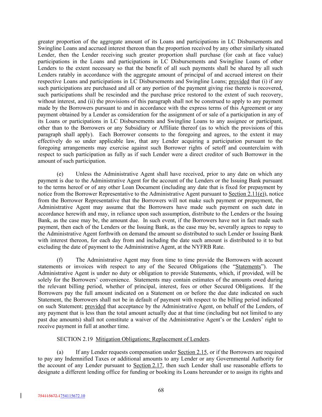 greater proportion of the aggregate amount of its Loans and participations in LC Disbursements and Swingline Loans and accrued interest thereon than the proportion received by any other similarly situated Lender, then the Lender receiving such greater proportion shall purchase (for cash at face value) participations in the Loans and participations in LC Disbursements and Swingline Loans of other Lenders to the extent necessary so that the benefit of all such payments shall be shared by all such Lenders ratably in accordance with the aggregate amount of principal of and accrued interest on their respective Loans and participations in LC Disbursements and Swingline Loans; provided that (i) if any such participations are purchased and all or any portion of the payment giving rise thereto is recovered, such participations shall be rescinded and the purchase price restored to the extent of such recovery, without interest, and (ii) the provisions of this paragraph shall not be construed to apply to any payment made by the Borrowers pursuant to and in accordance with the express terms of this Agreement or any payment obtained by a Lender as consideration for the assignment of or sale of a participation in any of its Loans or participations in LC Disbursements and Swingline Loans to any assignee or participant, other than to the Borrowers or any Subsidiary or Affiliate thereof (as to which the provisions of this paragraph shall apply). Each Borrower consents to the foregoing and agrees, to the extent it may effectively do so under applicable law, that any Lender acquiring a participation pursuant to the foregoing arrangements may exercise against such Borrower rights of setoff and counterclaim with respect to such participation as fully as if such Lender were a direct creditor of such Borrower in the amount of such participation. (e) Unless the Administrative Agent shall have received, prior to any date on which any payment is due to the Administrative Agent for the account of the Lenders or the Issuing Bank pursuant to the terms hereof or of any other Loan Document (including any date that is fixed for prepayment by notice from the Borrower Representative to the Administrative Agent pursuant to Section 2.11(e)), notice from the Borrower Representative that the Borrowers will not make such payment or prepayment, the Administrative Agent may assume that the Borrowers have made such payment on such date in accordance herewith and may, in reliance upon such assumption, distribute to the Lenders or the Issuing Bank, as the case may be, the amount due. In such event, if the Borrowers have not in fact made such payment, then each of the Lenders or the Issuing Bank, as the case may be, severally agrees to repay to the Administrative Agent forthwith on demand the amount so distributed to such Lender or Issuing Bank with interest thereon, for each day from and including the date such amount is distributed to it to but excluding the date of payment to the Administrative Agent, at the NYFRB Rate. (f) The Administrative Agent may from time to time provide the Borrowers with account statements or invoices with respect to any of the Secured Obligations (the “Statements”). The Administrative Agent is under no duty or obligation to provide Statements, which, if provided, will be solely for the Borrowers’ convenience. Statements may contain estimates of the amounts owed during the relevant billing period, whether of principal, interest, fees or other Secured Obligations. If the Borrowers pay the full amount indicated on a Statement on or before the due date indicated on such Statement, the Borrowers shall not be in default of payment with respect to the billing period indicated on such Statement; provided that acceptance by the Administrative Agent, on behalf of the Lenders, of any payment that is less than the total amount actually due at that time (including but not limited to any past due amounts) shall not constitute a waiver of the Administrative Agent’s or the Lenders’ right to receive payment in full at another time. SECTION 2.19 Mitigation Obligations; Replacement of Lenders. (a) If any Lender requests compensation under Section 2.15, or if the Borrowers are required to pay any Indemnified Taxes or additional amounts to any Lender or any Governmental Authority for the account of any Lender pursuant to Section 2.17, then such Lender shall use reasonable efforts to designate a different lending office for funding or booking its Loans hereunder or to assign its rights and 68 754115672.1754115672.10