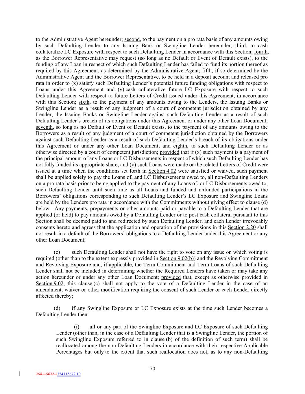 to the Administrative Agent hereunder; second, to the payment on a pro rata basis of any amounts owing by such Defaulting Lender to any Issuing Bank or Swingline Lender hereunder; third, to cash collateralize LC Exposure with respect to such Defaulting Lender in accordance with this Section; fourth, as the Borrower Representative may request (so long as no Default or Event of Default exists), to the funding of any Loan in respect of which such Defaulting Lender has failed to fund its portion thereof as required by this Agreement, as determined by the Administrative Agent; fifth, if so determined by the Administrative Agent and the Borrower Representative, to be held in a deposit account and released pro rata in order to (x) satisfy such Defaulting Lender’s potential future funding obligations with respect to Loans under this Agreement and (y) cash collateralize future LC Exposure with respect to such Defaulting Lender with respect to future Letters of Credit issued under this Agreement, in accordance with this Section; sixth, to the payment of any amounts owing to the Lenders, the Issuing Banks or Swingline Lender as a result of any judgment of a court of competent jurisdiction obtained by any Lender, the Issuing Banks or Swingline Lender against such Defaulting Lender as a result of such Defaulting Lender’s breach of its obligations under this Agreement or under any other Loan Document; seventh, so long as no Default or Event of Default exists, to the payment of any amounts owing to the Borrowers as a result of any judgment of a court of competent jurisdiction obtained by the Borrowers against such Defaulting Lender as a result of such Defaulting Lender’s breach of its obligations under this Agreement or under any other Loan Document; and eighth, to such Defaulting Lender or as otherwise directed by a court of competent jurisdiction; provided that if (x) such payment is a payment of the principal amount of any Loans or LC Disbursements in respect of which such Defaulting Lender has not fully funded its appropriate share, and (y) such Loans were made or the related Letters of Credit were issued at a time when the conditions set forth in Section 4.02 were satisfied or waived, such payment shall be applied solely to pay the Loans of, and LC Disbursements owed to, all non-Defaulting Lenders on a pro rata basis prior to being applied to the payment of any Loans of, or LC Disbursements owed to, such Defaulting Lender until such time as all Loans and funded and unfunded participations in the Borrowers’ obligations corresponding to such Defaulting Lender’s LC Exposure and Swingline Loans are held by the Lenders pro rata in accordance with the Commitments without giving effect to clause (d) below. Any payments, prepayments or other amounts paid or payable to a Defaulting Lender that are applied (or held) to pay amounts owed by a Defaulting Lender or to post cash collateral pursuant to this Section shall be deemed paid to and redirected by such Defaulting Lender, and each Lender irrevocably consents hereto and agrees that the application and operation of the provisions in this Section 2.20 shall not result in a default of the Borrowers’ obligations to a Defaulting Lender under this Agreement or any other Loan Document; (c) such Defaulting Lender shall not have the right to vote on any issue on which voting is required (other than to the extent expressly provided in Section 9.02(b)) and the Revolving Commitment and Revolving Exposure and, if applicable, the Term Commitment and Term Loans of such Defaulting Lender shall not be included in determining whether the Required Lenders have taken or may take any action hereunder or under any other Loan Document; provided that, except as otherwise provided in Section 9.02, this clause (c) shall not apply to the vote of a Defaulting Lender in the case of an amendment, waiver or other modification requiring the consent of such Lender or each Lender directly affected thereby; (d) if any Swingline Exposure or LC Exposure exists at the time such Lender becomes a Defaulting Lender then: (i) all or any part of the Swingline Exposure and LC Exposure of such Defaulting Lender (other than, in the case of a Defaulting Lender that is a Swingline Lender, the portion of such Swingline Exposure referred to in clause (b) of the definition of such term) shall be reallocated among the non-Defaulting Lenders in accordance with their respective Applicable Percentages but only to the extent that such reallocation does not, as to any non-Defaulting 70 754115672.1754115672.10