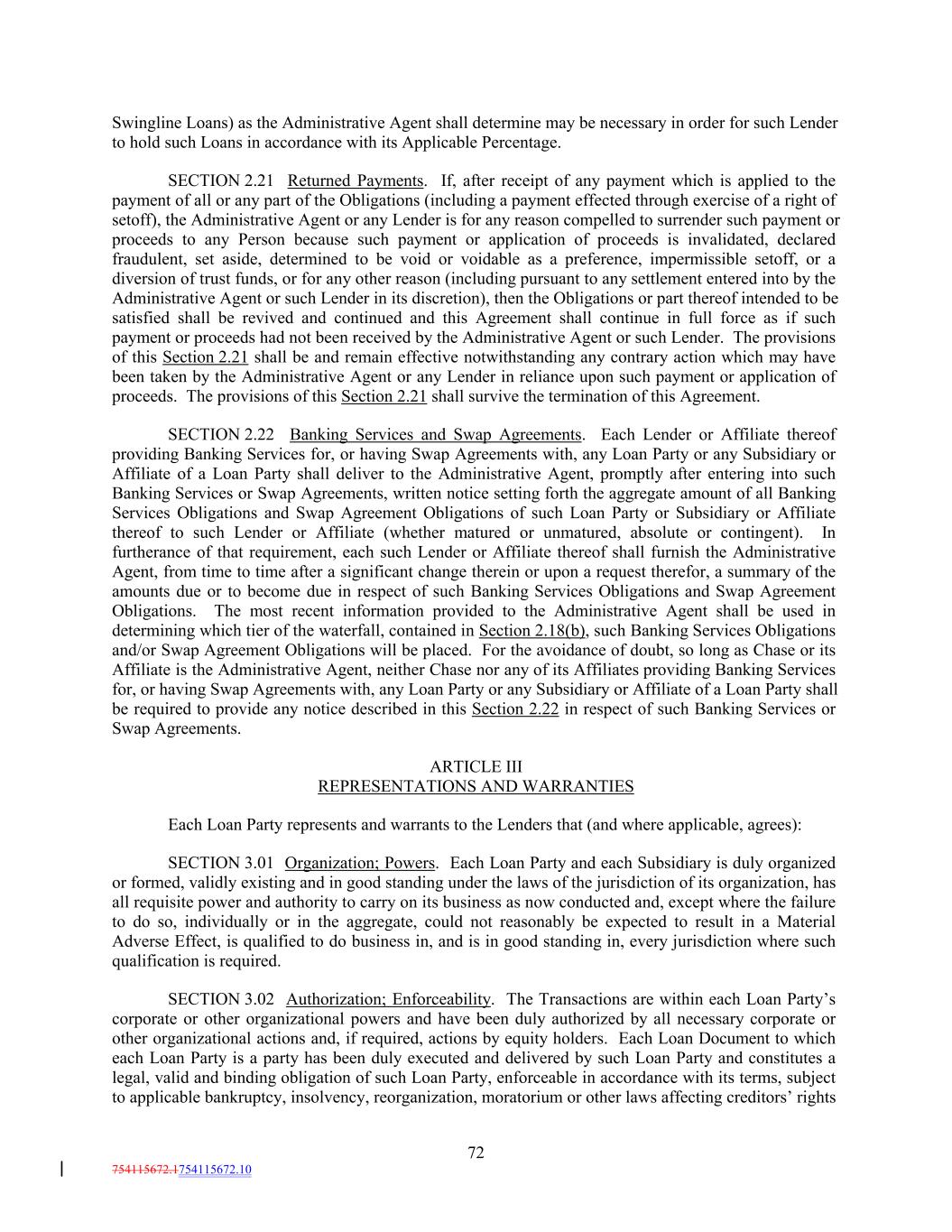 Swingline Loans) as the Administrative Agent shall determine may be necessary in order for such Lender to hold such Loans in accordance with its Applicable Percentage. SECTION 2.21 Returned Payments. If, after receipt of any payment which is applied to the payment of all or any part of the Obligations (including a payment effected through exercise of a right of setoff), the Administrative Agent or any Lender is for any reason compelled to surrender such payment or proceeds to any Person because such payment or application of proceeds is invalidated, declared fraudulent, set aside, determined to be void or voidable as a preference, impermissible setoff, or a diversion of trust funds, or for any other reason (including pursuant to any settlement entered into by the Administrative Agent or such Lender in its discretion), then the Obligations or part thereof intended to be satisfied shall be revived and continued and this Agreement shall continue in full force as if such payment or proceeds had not been received by the Administrative Agent or such Lender. The provisions of this Section 2.21 shall be and remain effective notwithstanding any contrary action which may have been taken by the Administrative Agent or any Lender in reliance upon such payment or application of proceeds. The provisions of this Section 2.21 shall survive the termination of this Agreement. SECTION 2.22 Banking Services and Swap Agreements. Each Lender or Affiliate thereof providing Banking Services for, or having Swap Agreements with, any Loan Party or any Subsidiary or Affiliate of a Loan Party shall deliver to the Administrative Agent, promptly after entering into such Banking Services or Swap Agreements, written notice setting forth the aggregate amount of all Banking Services Obligations and Swap Agreement Obligations of such Loan Party or Subsidiary or Affiliate thereof to such Lender or Affiliate (whether matured or unmatured, absolute or contingent). In furtherance of that requirement, each such Lender or Affiliate thereof shall furnish the Administrative Agent, from time to time after a significant change therein or upon a request therefor, a summary of the amounts due or to become due in respect of such Banking Services Obligations and Swap Agreement Obligations. The most recent information provided to the Administrative Agent shall be used in determining which tier of the waterfall, contained in Section 2.18(b), such Banking Services Obligations and/or Swap Agreement Obligations will be placed. For the avoidance of doubt, so long as Chase or its Affiliate is the Administrative Agent, neither Chase nor any of its Affiliates providing Banking Services for, or having Swap Agreements with, any Loan Party or any Subsidiary or Affiliate of a Loan Party shall be required to provide any notice described in this Section 2.22 in respect of such Banking Services or Swap Agreements. ARTICLE III REPRESENTATIONS AND WARRANTIES Each Loan Party represents and warrants to the Lenders that (and where applicable, agrees): SECTION 3.01 Organization; Powers. Each Loan Party and each Subsidiary is duly organized or formed, validly existing and in good standing under the laws of the jurisdiction of its organization, has all requisite power and authority to carry on its business as now conducted and, except where the failure to do so, individually or in the aggregate, could not reasonably be expected to result in a Material Adverse Effect, is qualified to do business in, and is in good standing in, every jurisdiction where such qualification is required. SECTION 3.02 Authorization; Enforceability. The Transactions are within each Loan Party’s corporate or other organizational powers and have been duly authorized by all necessary corporate or other organizational actions and, if required, actions by equity holders. Each Loan Document to which each Loan Party is a party has been duly executed and delivered by such Loan Party and constitutes a legal, valid and binding obligation of such Loan Party, enforceable in accordance with its terms, subject to applicable bankruptcy, insolvency, reorganization, moratorium or other laws affecting creditors’ rights 72 754115672.1754115672.10