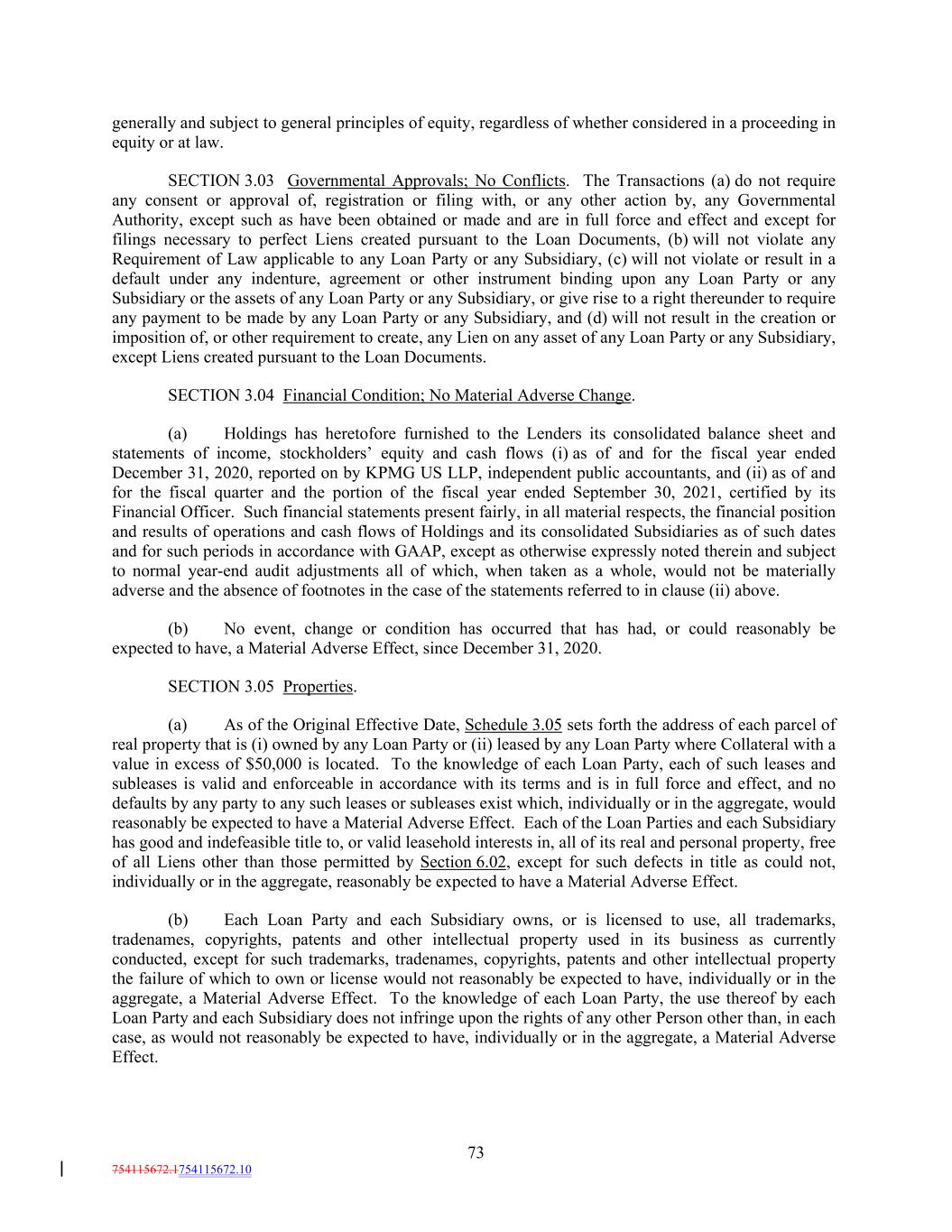 generally and subject to general principles of equity, regardless of whether considered in a proceeding in equity or at law. SECTION 3.03 Governmental Approvals; No Conflicts. The Transactions (a) do not require any consent or approval of, registration or filing with, or any other action by, any Governmental Authority, except such as have been obtained or made and are in full force and effect and except for filings necessary to perfect Liens created pursuant to the Loan Documents, (b) will not violate any Requirement of Law applicable to any Loan Party or any Subsidiary, (c) will not violate or result in a default under any indenture, agreement or other instrument binding upon any Loan Party or any Subsidiary or the assets of any Loan Party or any Subsidiary, or give rise to a right thereunder to require any payment to be made by any Loan Party or any Subsidiary, and (d) will not result in the creation or imposition of, or other requirement to create, any Lien on any asset of any Loan Party or any Subsidiary, except Liens created pursuant to the Loan Documents. SECTION 3.04 Financial Condition; No Material Adverse Change. (a) Holdings has heretofore furnished to the Lenders its consolidated balance sheet and statements of income, stockholders’ equity and cash flows (i) as of and for the fiscal year ended December 31, 2020, reported on by KPMG US LLP, independent public accountants, and (ii) as of and for the fiscal quarter and the portion of the fiscal year ended September 30, 2021, certified by its Financial Officer. Such financial statements present fairly, in all material respects, the financial position and results of operations and cash flows of Holdings and its consolidated Subsidiaries as of such dates and for such periods in accordance with GAAP, except as otherwise expressly noted therein and subject to normal year-end audit adjustments all of which, when taken as a whole, would not be materially adverse and the absence of footnotes in the case of the statements referred to in clause (ii) above. (b) No event, change or condition has occurred that has had, or could reasonably be expected to have, a Material Adverse Effect, since December 31, 2020. SECTION 3.05 Properties. (a) As of the Original Effective Date, Schedule 3.05 sets forth the address of each parcel of real property that is (i) owned by any Loan Party or (ii) leased by any Loan Party where Collateral with a value in excess of $50,000 is located. To the knowledge of each Loan Party, each of such leases and subleases is valid and enforceable in accordance with its terms and is in full force and effect, and no defaults by any party to any such leases or subleases exist which, individually or in the aggregate, would reasonably be expected to have a Material Adverse Effect. Each of the Loan Parties and each Subsidiary has good and indefeasible title to, or valid leasehold interests in, all of its real and personal property, free of all Liens other than those permitted by Section 6.02, except for such defects in title as could not, individually or in the aggregate, reasonably be expected to have a Material Adverse Effect. (b) Each Loan Party and each Subsidiary owns, or is licensed to use, all trademarks, tradenames, copyrights, patents and other intellectual property used in its business as currently conducted, except for such trademarks, tradenames, copyrights, patents and other intellectual property the failure of which to own or license would not reasonably be expected to have, individually or in the aggregate, a Material Adverse Effect. To the knowledge of each Loan Party, the use thereof by each Loan Party and each Subsidiary does not infringe upon the rights of any other Person other than, in each case, as would not reasonably be expected to have, individually or in the aggregate, a Material Adverse Effect. 73 754115672.1754115672.10