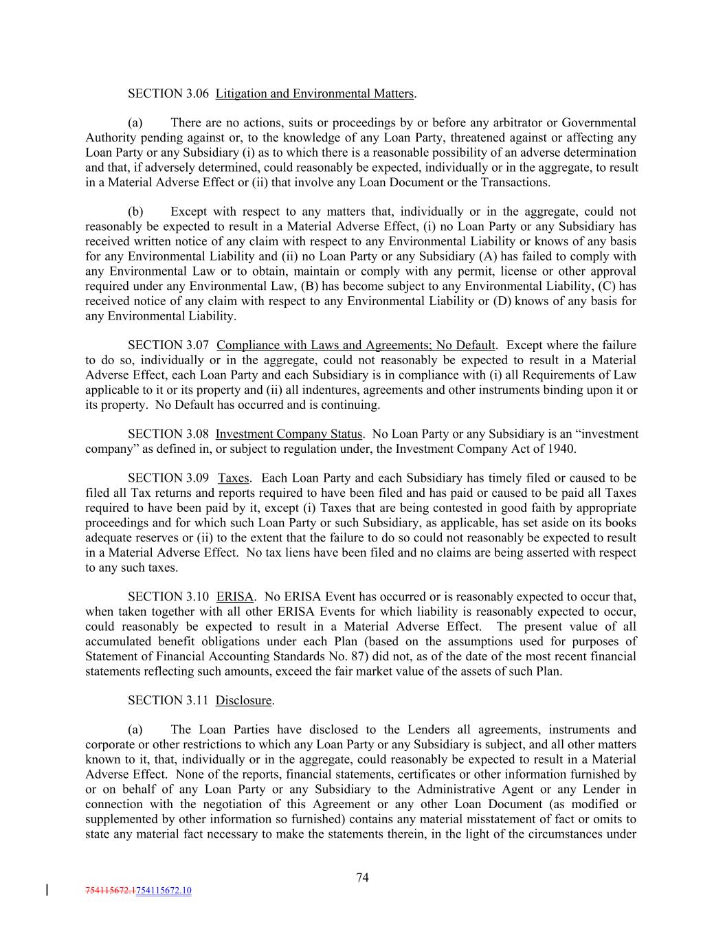 SECTION 3.06 Litigation and Environmental Matters. (a) There are no actions, suits or proceedings by or before any arbitrator or Governmental Authority pending against or, to the knowledge of any Loan Party, threatened against or affecting any Loan Party or any Subsidiary (i) as to which there is a reasonable possibility of an adverse determination and that, if adversely determined, could reasonably be expected, individually or in the aggregate, to result in a Material Adverse Effect or (ii) that involve any Loan Document or the Transactions. (b) Except with respect to any matters that, individually or in the aggregate, could not reasonably be expected to result in a Material Adverse Effect, (i) no Loan Party or any Subsidiary has received written notice of any claim with respect to any Environmental Liability or knows of any basis for any Environmental Liability and (ii) no Loan Party or any Subsidiary (A) has failed to comply with any Environmental Law or to obtain, maintain or comply with any permit, license or other approval required under any Environmental Law, (B) has become subject to any Environmental Liability, (C) has received notice of any claim with respect to any Environmental Liability or (D) knows of any basis for any Environmental Liability. SECTION 3.07 Compliance with Laws and Agreements; No Default. Except where the failure to do so, individually or in the aggregate, could not reasonably be expected to result in a Material Adverse Effect, each Loan Party and each Subsidiary is in compliance with (i) all Requirements of Law applicable to it or its property and (ii) all indentures, agreements and other instruments binding upon it or its property. No Default has occurred and is continuing. SECTION 3.08 Investment Company Status. No Loan Party or any Subsidiary is an “investment company” as defined in, or subject to regulation under, the Investment Company Act of 1940. SECTION 3.09 Taxes. Each Loan Party and each Subsidiary has timely filed or caused to be filed all Tax returns and reports required to have been filed and has paid or caused to be paid all Taxes required to have been paid by it, except (i) Taxes that are being contested in good faith by appropriate proceedings and for which such Loan Party or such Subsidiary, as applicable, has set aside on its books adequate reserves or (ii) to the extent that the failure to do so could not reasonably be expected to result in a Material Adverse Effect. No tax liens have been filed and no claims are being asserted with respect to any such taxes. SECTION 3.10 ERISA. No ERISA Event has occurred or is reasonably expected to occur that, when taken together with all other ERISA Events for which liability is reasonably expected to occur, could reasonably be expected to result in a Material Adverse Effect. The present value of all accumulated benefit obligations under each Plan (based on the assumptions used for purposes of Statement of Financial Accounting Standards No. 87) did not, as of the date of the most recent financial statements reflecting such amounts, exceed the fair market value of the assets of such Plan. SECTION 3.11 Disclosure. (a) The Loan Parties have disclosed to the Lenders all agreements, instruments and corporate or other restrictions to which any Loan Party or any Subsidiary is subject, and all other matters known to it, that, individually or in the aggregate, could reasonably be expected to result in a Material Adverse Effect. None of the reports, financial statements, certificates or other information furnished by or on behalf of any Loan Party or any Subsidiary to the Administrative Agent or any Lender in connection with the negotiation of this Agreement or any other Loan Document (as modified or supplemented by other information so furnished) contains any material misstatement of fact or omits to state any material fact necessary to make the statements therein, in the light of the circumstances under 74 754115672.1754115672.10