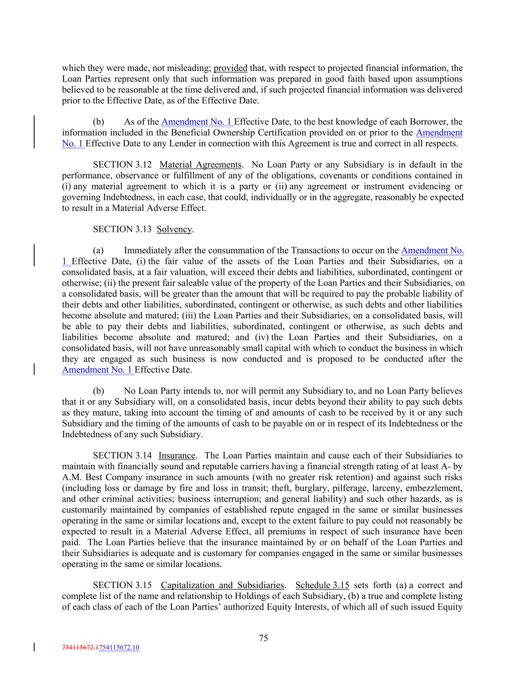 which they were made, not misleading; provided that, with respect to projected financial information, the Loan Parties represent only that such information was prepared in good faith based upon assumptions believed to be reasonable at the time delivered and, if such projected financial information was delivered prior to the Effective Date, as of the Effective Date. (b) As of the Amendment No. 1 Effective Date, to the best knowledge of each Borrower, the information included in the Beneficial Ownership Certification provided on or prior to the Amendment No. 1 Effective Date to any Lender in connection with this Agreement is true and correct in all respects. SECTION 3.12 Material Agreements. No Loan Party or any Subsidiary is in default in the performance, observance or fulfillment of any of the obligations, covenants or conditions contained in (i) any material agreement to which it is a party or (ii) any agreement or instrument evidencing or governing Indebtedness, in each case, that could, individually or in the aggregate, reasonably be expected to result in a Material Adverse Effect. SECTION 3.13 Solvency. (a) Immediately after the consummation of the Transactions to occur on the Amendment No. 1 Effective Date, (i) the fair value of the assets of the Loan Parties and their Subsidiaries, on a consolidated basis, at a fair valuation, will exceed their debts and liabilities, subordinated, contingent or otherwise; (ii) the present fair saleable value of the property of the Loan Parties and their Subsidiaries, on a consolidated basis, will be greater than the amount that will be required to pay the probable liability of their debts and other liabilities, subordinated, contingent or otherwise, as such debts and other liabilities become absolute and matured; (iii) the Loan Parties and their Subsidiaries, on a consolidated basis, will be able to pay their debts and liabilities, subordinated, contingent or otherwise, as such debts and liabilities become absolute and matured; and (iv) the Loan Parties and their Subsidiaries, on a consolidated basis, will not have unreasonably small capital with which to conduct the business in which they are engaged as such business is now conducted and is proposed to be conducted after the Amendment No. 1 Effective Date. (b) No Loan Party intends to, nor will permit any Subsidiary to, and no Loan Party believes that it or any Subsidiary will, on a consolidated basis, incur debts beyond their ability to pay such debts as they mature, taking into account the timing of and amounts of cash to be received by it or any such Subsidiary and the timing of the amounts of cash to be payable on or in respect of its Indebtedness or the Indebtedness of any such Subsidiary. SECTION 3.14 Insurance. The Loan Parties maintain and cause each of their Subsidiaries to maintain with financially sound and reputable carriers having a financial strength rating of at least A- by A.M. Best Company insurance in such amounts (with no greater risk retention) and against such risks (including loss or damage by fire and loss in transit; theft, burglary, pilferage, larceny, embezzlement, and other criminal activities; business interruption; and general liability) and such other hazards, as is customarily maintained by companies of established repute engaged in the same or similar businesses operating in the same or similar locations and, except to the extent failure to pay could not reasonably be expected to result in a Material Adverse Effect, all premiums in respect of such insurance have been paid. The Loan Parties believe that the insurance maintained by or on behalf of the Loan Parties and their Subsidiaries is adequate and is customary for companies engaged in the same or similar businesses operating in the same or similar locations. SECTION 3.15 Capitalization and Subsidiaries. Schedule 3.15 sets forth (a) a correct and complete list of the name and relationship to Holdings of each Subsidiary, (b) a true and complete listing of each class of each of the Loan Parties’ authorized Equity Interests, of which all of such issued Equity 75 754115672.1754115672.10
