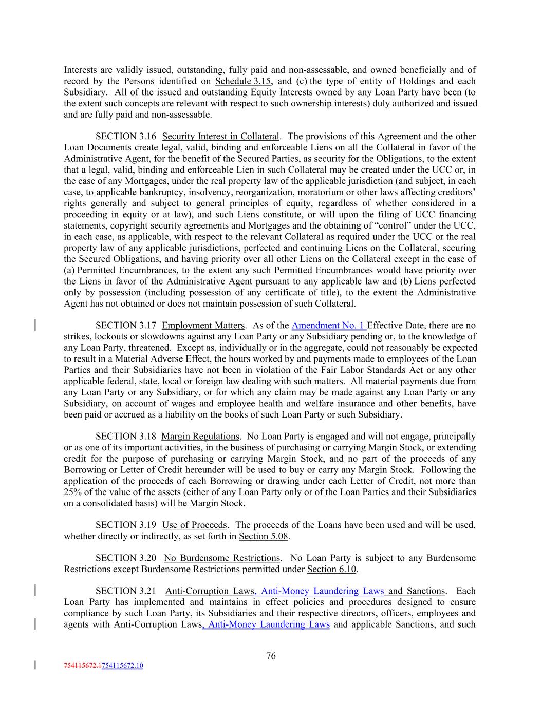 Interests are validly issued, outstanding, fully paid and non-assessable, and owned beneficially and of record by the Persons identified on Schedule 3.15, and (c) the type of entity of Holdings and each Subsidiary. All of the issued and outstanding Equity Interests owned by any Loan Party have been (to the extent such concepts are relevant with respect to such ownership interests) duly authorized and issued and are fully paid and non-assessable. SECTION 3.16 Security Interest in Collateral. The provisions of this Agreement and the other Loan Documents create legal, valid, binding and enforceable Liens on all the Collateral in favor of the Administrative Agent, for the benefit of the Secured Parties, as security for the Obligations, to the extent that a legal, valid, binding and enforceable Lien in such Collateral may be created under the UCC or, in the case of any Mortgages, under the real property law of the applicable jurisdiction (and subject, in each case, to applicable bankruptcy, insolvency, reorganization, moratorium or other laws affecting creditors’ rights generally and subject to general principles of equity, regardless of whether considered in a proceeding in equity or at law), and such Liens constitute, or will upon the filing of UCC financing statements, copyright security agreements and Mortgages and the obtaining of “control” under the UCC, in each case, as applicable, with respect to the relevant Collateral as required under the UCC or the real property law of any applicable jurisdictions, perfected and continuing Liens on the Collateral, securing the Secured Obligations, and having priority over all other Liens on the Collateral except in the case of (a) Permitted Encumbrances, to the extent any such Permitted Encumbrances would have priority over the Liens in favor of the Administrative Agent pursuant to any applicable law and (b) Liens perfected only by possession (including possession of any certificate of title), to the extent the Administrative Agent has not obtained or does not maintain possession of such Collateral. SECTION 3.17 Employment Matters. As of the Amendment No. 1 Effective Date, there are no strikes, lockouts or slowdowns against any Loan Party or any Subsidiary pending or, to the knowledge of any Loan Party, threatened. Except as, individually or in the aggregate, could not reasonably be expected to result in a Material Adverse Effect, the hours worked by and payments made to employees of the Loan Parties and their Subsidiaries have not been in violation of the Fair Labor Standards Act or any other applicable federal, state, local or foreign law dealing with such matters. All material payments due from any Loan Party or any Subsidiary, or for which any claim may be made against any Loan Party or any Subsidiary, on account of wages and employee health and welfare insurance and other benefits, have been paid or accrued as a liability on the books of such Loan Party or such Subsidiary. SECTION 3.18 Margin Regulations. No Loan Party is engaged and will not engage, principally or as one of its important activities, in the business of purchasing or carrying Margin Stock, or extending credit for the purpose of purchasing or carrying Margin Stock, and no part of the proceeds of any Borrowing or Letter of Credit hereunder will be used to buy or carry any Margin Stock. Following the application of the proceeds of each Borrowing or drawing under each Letter of Credit, not more than 25% of the value of the assets (either of any Loan Party only or of the Loan Parties and their Subsidiaries on a consolidated basis) will be Margin Stock. SECTION 3.19 Use of Proceeds. The proceeds of the Loans have been used and will be used, whether directly or indirectly, as set forth in Section 5.08. SECTION 3.20 No Burdensome Restrictions. No Loan Party is subject to any Burdensome Restrictions except Burdensome Restrictions permitted under Section 6.10. SECTION 3.21 Anti-Corruption Laws, Anti-Money Laundering Laws and Sanctions. Each Loan Party has implemented and maintains in effect policies and procedures designed to ensure compliance by such Loan Party, its Subsidiaries and their respective directors, officers, employees and agents with Anti-Corruption Laws, Anti-Money Laundering Laws and applicable Sanctions, and such 76 754115672.1754115672.10