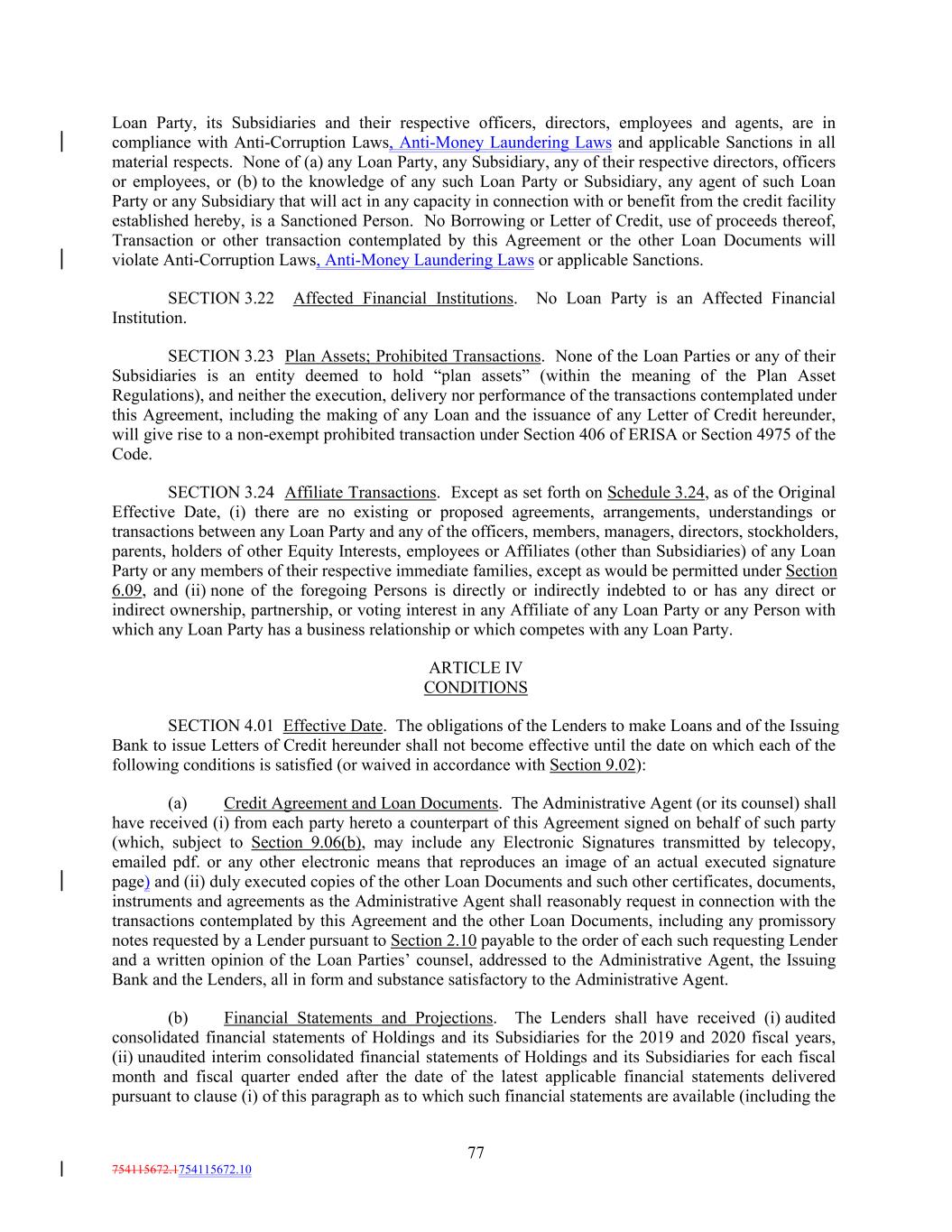 Loan Party, its Subsidiaries and their respective officers, directors, employees and agents, are in compliance with Anti-Corruption Laws, Anti-Money Laundering Laws and applicable Sanctions in all material respects. None of (a) any Loan Party, any Subsidiary, any of their respective directors, officers or employees, or (b) to the knowledge of any such Loan Party or Subsidiary, any agent of such Loan Party or any Subsidiary that will act in any capacity in connection with or benefit from the credit facility established hereby, is a Sanctioned Person. No Borrowing or Letter of Credit, use of proceeds thereof, Transaction or other transaction contemplated by this Agreement or the other Loan Documents will violate Anti-Corruption Laws, Anti-Money Laundering Laws or applicable Sanctions. SECTION 3.22 Affected Financial Institutions. No Loan Party is an Affected Financial Institution. SECTION 3.23 Plan Assets; Prohibited Transactions. None of the Loan Parties or any of their Subsidiaries is an entity deemed to hold “plan assets” (within the meaning of the Plan Asset Regulations), and neither the execution, delivery nor performance of the transactions contemplated under this Agreement, including the making of any Loan and the issuance of any Letter of Credit hereunder, will give rise to a non-exempt prohibited transaction under Section 406 of ERISA or Section 4975 of the Code. SECTION 3.24 Affiliate Transactions. Except as set forth on Schedule 3.24, as of the Original Effective Date, (i) there are no existing or proposed agreements, arrangements, understandings or transactions between any Loan Party and any of the officers, members, managers, directors, stockholders, parents, holders of other Equity Interests, employees or Affiliates (other than Subsidiaries) of any Loan Party or any members of their respective immediate families, except as would be permitted under Section 6.09, and (ii) none of the foregoing Persons is directly or indirectly indebted to or has any direct or indirect ownership, partnership, or voting interest in any Affiliate of any Loan Party or any Person with which any Loan Party has a business relationship or which competes with any Loan Party. ARTICLE IV CONDITIONS SECTION 4.01 Effective Date. The obligations of the Lenders to make Loans and of the Issuing Bank to issue Letters of Credit hereunder shall not become effective until the date on which each of the following conditions is satisfied (or waived in accordance with Section 9.02): (a) Credit Agreement and Loan Documents. The Administrative Agent (or its counsel) shall have received (i) from each party hereto a counterpart of this Agreement signed on behalf of such party (which, subject to Section 9.06(b), may include any Electronic Signatures transmitted by telecopy, emailed pdf. or any other electronic means that reproduces an image of an actual executed signature page) and (ii) duly executed copies of the other Loan Documents and such other certificates, documents, instruments and agreements as the Administrative Agent shall reasonably request in connection with the transactions contemplated by this Agreement and the other Loan Documents, including any promissory notes requested by a Lender pursuant to Section 2.10 payable to the order of each such requesting Lender and a written opinion of the Loan Parties’ counsel, addressed to the Administrative Agent, the Issuing Bank and the Lenders, all in form and substance satisfactory to the Administrative Agent. (b) Financial Statements and Projections. The Lenders shall have received (i) audited consolidated financial statements of Holdings and its Subsidiaries for the 2019 and 2020 fiscal years, (ii) unaudited interim consolidated financial statements of Holdings and its Subsidiaries for each fiscal month and fiscal quarter ended after the date of the latest applicable financial statements delivered pursuant to clause (i) of this paragraph as to which such financial statements are available (including the 77 754115672.1754115672.10